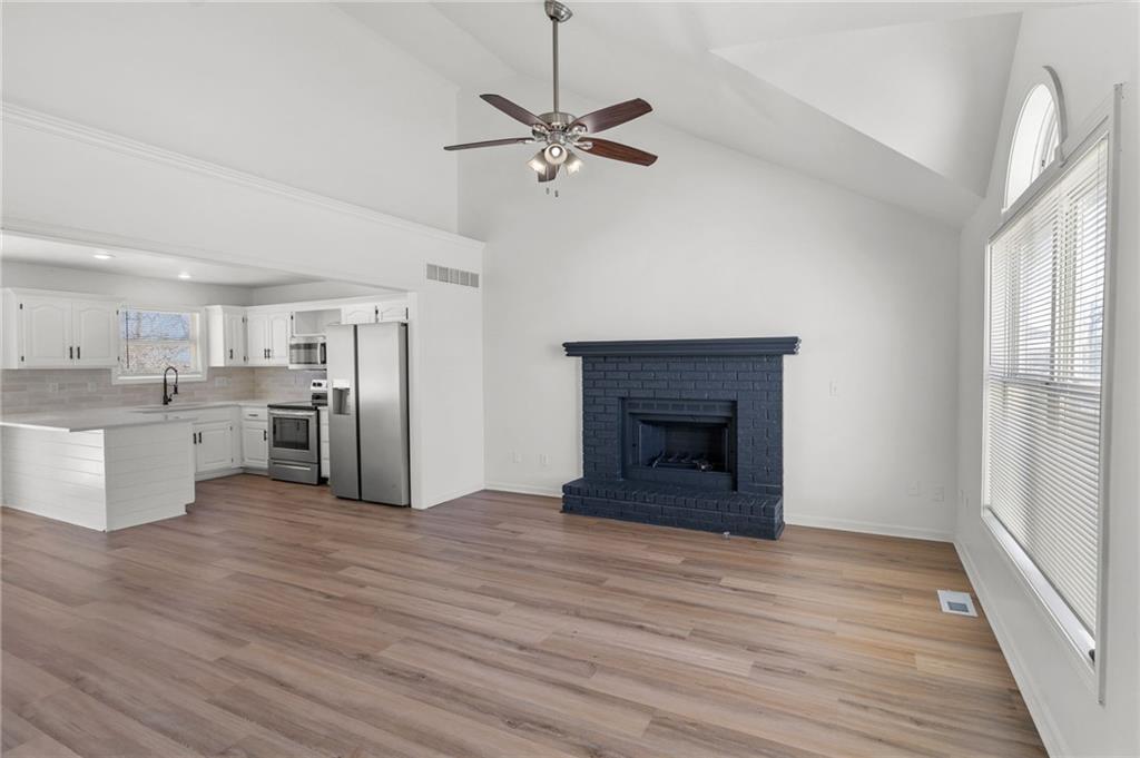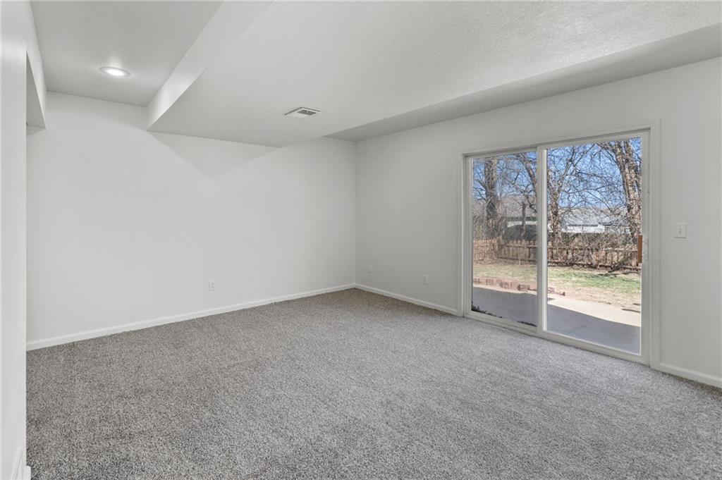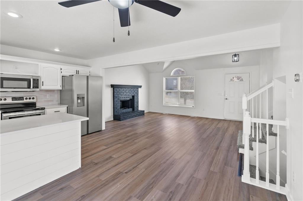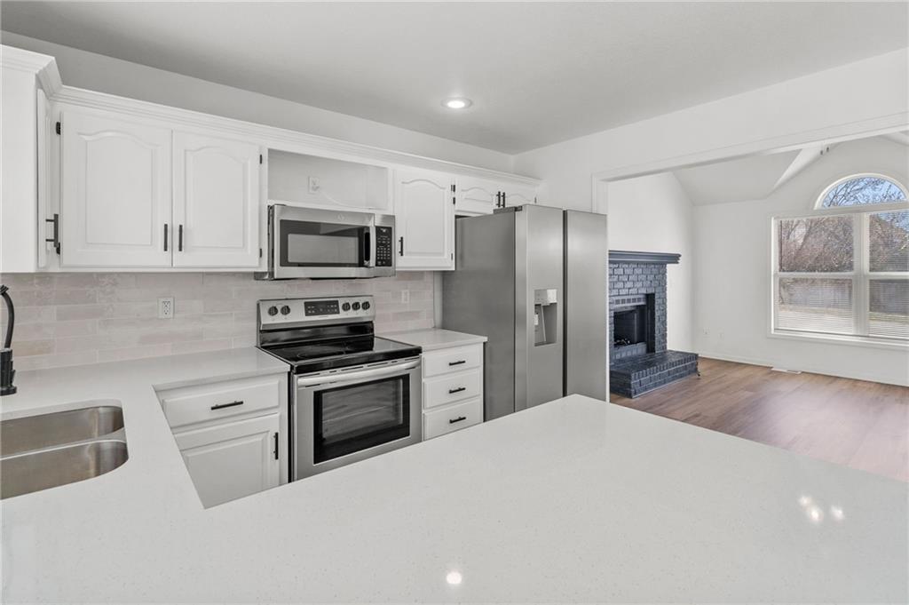 BEAUTIFULLY Updated and Move-in ready, this side-by-side split offers the perfect blend of modern finishes and functional living spaces. Main level welcomes you with a vaulted great room featuring a cozy fireplace, luxury vinyl flooring and an open layout ideal for everyday living and entertaining. Light-filled white kitchen shines with stainless steel appliances, quartz countertops and flows seamlessly into the dining area, where sliding doors lead to a spacious deck—perfect for indoor/outdoor gatherings. Upstairs, the primary suite boasts a private en-suite bath, while two additional bedrooms share a second full bath. Convenient bedroom-level laundry adds ease to your daily routine. The lower (garage-level) family room provides additional living space and walks out to a patio, offering another great spot to relax or entertain. A fourth bedroom in the basement adds flexibility for guests, a home office or workout space. Enjoy the fully fenced backyard and a fantastic location close to shopping, dining and quick highway access. JUST BRING YOUR DECOR AND MOVE RIGHT IN! WELCOME HOME!