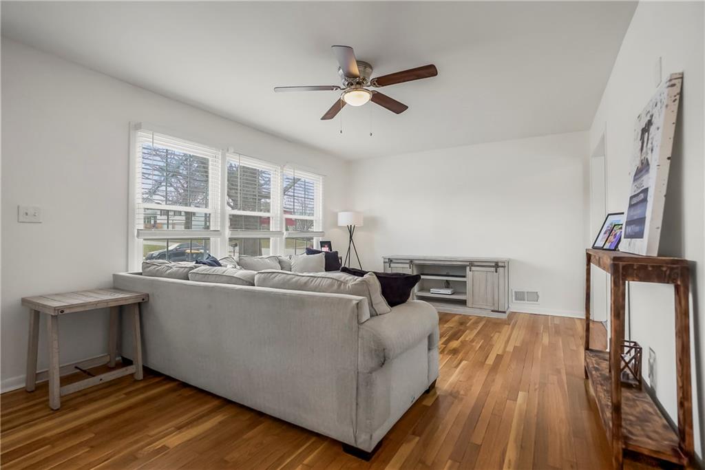Must See Stylish Ranch Home In the Heart of it All! Beautifully Maintained! This move-in-ready home features beautiful gleaming hardwood floors with large floor to ceiling windows pumping natural light throughout the home! The updated kitchen offers white shaker cabinetry, quartz countertops, stainless steel appliances, and a subway tile backsplash. Enjoy a spacious living room and a bright eat-in dining area overlooking the wrap deck and green space. The unfinished basement offers great storage or future finishing potential. Step outside to a large backyard with an elevated wrap deck, perfect for relaxing or entertaining guests. So much to enjoy with main components of the home being in newer condition roof, HVAC, plumbing, electrical, etc. move in and enjoy! Conveniently located near shopping, dining, and highway access!