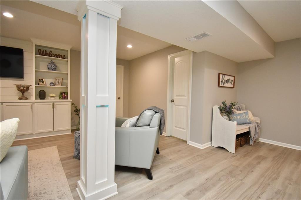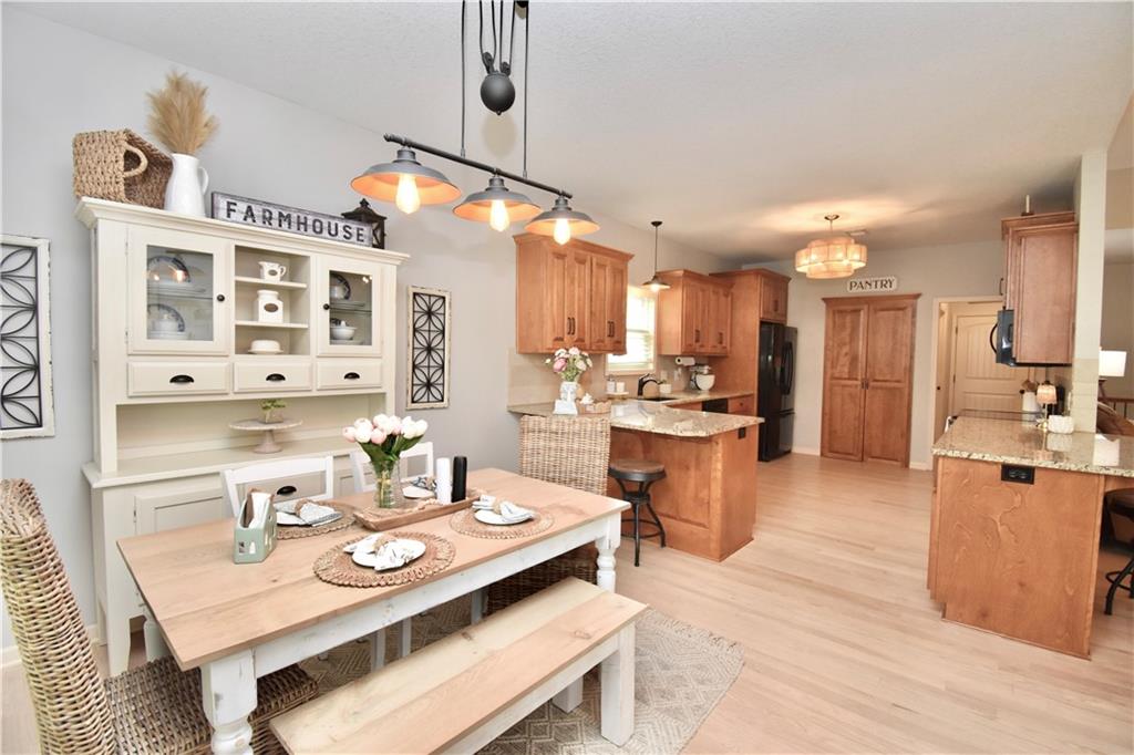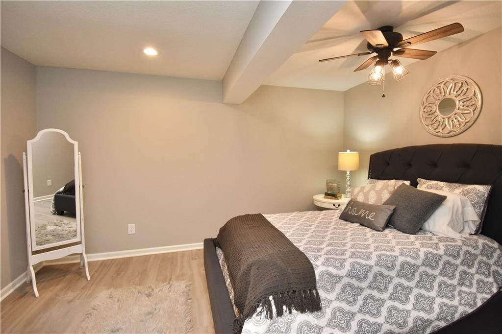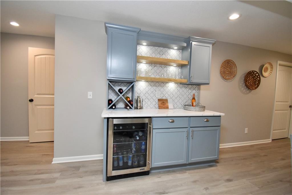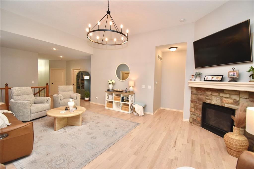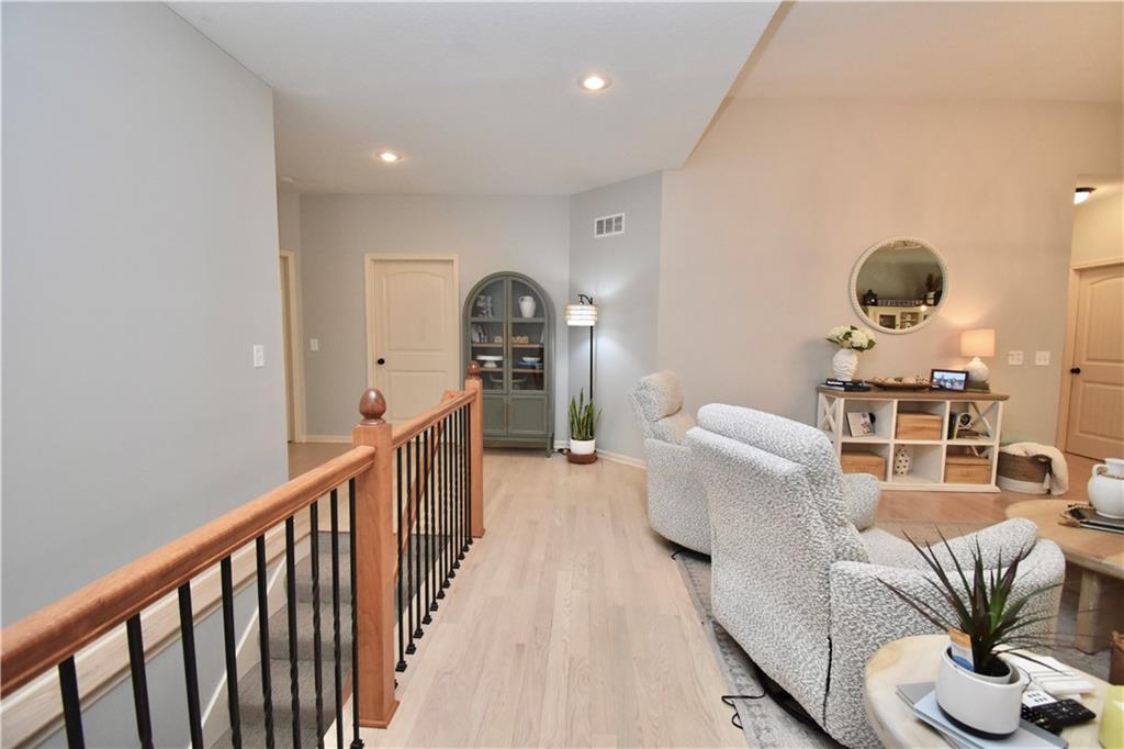 Beautifully updated reverse 1.5 Story on a quiet cul-de-sac in Liberty w/CRAZY LOW HOA fees of JUST $67/month! This well-maintained, 10-year-old home offers approximately 2,600 sq ft of finished living space plus aprox. 900 sqft in the lower level. Seller spent $80,000+ in upgrades completed in the past two years. HOME Designed for easy main-level living, this home features zero-entry access, wider doorways, & low-profile step-in showers. Open floor plan showcases fresh interior paint, new hardwood floors, natural color, throughout the entry, living, dining, and kitchen areas, and a stylish board-and-batten accent wall, refrigerator stays! Kitchen is both functional and inviting with a granite peninsula island, full-extension drawers, pull-out shelving, and all-new lighting. The primary suite offers a spa-like retreat with a fully remodeled bathroom featuring Carrara marble finishes, frameless glass shower, tiled floors, and trendy built-in shelving. The main level includes a total of two bedrooms, a second full bath with linen closet, and a spacious laundry room with additional storage. All new Lighting, new stair carpet, & carpet in 1 bdrm. The recently finished lower level expands the living space w/luxury LVP flooring, large family room w/custom built-ins, a stunning 7-foot bar w/Carrara marble, two additional bedrooms (one non-conforming), walk-in closets, a full bathroom & plentiful storage space. Enjoy nearly 400 sq ft of outdoor living space, including a covered patio and extended paver patio with a lighted sitting wall—perfect for relaxing or entertaining—backing to a private tree-line w/ frequent wildlife & beautiful sunsets. HOA does allow fencing! Ideally located just minutes from Liberty Hospital, I-35, 291, and 152, offering quick access to downtown Kansas City and KCI Airport. Maintenance-provided community includes lawn care and snow removal for ONLY $67.00 A Month! HOA has SURPLUS! balance! Liberty School District! Sellers closing date is FLEXIBLE!