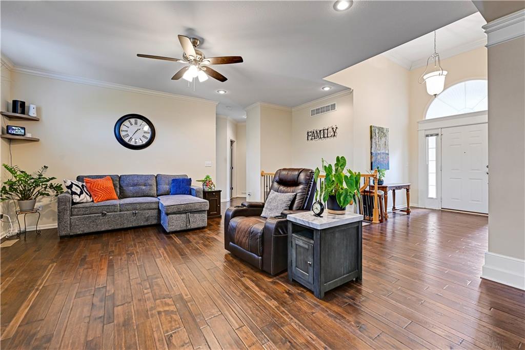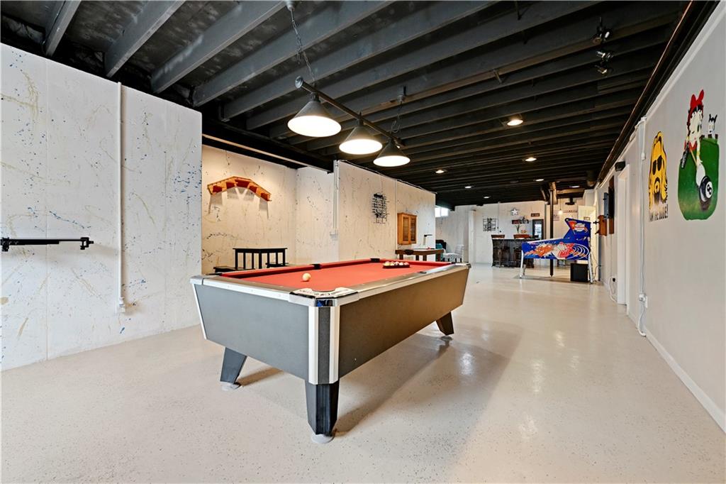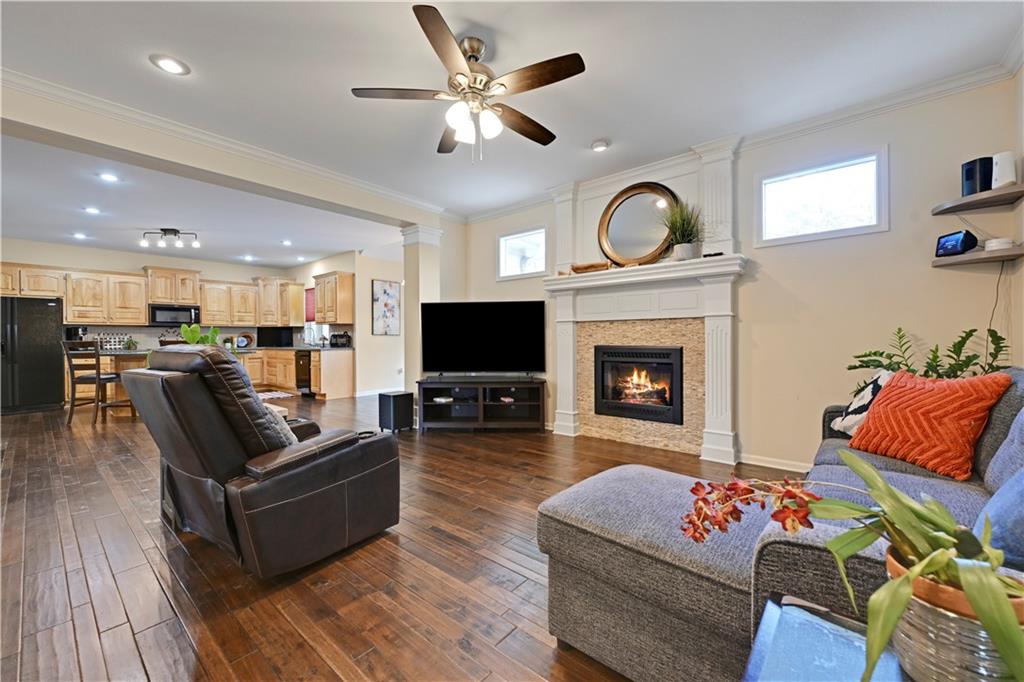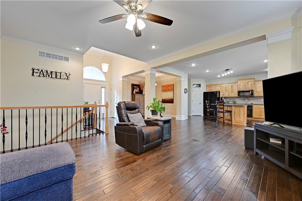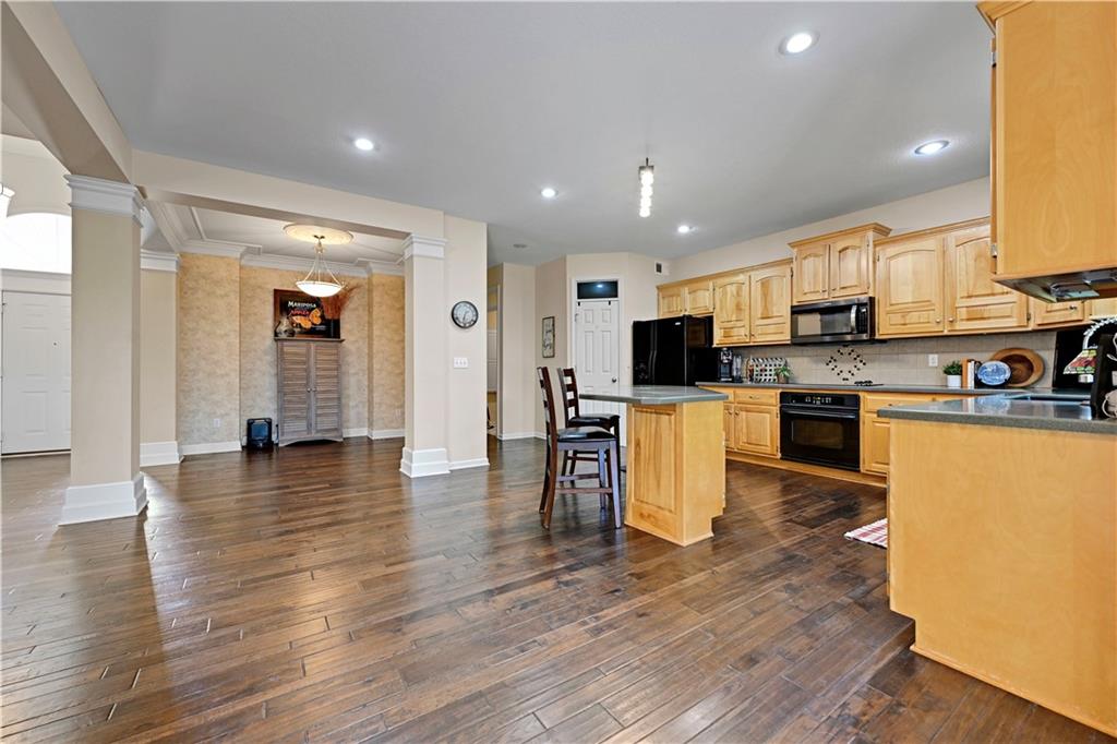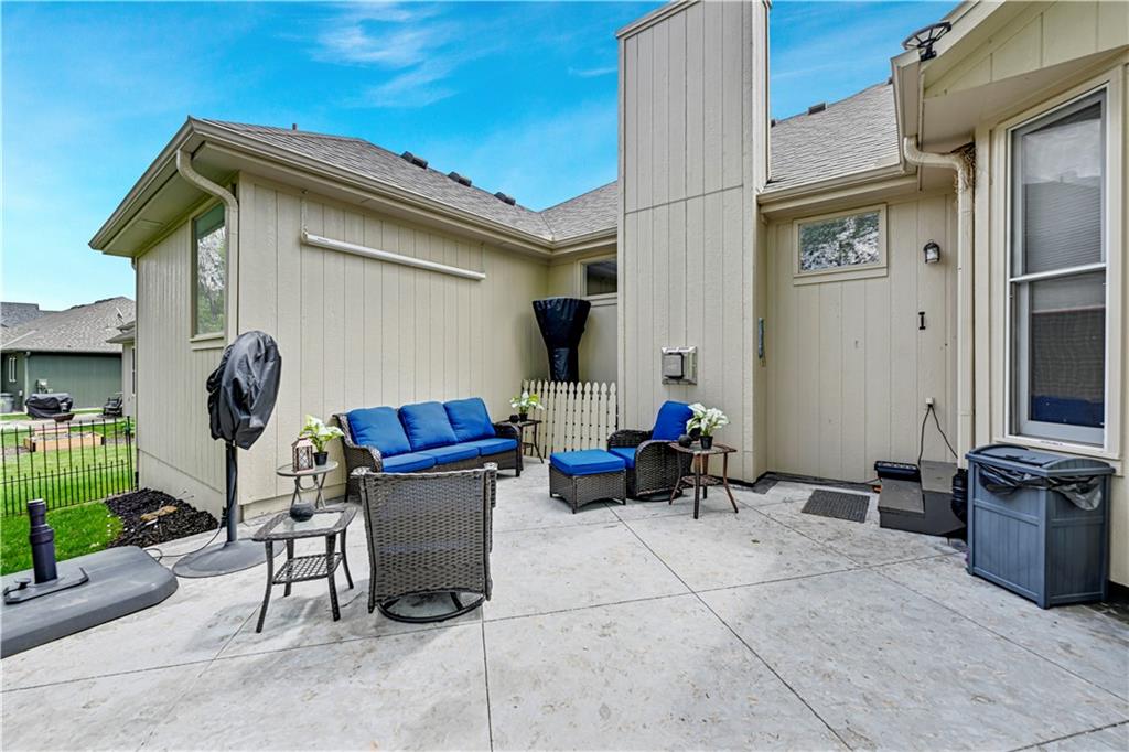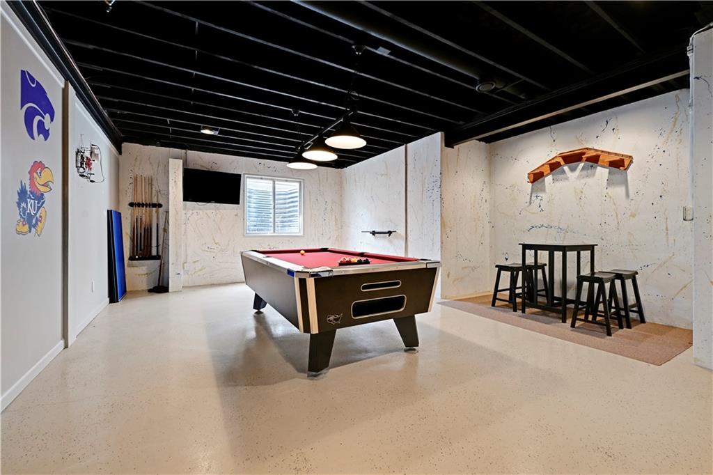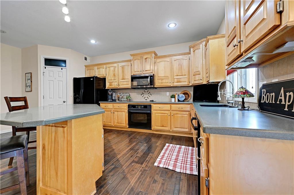Charming ranch in desirable Rockwood Estates just a short golf cart ride to Paola Country Club. This spacious home offers easy main-level living with an open, light-filled layout and hardwood floors throughout the entire main level. The kitchen features abundant cabinetry, an oversized breakfast bar, walk-in pantry, and a window overlooking the backyard for great natural light. It opens to the living space and sunny breakfast nook, with a formal dining room just off the main area. The great room is spacious and inviting with a cozy gas fireplace. The main-level primary suite includes tray ceilings, and a spa bath with double vanities, and a walk-in tub. Two additional bedrooms and a full bath are also on the main level. The finished lower level offers great entertaining space with room for a family room, rec area, and half bath—pool table, ping pong, pinball, and air hockey all stay. Enjoy the low-maintenance stamped concrete patio and fenced backyard, with additional yard space extending beyond the fence line. Located in a golf course community with walking trails and a neighborhood playground, this home offers both comfort and lifestyle.
