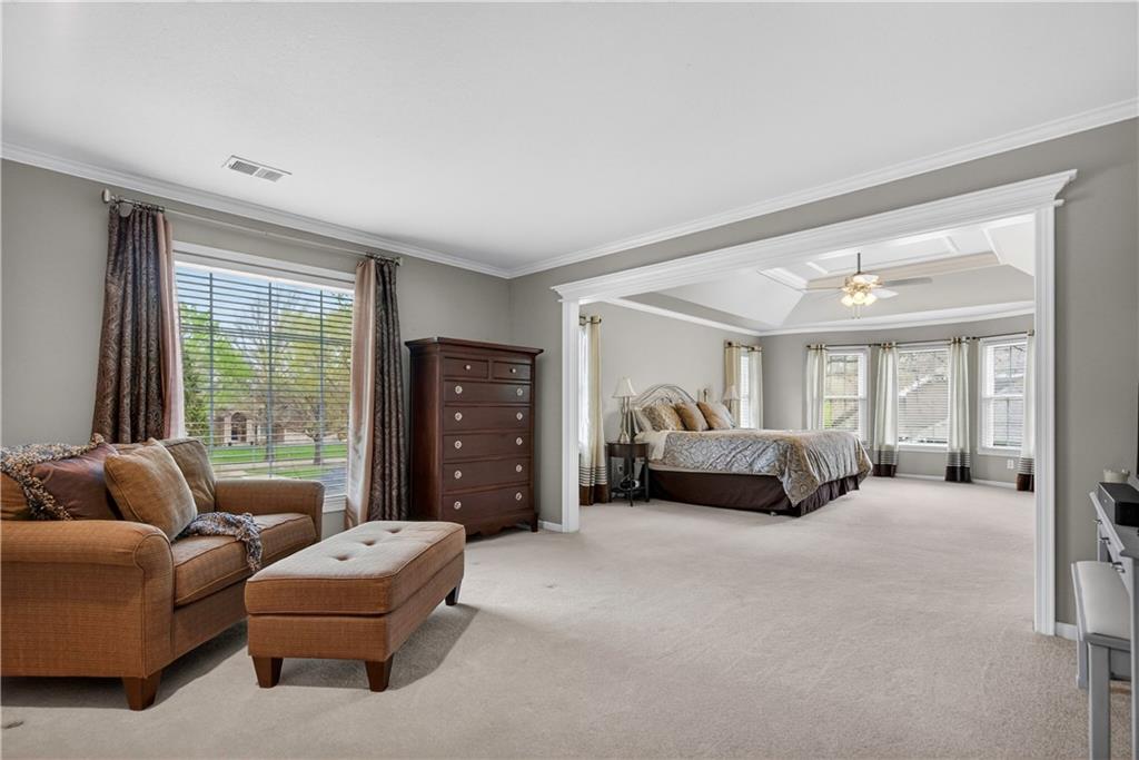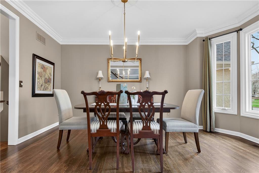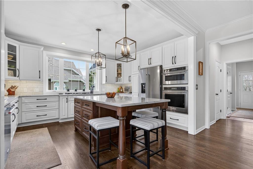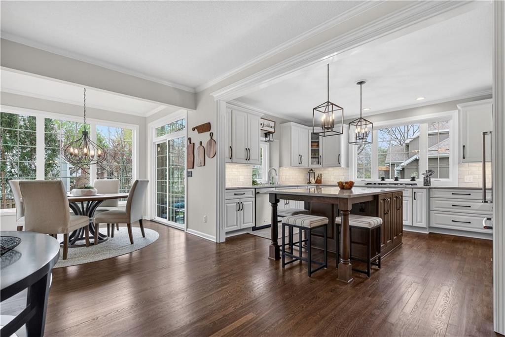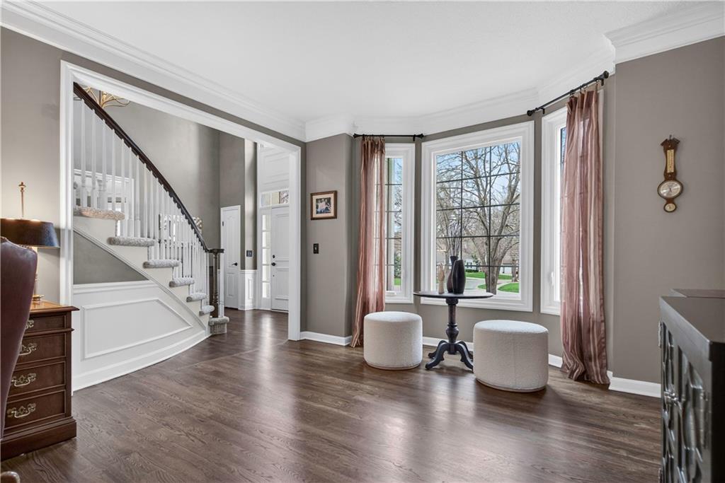 Welcome to this expanded Koehler two-story plan, a home that truly does not disappoint. From the impeccable curb appeal to the sweeping front staircase featuring gleaming hardwoods and designer carpet, every detail has been thoughtfully curated. Arch detailing, intricate moldings and lots of custom-built ins. The heart of the home is a fully remodeled gourmet kitchen, boasting high-end appliances (5 burner gas cook top, double ovens and convection microwave) custom cabinetry, a large center island, and gorgeous quartzite countertops & large pantry. Nearby, the cozy hearth breakfast room features a handsome fireplace with an impressive walnut live-edge wood mantle, w/ 2nd staircase to the second flr., while the gracious great room, formal living room, and dining rooms provide an ideal layout for elegant entertaining. The luxurious, completely remodeled primary suite serves as a true sanctuary, equipped with an oversized walk-in shower, free-standing floor mounted tub, new cabinetry, and high-end tile, all adjacent to a massive sitting room perfect for relaxation and huge closet. Generous secondary bedrooms provide ample space for family or guests. The incredible finished lower level adds significant living space with a useful bar, recreation room, game area, and a fifth non-conforming bedroom and bath, plus plenty of storage. Practical upgrades abound, including gleaming hardwood floors throughout the1st floor (refinished in 2024) new energy efficient low E windows, new roof and gutters (2024) and dual-zoned HVAC. Outside, a charming stamped concrete patio overlooks a fully fenced and lushly landscaped lot with mature trees and a three-car side-entry garage. Located on a picturesque, tree-lined street in the desirable Waterford neighborhood, this storybook colonial feeds into award-winning Blue Valley schools and is just minutes from the premier shopping and dining at Town Center.You won't want to miss this exceptional and well-kept residence!W/D &Pool Table to Stay