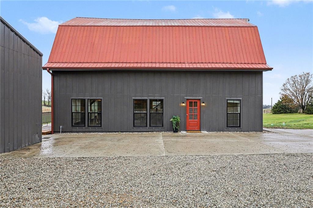 Experience the perfect marriage of turn-of-the-century character and cutting-edge luxury in this stunning 1900 barn conversion! Situated on 4.75 private acres, a half-hour from KC International airport, this three-story masterpiece has been meticulously reimagined into a sophisticated four-bedroom, five-bathroom retreat that defines "one of a kind." The main level anchors the home with a chef’s dream kitchen. Designed for both high-function and high-style with premium GE Café appliances and professional-grade finishes. With warm pine accents that nod to the structure's historic roots, an expansive layout flows effortlessly into the first of two distinct living areas. Ascend to the second floor to find a spectacular lofted great room. This massive secondary living space is the ultimate "game-day" destination, complete with a dedicated wet bar and a layout designed for large-scale entertaining or quiet relaxation. The primary suite is a masterclass in convenience and comfort, offering dual walk-in closets and integrated secondary washer/dryer hookups, ensuring laundry day is effortless. Spa-like finishes that create a true sanctuary. The beauty of the 4.75-acre lot is pulled indoors through thoughtful design, but the outdoor features are equally impressive. After a day exploring the grounds, use the outdoor shower to rinse off while overlooking the serene pond—perfect for keeping both owners and pets clean. A 42x30 outbuilding provides ample space for a workshop, studio, or equipment storage. This isn't just a home; it's a piece of history updated for the modern connoisseur with Smithville Lake, shopping and dining less than 20 minutes down the road. Schedule your private tour today to experience the scale and craftsmanship of this rural luxury estate!