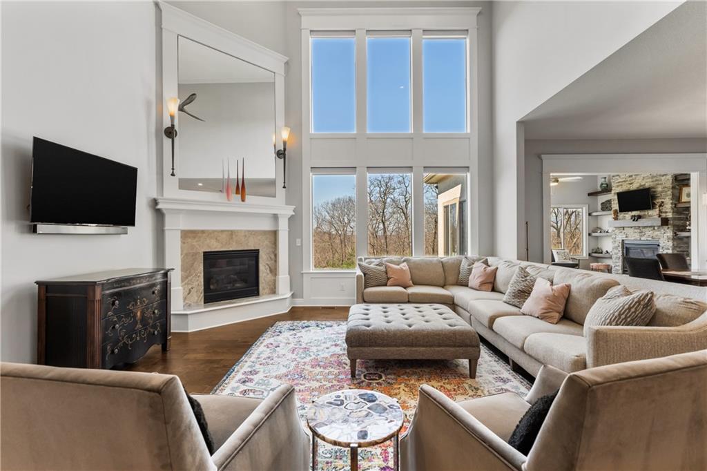 Located in the desirable River Ridge Farms West subdivision, this exceptional home is framed by beautifully landscaped grounds and a welcoming front façade that radiates elegance. Set on an estate lot (over half an acre) with open rear views, the home offers privacy and tranquil sunset vistas. A formal dining room off the entry flows seamlessly into the open two-story great room, filled with natural light and anchored by a striking corner fireplace, creating a warm and inviting atmosphere. The chef’s kitchen features granite countertops, a marble backsplash, Thermador double wall ovens, ample cabinet and counter space, and a walk-in pantry. An adjacent dining area opens to a grill deck, perfect for effortless outdoor entertaining, and leads directly into a sunroom with a floor-to-ceiling stone fireplace and built-in shelving—a cozy retreat for morning coffee or relaxing any time of day. The primary suite is a serene haven with tray ceilings and abundant natural light. Its ensuite bath includes double vanities, a soaking tub, and a separate walk-in shower with dual shower heads. Spacious secondary bedrooms each feature their own private bathrooms, and two laundry rooms make daily living convenient. The expansive finished walkout lower level offers versatile living space with a rec room, wet bar, an additional bedroom, and full bathroom. Step outside to a patio overlooking the large backyard, ideal for relaxing or entertaining. A circular driveway provides easy access, and the 4-car garage with extended storage accommodates vehicles, bikes, and more. Located in the highly sought-after Blue Valley School District, this home offers easy highway access and is conveniently close to shopping, dining, and less than 5 minutes to Aubrey Vineyards. Your lifestyle of tranquility and comfort awaits.