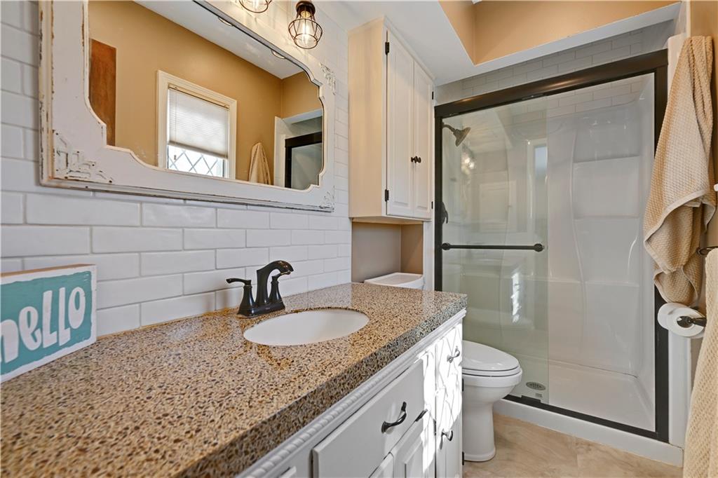 You’ll want to hurry on this one! This beautifully maintained 4BR, 3BA side/side split sits on a stunning ½+ acre lot in the heart of Overland Park & move-in ready. Lovingly cared for by its current owners, this home features thoughtful updates thruout. The kitchen has been reimagined w/new flooring, painted cabinetry—including open shelving and lighted glass-front cabinets—plus a newer stove & added can lighting for a bright, modern feel. Main level has been opened up to create a seamless, inviting space perfect for everyday living & entertaining, complemented by beautifully refinished hardwood floors. 3BR's are conveniently located on the same level, all featuring hardwood flooring. The primary suite, situated at the front of the home, offers an updated en suite w/solid surface vanity & custom-designed closet system for optimal storage. The hall bath has also been refreshed w/updated vanity & lighting & serves the addl BR's. The 4thBR, located just half a level up, provides added privacy & includes its own updated en suite bath w/shower—ideal for guests, home office, or private retreat. The LL has been transformed into a versatile space featuring a cozy TV/play area, bar area & dedicated exercise space with rubber mat flooring. You’ll also find the laundry room here, complete with a convenient utility sink. Storage is abundant throughout, including easy attic access off the fourth bedroom. Step outside and prepare to be impressed. The expansive, fenced backyard is a rare find, offering endless possibilities. Custom built TV cabinet is in place to enjoy the patio, or gather on the multi-level deck (with BONUS roll-out storage) that beautifully wraps around a mature tree—creating a one-of-a-kind outdoor entertaining space. The backyard also features a charming outbuilding, swingset, and permanent picnic table—all of which stay with the home. Whether you envision a garden, pool, sports area, or all of the above, there is room to make it your own.