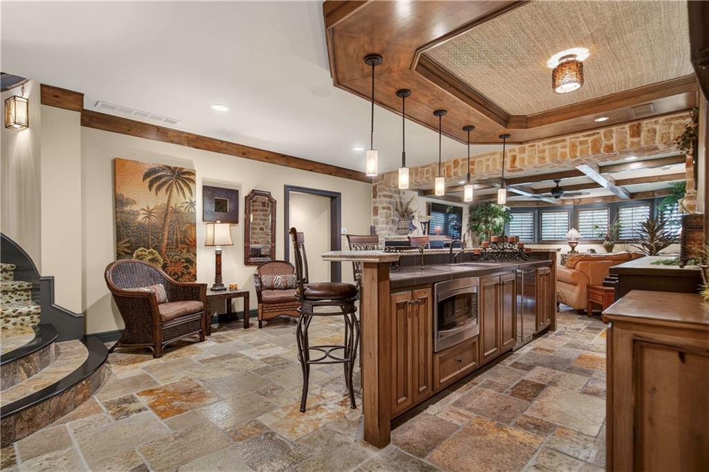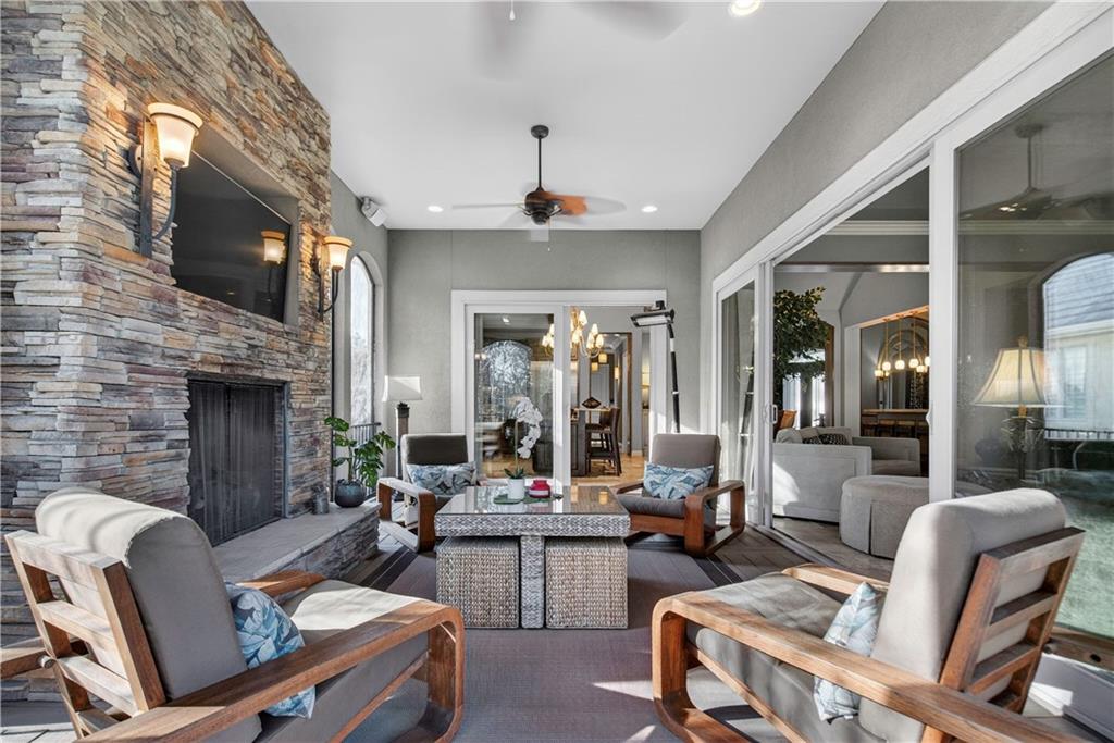 Step into the original & iconic Clydesdale floor plan -The blueprint for one of Johnson County's most sought-after luxury layouts. Built by Willis Custom Homes as the builder's personal residence, this home offers over 5300 sqft of elevated detail & finish, setting the benchmark that dozens of luxury home builders across Johnson County have followed for more than a decade. The craftsmanship, materials, & construction quality simply cannot be replicated anywhere close to this price point today. Rich stained woodwork and natural stone tile floors on main and lower level create a warm, welcoming ambiance from the moment you enter. Designed with both architectural elegance and everyday livability in mind, the main level is an entertainer’s dream, complete with a wet bar where family and friends naturally gather. Great room and kitchen open to a spacious screened outdoor room with stone fireplace, plus mid-level grilling deck overlooks a stamped concrete patio, creating a seamless indoor/outdoor experience. Lower level is designed for unforgettable entertaining, featuring a large sports bar, home theater, stone fireplace and accent walls, plus generous seating for game days or movie nights. Three additional ensuite bedrooms are located downstairs, along with a dedicated workout room and additional storage beneath the suspended garage. Systems in this amazing home match the finishes and include updated Control-4 whole-house audio/video/security, with 15 TVs (included), 3-zone HVAC with humidifiers, whole-house water filtration, plantation shutters throughout, and a lower courtyard stubbed for hot tub. The warmth, craftsmanship & details that make this home truly special simply can't be captured in photos or words, and we welcome you to experience it in person. The Villas of Whitehorse is a maintenance-provided community --lawn care/snow removal included, with access to neighborhood pool, clubhouse, & tennis courts. Sellers are licensed Real Estate Agents in Kansas.