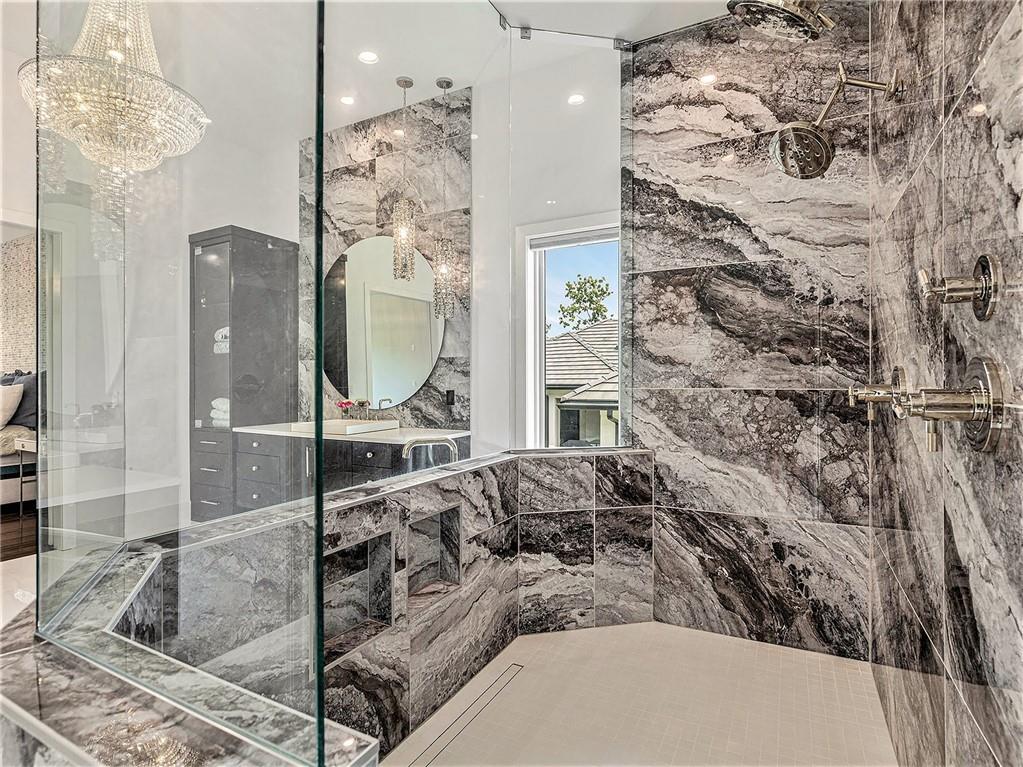 STUNNING. ELEGANT. EXTRAORDINARY. This nearly new Timber Rock Community showpiece is a true custom luxury build! A grand dual staircase and 3-tier custom crystal chandelier set the tone the moment you walk in, leading into a modern, light-filled living area with an 8-by-18-foot porcelain marble feature wall and a breathtaking 2-tier crystal chandelier. The chef-inspired kitchen is an entertainer’s dream, with a 5x10 leathered granite island, JennAir Pro appliances, a separate prep kitchen, and a huge pantry flowing seamlessly to an oversized crystal-lit dining area and covered lanai with a stone fireplace—perfect for unforgettable dinner parties, game days, and holidays. Your main-floor primary retreat feels like a five-star spa, offering an indulgent bath with oversized dual shower, soaking tub, and an expansive custom closet. Exquisite tilework, custom dual vanities, 5-foot circular mirrors, and crystal chandeliers create a jaw-dropping sanctuary, completed by a large 3-tier closet with two built-in chests. Upstairs, three spacious bedrooms with designer accent wallpaper—each with its own ensuite bath—ensure every guest or family member enjoys a private, boutique-hotel experience. The newly finished lower level is an entertainer’s paradise, with a wide-open living area, dedicated dining space, and a wet bar, all illuminated by a wall of windows overlooking green space; two extra-large bedrooms (ideal for an exercise room or private office) share a beautifully tiled full bath, and a generous wine room becomes the centerpiece for tastings and celebrations. Sliding doors lead to a large patio and lush green space expanding your living area outdoors, ideal for morning coffee and casual evenings. An oversized angled 4-car garage, large mudroom, and extra-spacious laundry loaded with custom cabinets and counters provide the everyday functionality that makes luxury living effortless. Buyer’s agent to verify square footage, schools, and taxes.
