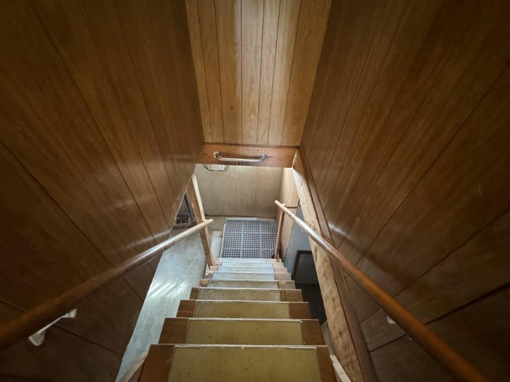 Stairway featuring wooden ceiling and wood walls