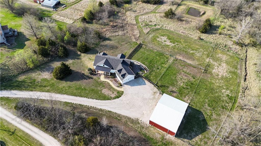 Just 30 minutes south of Overland Park, this peaceful retreat near Hillsdale Lake is your DREAM country property! Built in 2018, the reverse 1.5 story home STILL FEELS NEW with high quality finishes and lots of windows that capture the incredible views. Almost 8 private acres that adjoin the Army Corps of Engineer's land offer with a stocked shared pond on the north end of the property that is the perfect fishing spot. The nearby Hillsdale Lake trail system is over 50 acres and perfect for nature lovers or horse riding. A 54'x30' outbuilding with power and water has stalls for livestock or horses. Inside you'll find an open floorplan with 2 main level bedrooms and 2 more bedrooms in the walk-out lower level. Gorgeous kitchen with farmhouse sink and walk in pantry opens to the lovely hearth room living and dining rooms. Laundry room off the kitchen with extra storage. A dreamy screened in porch is the perfect spot to relax and take in the serene views of wildlife. The main level primary suite with a large walk in closet is a fabulous retreat. The lower level has a kitchenette and a large rec space and it’s own screened in porch. Take the cleared trail down to the lake that is shared by just a few other properties that touch it. Several fenced areas for riding or grazing. This property must be seen to be appreciated...don't miss it!