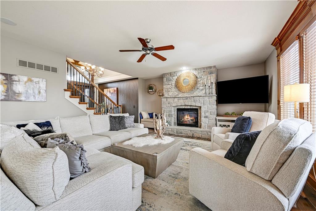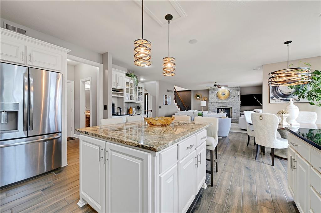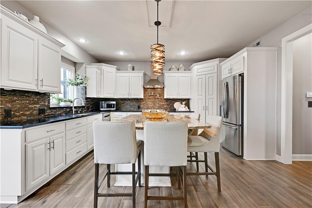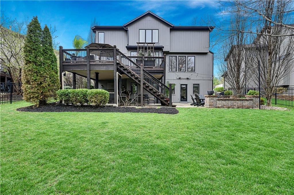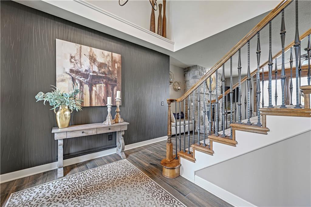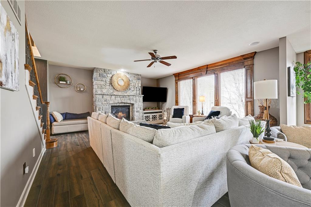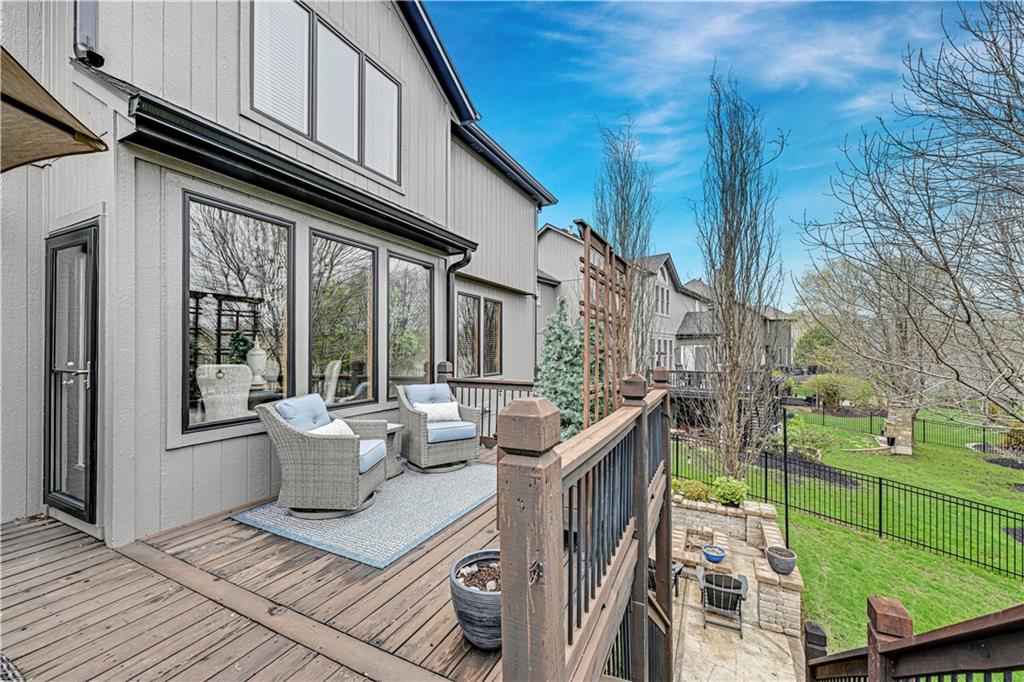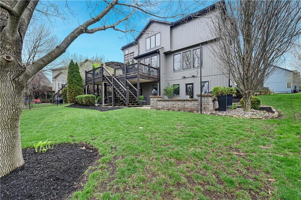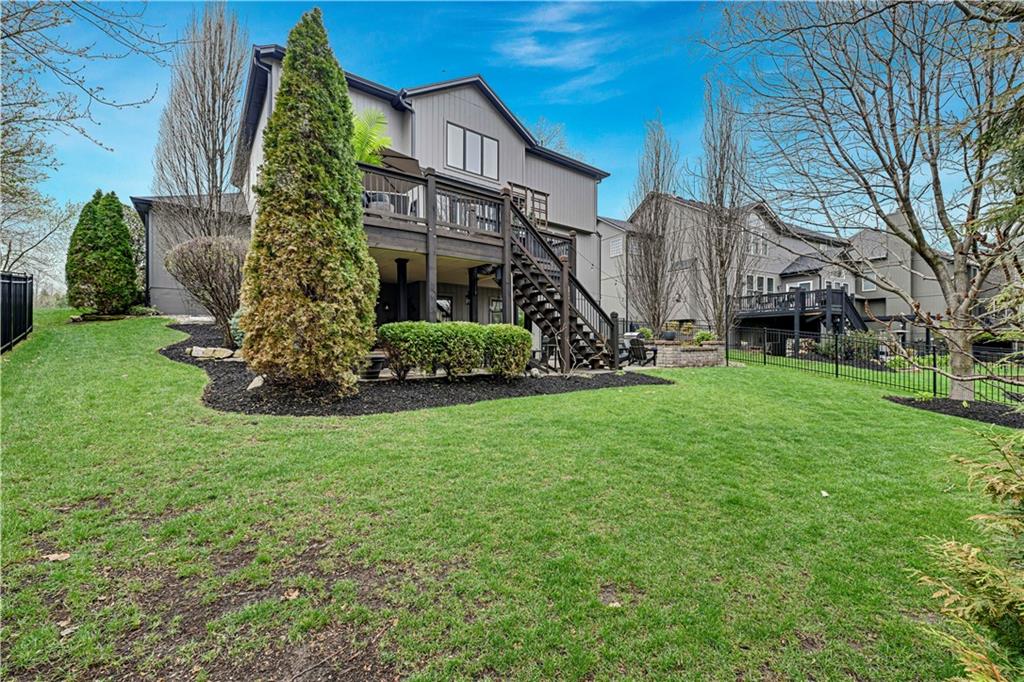 The most perfect Two Story on .23 Acres, fenced except for two short sides at front. Meticulously maintained by Original owners. Walkout basement with almost 9 foot ceilings, granite bar for entertaining, 4th full bath, fireplace and lots of storage. New roof less than 2 years ago, and new exterior paint, Engineered Hardwoods thru main floor, granite island in eat-in kitchen, 1/2 bath on main, formal dining room, fireplace in Great room, walk out the kitchen to gorgeous deck overlooking stunning landscaped backyard with 2 different patios for entertaining, Covered porch, 4 bedrooms on second level with 3 full baths, walk-in shower in Primary bath, large walk-in closets. New Energy efficient Garage Doors, New paint throughout interior. Blue Valley Schools, great Highway access, neighborhood pool, trails, play area, and stocked fishing pond. You'll love it!