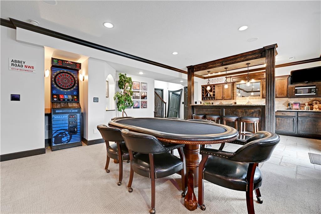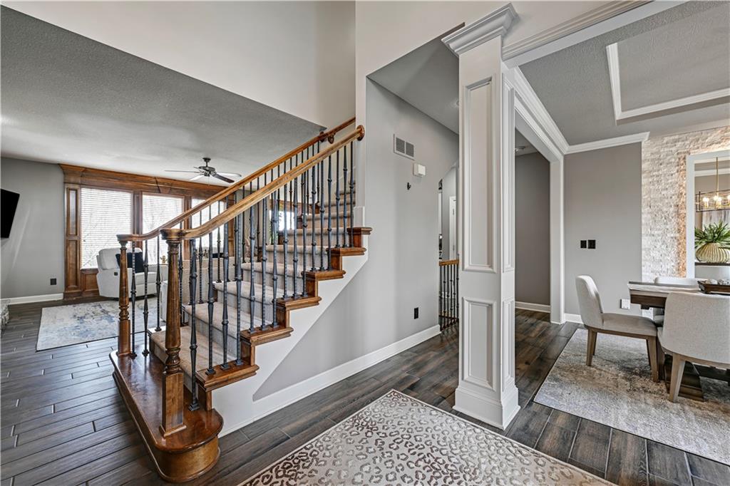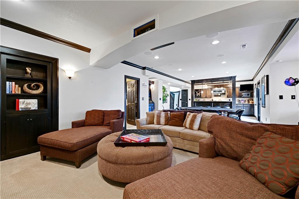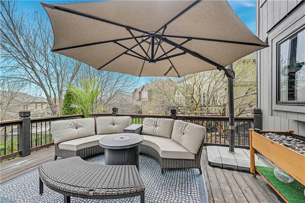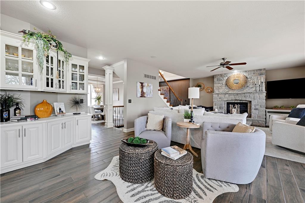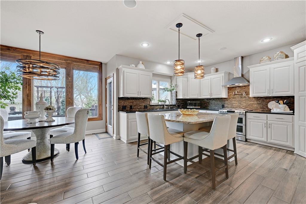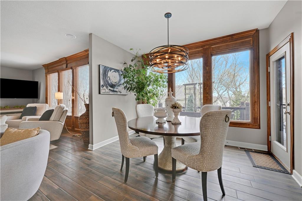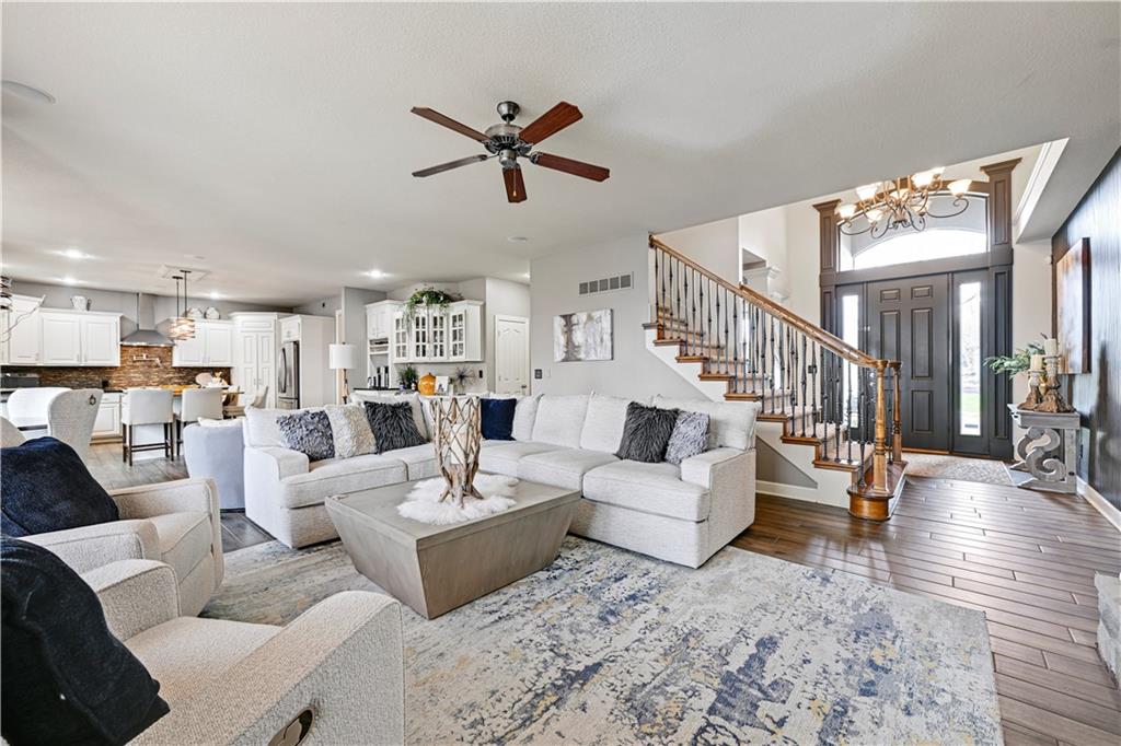 The most perfect Two Story on .23 Acres, fenced except for two short sides at front. Meticulously maintained by Original owners. Walkout basement with almost 9 foot ceilings, granite bar for entertaining, 4th full bath, fireplace and lots of storage. New roof less than 2 years ago, and new exterior paint, Engineered Hardwoods thru main floor, granite island in eat-in kitchen, 1/2 bath on main, formal dining room, fireplace in Great room, walk out the kitchen to gorgeous deck overlooking stunning landscaped backyard with 2 different patios for entertaining, Covered porch, 4 bedrooms on second level with 3 full baths, walk-in shower in Primary bath, large walk-in closets. New Energy efficient Garage Doors, New paint throughout interior. Blue Valley Schools, great Highway access, neighborhood pool, trails, play area, and stocked fishing pond. You'll love it!