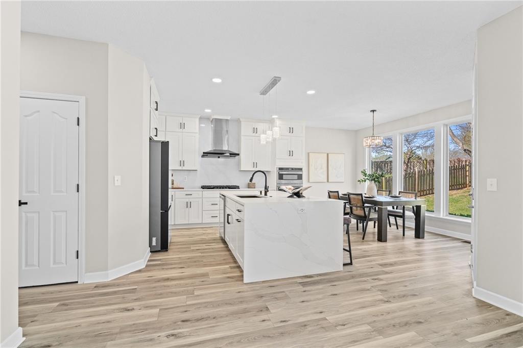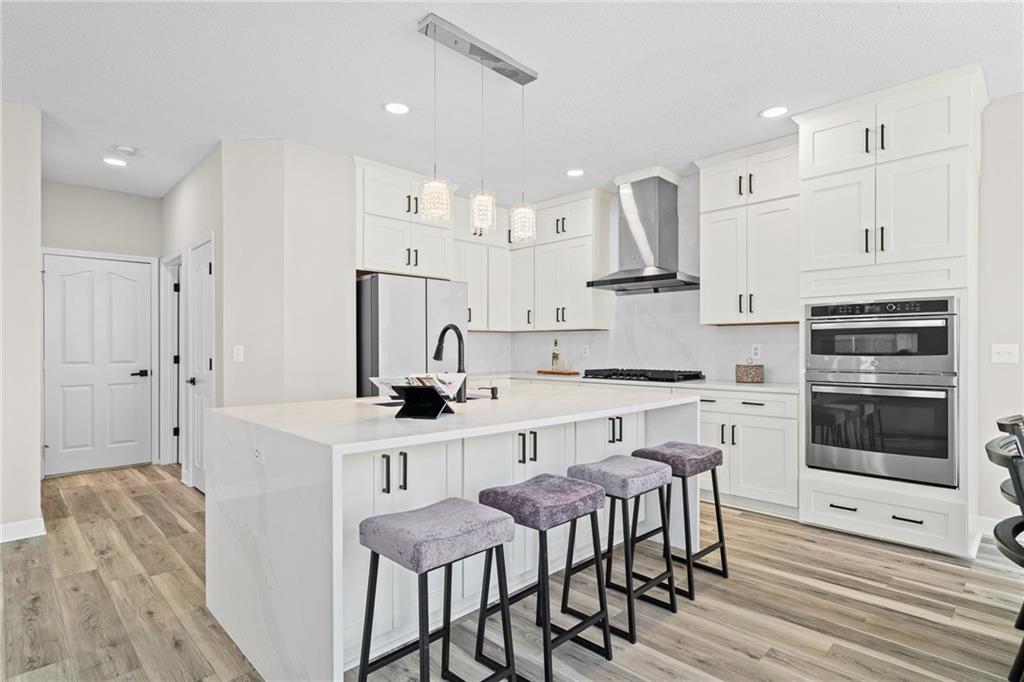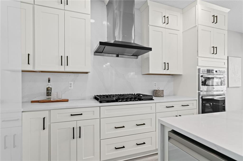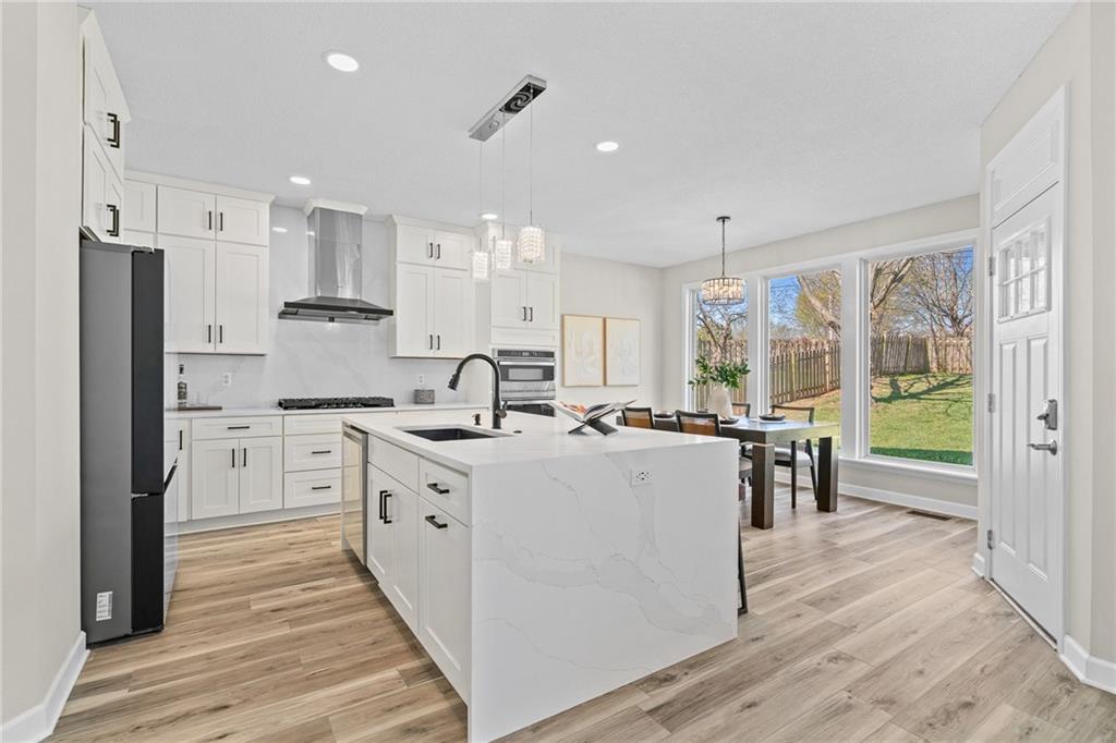 Completely reimagined inside and out, this Shawnee home offers the rare chance to move into a space that already feels brand new. Nearly every surface has been refreshed or redesigned to create a home that feels cohesive, elevated, and truly move-in ready. The kitchen sets the tone for the entire home, anchored by a stunning wrap-around waterfall-edge marble island with matching marble backsplash. Soft-close cabinetry, oversized sink with touchless faucet, and a premium appliance package including Samsung Bespoke refrigerator and dishwasher, 36-inch Frigidaire gas cooktop, Fotile range hood, and GE double wall oven with built-in microwave bring both style and function together beautifully. Updated flooring, baseboards, and fresh paint continue the polished feel throughout the main level. Upstairs features brand new flooring throughout, fresh paint, an expanded primary closet, and an updated primary bathroom with marble tile flooring, walk-in shower with sliding glass doors, and double-sink vanity with soft-close cabinetry. The finished basement lives like a natural extension of the home with marble tile flooring, a beautifully updated full bathroom, new lighting, fresh paint, hardwood stairs with updated handrails, and a flexible space ready for a guest suite, workout room, or second living area. Located in one of Shawnee’s most convenient areas near parks, trails, shopping, dining, and highway access, homes with this level of renovation rarely come available.