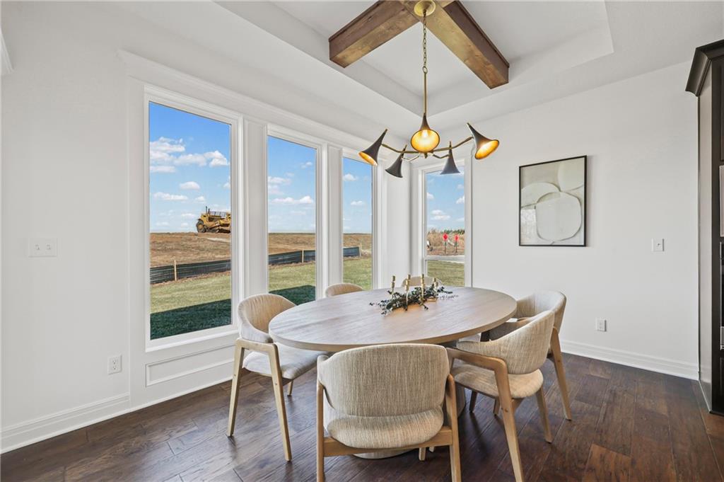 Welcome to this stunning custom home in Little Blue Estates, where modern design meets everyday functionality. Situated on a spacious corner lot, the home offers striking curb appeal w/ board & batten siding, stone accents, a 3 car side entry design for generous parking, plus a welcoming covered entry. Zero entry design makes this true ranch home easily accessible -- no steps throughout main level & wide door frames for easy maneuverability. Inside you'll find an open-concept layout filled w/ natural light, highlighted by soaring ceilings, rich hardwood floors & a dramatic floor-to-ceiling stone fireplace. The living area flows seamlessly into a beautifully designed kitchen w/large center island, custom cabinets, designer lighting & walk-in pantry. The dining area is surrounded by expansive windows, offering peaceful views & lots of natural light. The thoughtfully designed layout provides privacy w/a spacious primary suite that serves as a true retreat, complete w/spa-like bathroom featuring a walk-in tiled shower, dual vanities & large walk-in closet w/ custom shelves. On the lower level, you'll find a spacious rec room with wet bar -- perfect for hanging out on game day or just enjoying peaceful relaxing nights at home. Two large additional bedrooms, a full bath, an office & a DARLING play space tucked under the staircase with charming Dutch door round out the lower level. Back upstairs, extend your entertaining space on the covered patio. Conveniently located near major highways, shopping & dining, this home combines comfort, style & accessibility, with every detail of this home reflecting quality craftsmanship & intentional design. Construction on the community pool will commence during the 3rd phase of development. Within walking distance to Little Blue Elementary School, plus Independence taxes & utilities! This home features more than 48k worth of upgrades. Plan can be reproduced for a lower price depending on chosen finishes. Truly a must see!