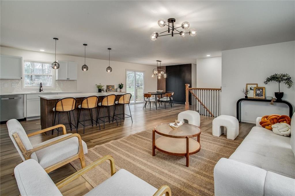 Stunning Full Rehab in Liberty's Sought-After Greene Hills! Welcome to 1508 Nancy Lane — a beautifully reimagined 3-bedroom, 3-bath home where timeless charm meets modern luxury. Thoughtfully renovated from top to bottom, this 2,050 sq ft split-level sits on a generous .34-acre lot and showcases high-end finishes throughout. Step inside to a bright, open-concept main level featuring luxury vinyl plank flooring, statement globe lighting, and a seamless flow between the living, dining, and kitchen areas — perfect for entertaining. The chef-inspired kitchen boasts white shaker cabinetry, quartz countertops, a contrasting dark wood island with bar seating, stainless steel appliances, subway tile backsplash, and sleek matte black hardware. Sliding glass doors off the dining area lead to a brand new deck overlooking the spacious backyard. The primary suite is a true retreat, complete with plush carpet, a ceiling fan, and a spa-like en-suite featuring a stunning double vanity with quartz tops, dual arched mirrors, modern globe sconces, and gorgeous green decorative tile in the walk-in shower. The second full bath impresses with floor-to-ceiling marble-look tile, a tub/shower combo with rain head, and chic matte black fixtures throughout. The finished lower level adds 725 sq ft of flexible living space with a private bedroom featuring its own stylish bath — ideal for guests, a home office, or multigenerational living. Additional highlights include a 2-car built-in garage, updated windows, fresh interior and exterior paint, and all-new finishes from start to finish. Located in the established Greene Hills neighborhood with easy access to Liberty's top shopping, dining, and amenities — this one is truly move-in ready. Come see it before it's gone!