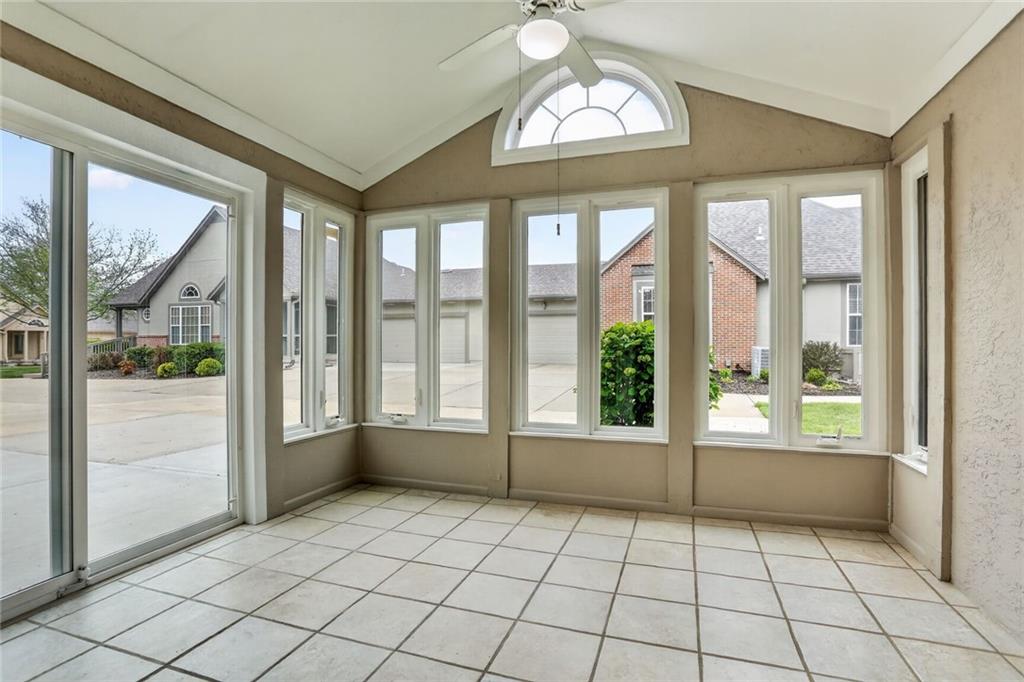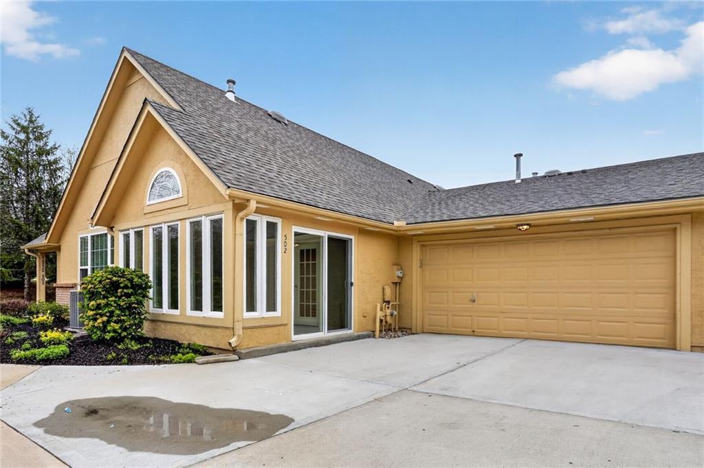 Welcome to this elegant and well-maintained villa offering the ease of true one-level living in a beautifully landscaped, maintenance-provided community. This updated unit features gorgeous hardwood floors throughout and brand new interior paint, creating a fresh and inviting feel from the moment you step inside. The expansive primary suite includes an en suite bathroom with a walk-in shower, lovely vanity, and a spacious walk-in closet. A second bedroom—located just off the main living area—offers flexibility as a guest room, office, or hobby space. The vaulted living room is warm and inviting with its cozy fireplace and large windows that bring in abundant natural light. The kitchen provides excellent cabinet storage, generous counter space, and a convenient eat-in bar area perfect for everyday dining. Adjacent to the kitchen, the fully enclosed sunroom offers a peaceful spot for morning coffee, reading, or simply relaxing indoors with outdoor views. Additional features include a large 2-car garage and a brand-new roof for added peace of mind. Brand new roof and concrete in front of the garage door and porch. The community offers attractive amenities such as a clubhouse and pool, all set within a lovely, tree-filled neighborhood maintained for you. Enjoy comfort, convenience, and low-maintenance living in this welcoming villa—ready for you to move right in.