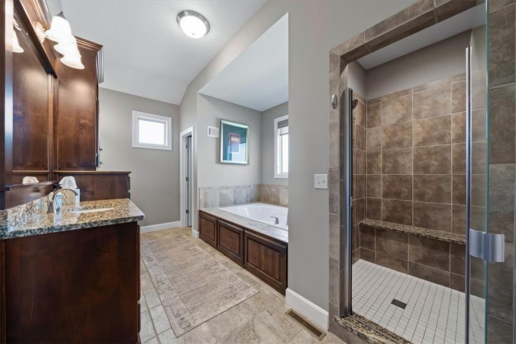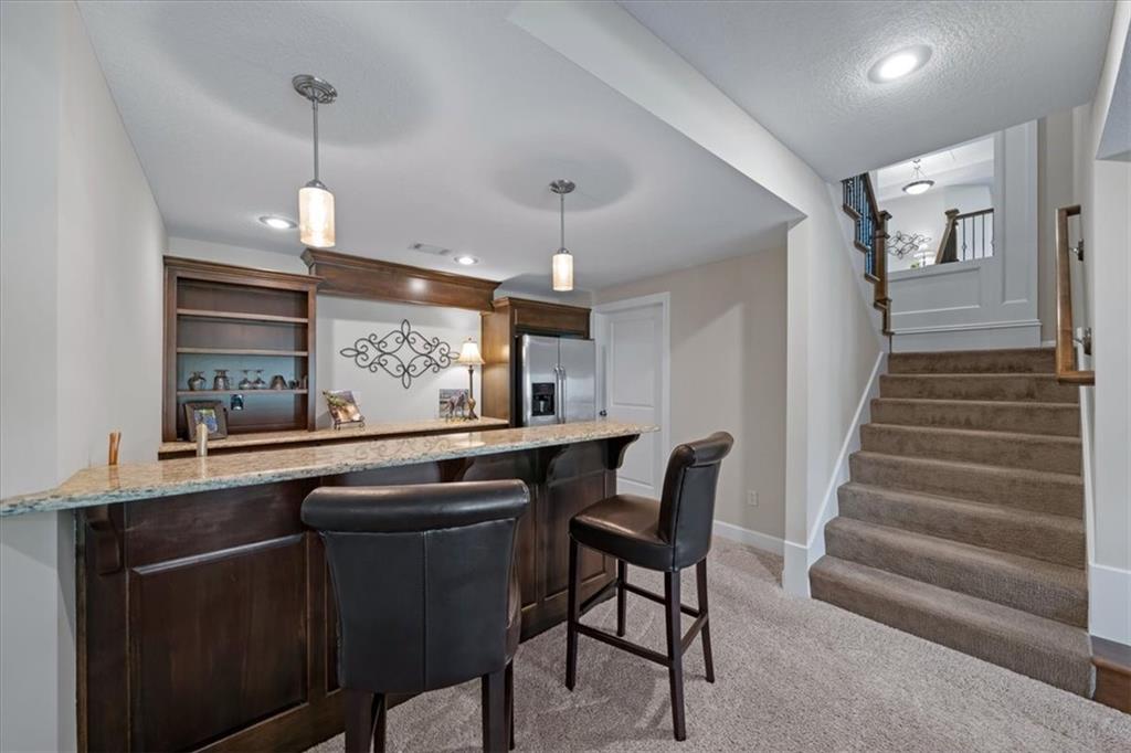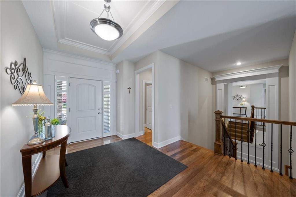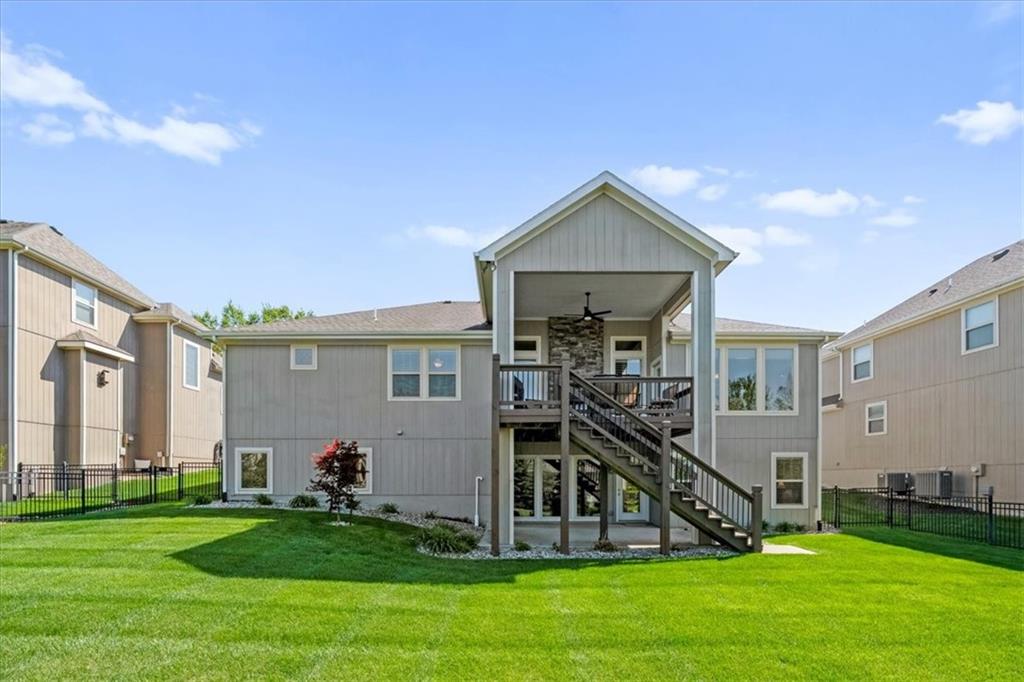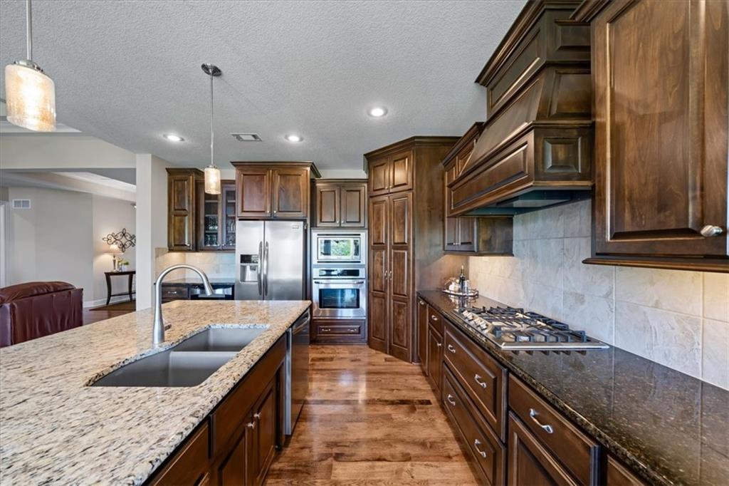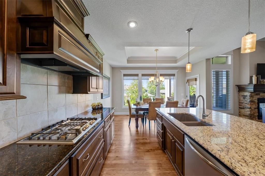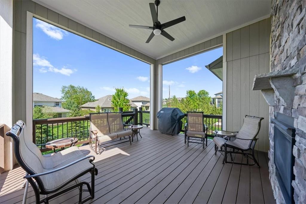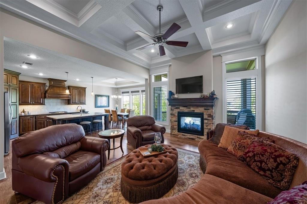 Meticulously maintained, this stunning reverse 1.5-story offers quality finishes and effortless main-level living. The Spacious great room showcases a coffered ceiling and gas fireplace, that opens to the kitchen featuring a large island with breakfast bar, walk-in pantry, granite counters and gas range. Wide plank hardwood flooring throughout most of the main level! The dining area walks out to a covered deck complete with fireplace and ceiling fan, overlooking the level, fenced backyard—an ideal setting for relaxing or hosting. The primary suite is a true retreat with a walk-in closet, dual vanity with built-ins, whirlpool tub, and beautifully tiled shower and floors. A second bedroom, full bath, and convenient laundry room complete the main level. The finished walkout lower level expands the living space with a generous family room and wet bar, plus two additional bedrooms—one with a private ensuite bath and the other with a full bath just steps away, perfect for guests or family. Community amenities include a clubhouse, swimming pool, tennis/pickleball courts and play area. Fantastic location on a culdesac lot with convenient access to premier shopping, dining, major highways and Top-rated Blue Valley Schools!