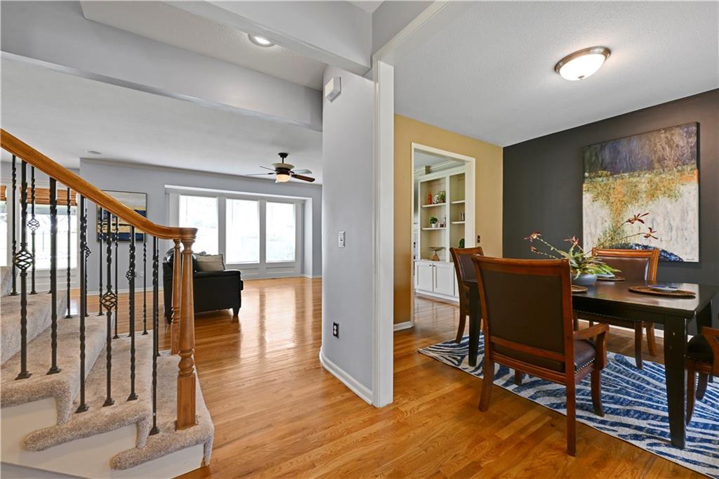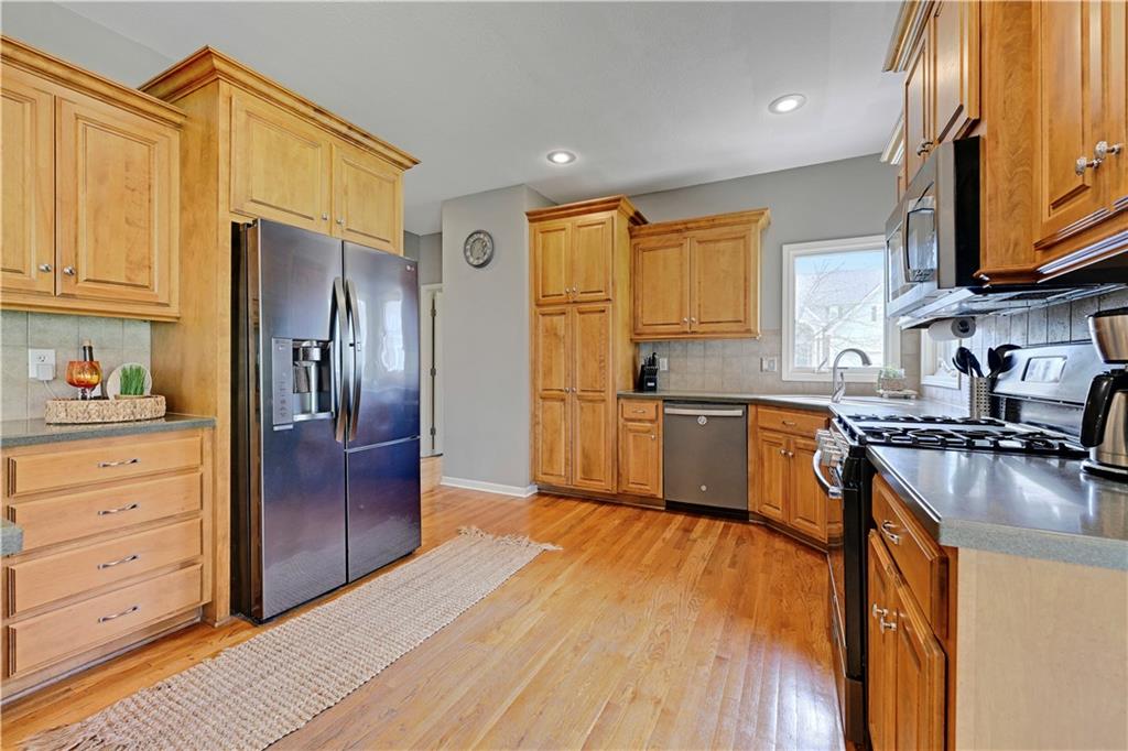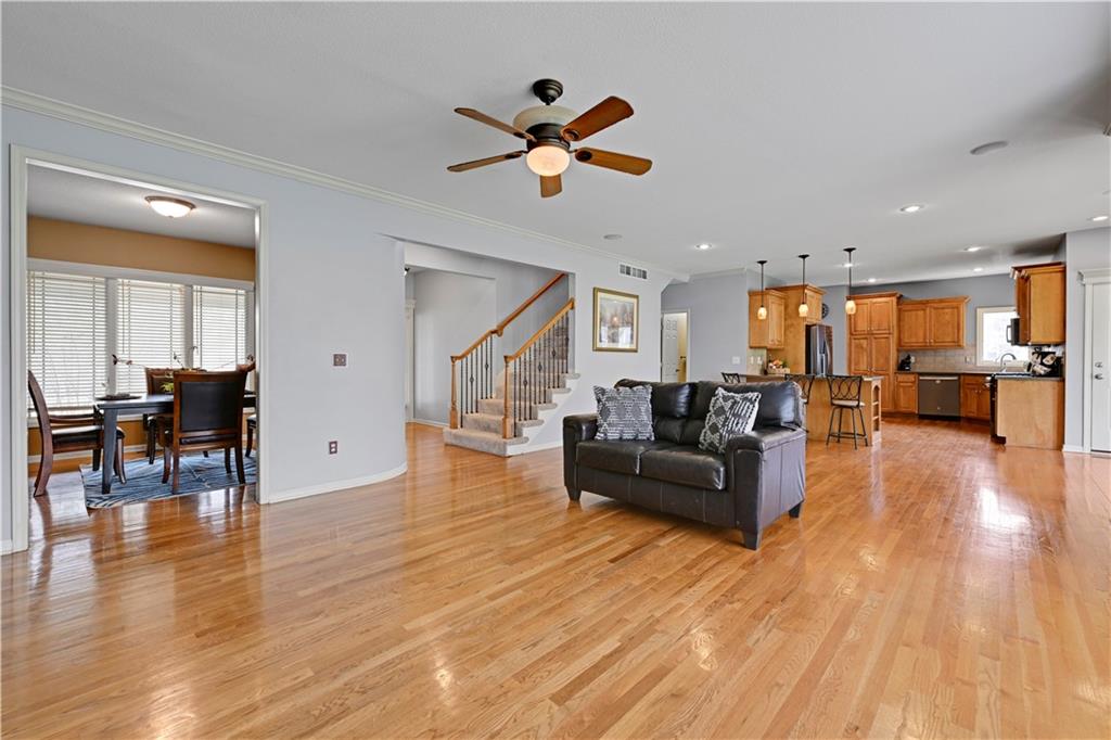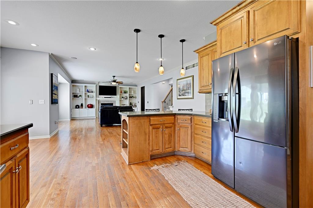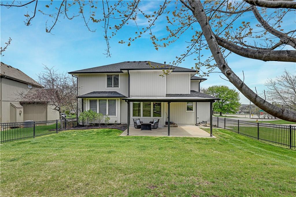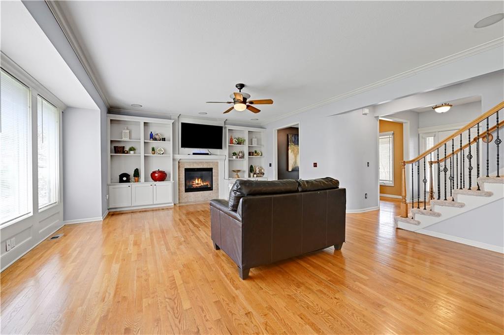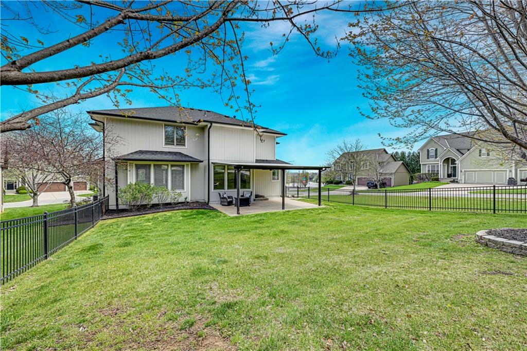 Welcome to this spacious, character-filled two-story home perfectly situated on a large corner cul-de-sac lot with a covered front porch. The wide-open main level features hardwood floors throughout and a layout that flows effortlessly. The great room is the showstopper with a cozy fireplace, custom built-ins, and a wall of windows overlooking the fenced backyard. The kitchen offers abundant cabinetry, stainless steel appliances, and a convenient breakfast bar. A formal dining room near the entry easily handles large gatherings, and an additional main-level office with built-ins adds flexibility. Upstairs, you’ll find four oversized bedrooms, each with bath access, including a standout primary suite with a private sitting room—perfect for a nursery, office, or workout space. The primary bath features a fantastic walk-in shower and a large walk-in closet. The cool finished lower level expands your living space with a family room, recreation area, and a character-filled bar, plus an egress window and bath stub, offering the option for a fifth bedroom and full bathroom. Plus, the built-in tv, frig in bar and sub wolver sound system all stay. Enjoy the outdoor living space with the covered patio overlooking the backyard that extends past the fence—perfect for relaxing or entertaining year-round. The oversized garage provides exceptional storage too. Major updates are already done for you with a 1-year-old roof and gutters and a 2-year-old AC and newer carpet giving peace of mind and added value. First floor laundry with utility sink and tons of lower level storage. Checks all the boxes—space, updates, location, and functionality—don’t miss it.