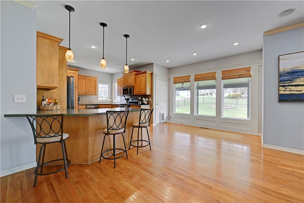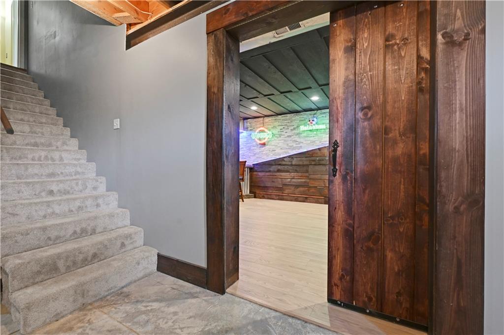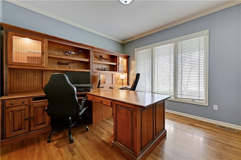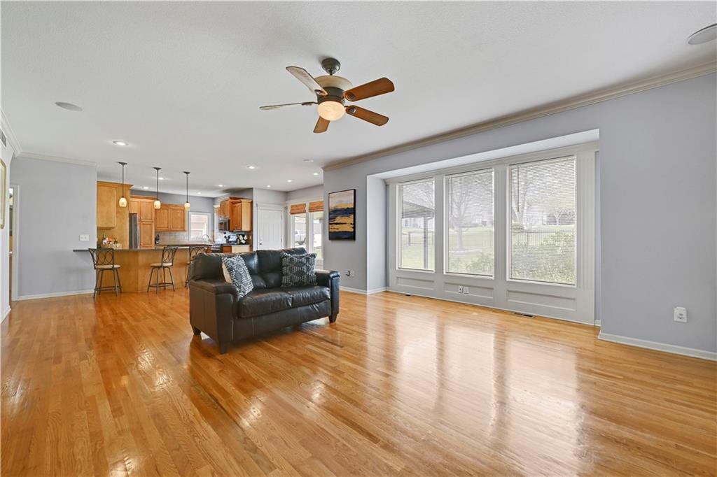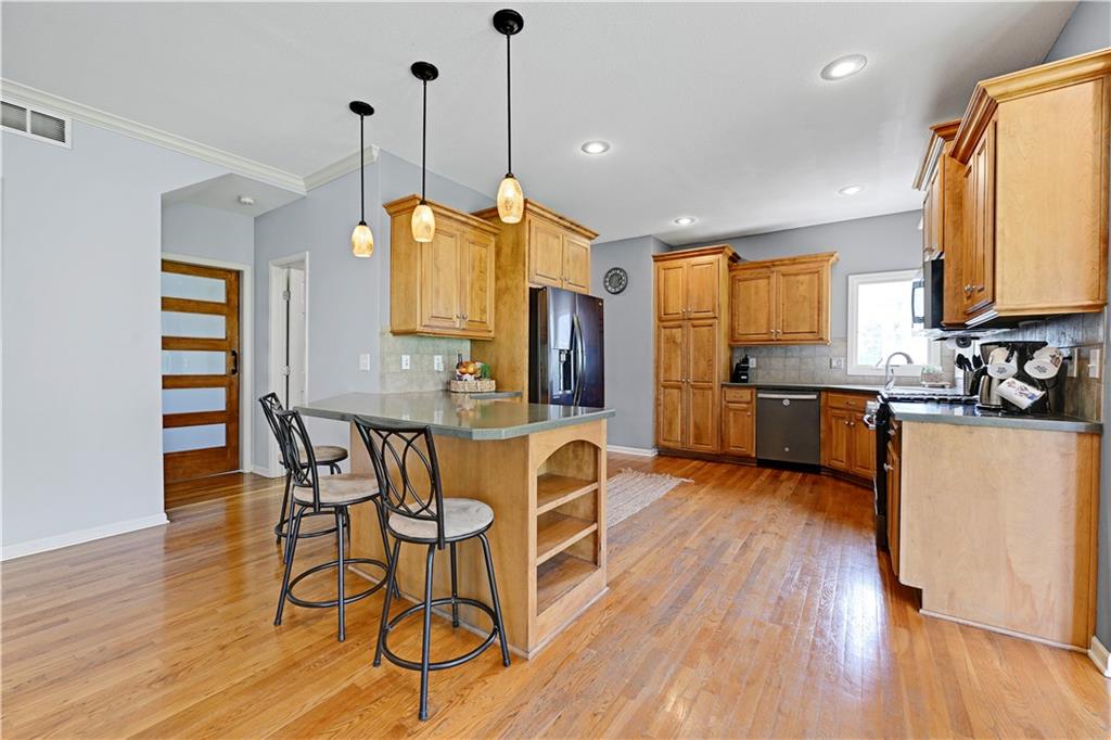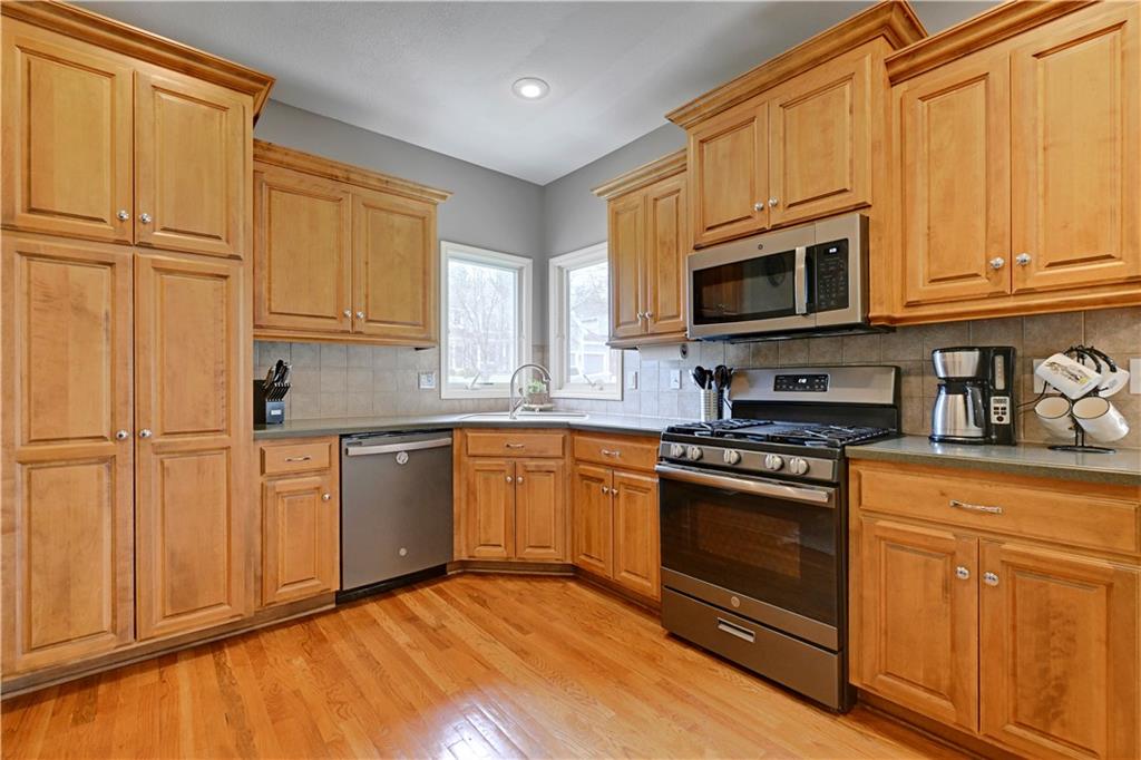 Welcome to this spacious, character-filled two-story home perfectly situated on a large corner cul-de-sac lot with a covered front porch. The wide-open main level features hardwood floors throughout and a layout that flows effortlessly. The great room is the showstopper with a cozy fireplace, custom built-ins, and a wall of windows overlooking the fenced backyard. The kitchen offers abundant cabinetry, stainless steel appliances, and a convenient breakfast bar. A formal dining room near the entry easily handles large gatherings, and an additional main-level office with built-ins adds flexibility. Upstairs, you’ll find four oversized bedrooms, each with bath access, including a standout primary suite with a private sitting room—perfect for a nursery, office, or workout space. The primary bath features a fantastic walk-in shower and a large walk-in closet. The cool finished lower level expands your living space with a family room, recreation area, and a character-filled bar, plus an egress window and bath stub, offering the option for a fifth bedroom and full bathroom. Plus, the built-in tv, frig in bar and sub wolver sound system all stay. Enjoy the outdoor living space with the covered patio overlooking the backyard that extends past the fence—perfect for relaxing or entertaining year-round. The oversized garage provides exceptional storage too. Major updates are already done for you with a 1-year-old roof and gutters and a 2-year-old AC and newer carpet giving peace of mind and added value. First floor laundry with utility sink and tons of lower level storage. Checks all the boxes—space, updates, location, and functionality—don’t miss it.