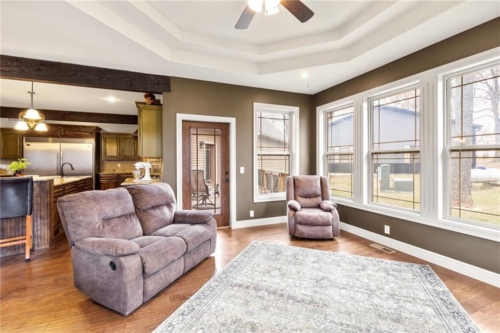 PRIVATE RESIDENCE OF A FOURTH GENERATION HOME BUILDER on 4 picturesque acres! One of a kind custom home offers over 6,200 finished square feet, 5 Bedroom, 4 1/2 bathroom + non-confirming 6th bedroom (7,000 SF total when including gym & basement workshop). LOCATED 6.5 miles north of Warrensburg and 13 miles south of I-70, making the Kansas City commute a breeze. The easement driveway leads past the 1st pond w/ swim dock, up to the residence w/ a stamped & stained concrete covered porch that offers some of the most breathtaking sunrises imaginable. FIBER INTERNET is available at this property. The 2,650 SF main floor features hardwood floors throughout, floor to ceiling stone wood burning fireplace in the living room. The custom chefs kitchen w/ 3 ovens, commercial grade appliances & a large kitchen island for gathering. The hearth room offers a gas fireplace and an abundance of natural light. The primary bedroom suite includes an electric fireplace, double closet, double vanity, built-in furniture, large tile shower & a private laundry room. Upstairs, 3 large bedrooms, 2 full bathrooms, laundry & a bonus non-conforming (6th) bedroom / play room. The finished walkout basement includes a large family room w/ electric fireplace, a custom dog kennel w/ dog door to the outside, fitness gym, 5th bedroom, full bathroom, and workshop / storage. Upgraded features include 2x6 construction, two geothermal heat-pumps for efficiency, two rear decks (one covered that runs entire length of home). A newly constructed 44' x 64' shop w/ 240V electric, two garage doors, concrete floor & bi-fold hanger style door for all of the toys & equipment. This custom home is one you don't want to miss. Too many features to list! Call today to schedule a showing! Home can be purchased with 22.54 total acres and can be referenced at MLS listing 2589070.