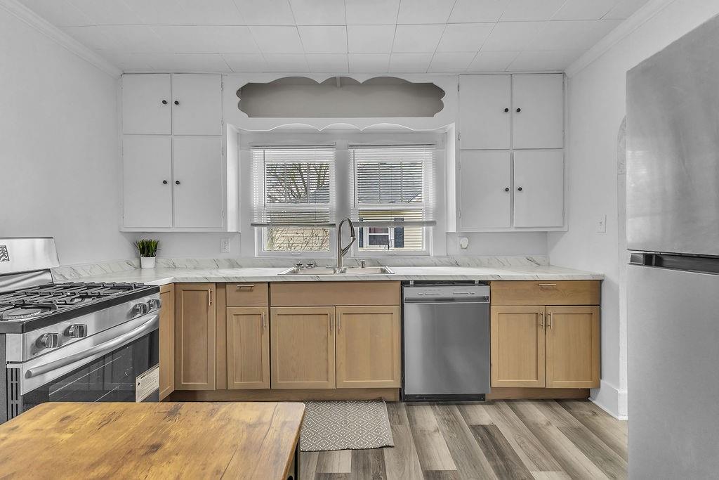 Welcome home to this charming and completely remodeled gem - the perfect place to plant your roots! From the moment you arrive, you'll appreciate the level lot, off street parking, and great curb appeal. Step inside to discover a warm and inviting living room, an updated kitchen featuring stainless steel appliances, 3 sun filled bedrooms, and 1 full bath. The delightful sunroom is the perfect spot for your morning coffee, and main floor laundry adds everyday convenience. Best of all, the big-ticket items are already taken care of, including a brand new roof and gutters, A/C unit, water heater, and electrical panel, mean you can move in with total confidence. A full unfinished basement offers incredible potential to grow into the space and make it your own. This is truly move-in ready living at its finest. Don't let this one slip away!