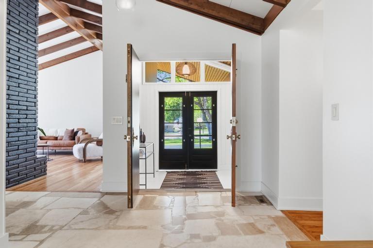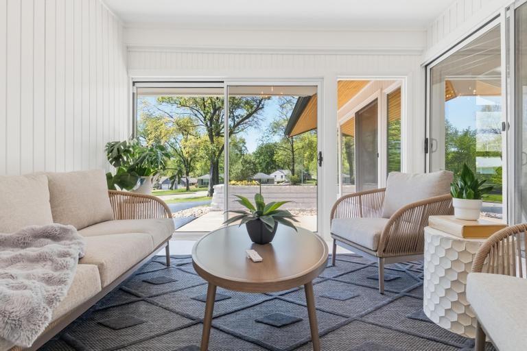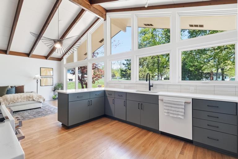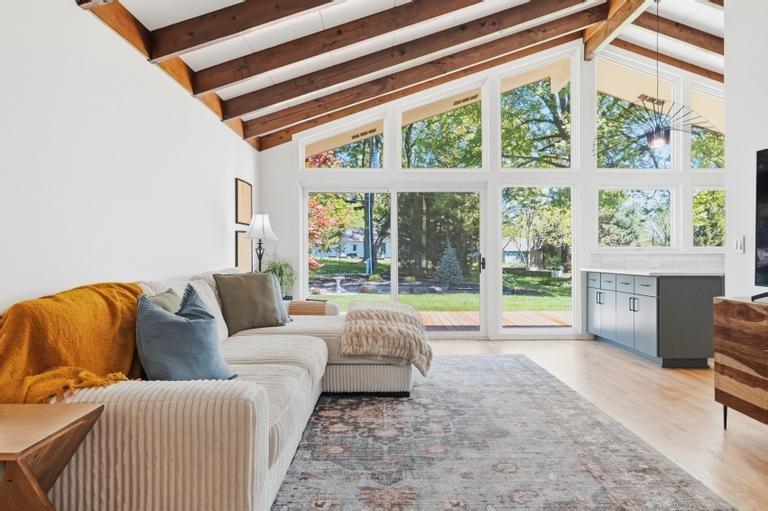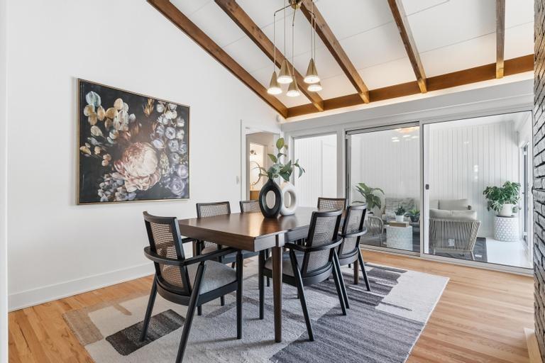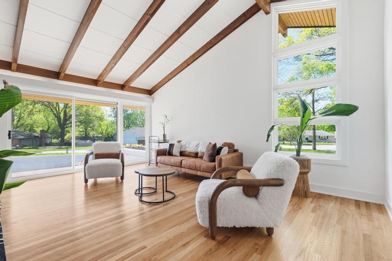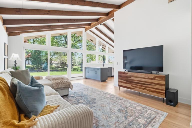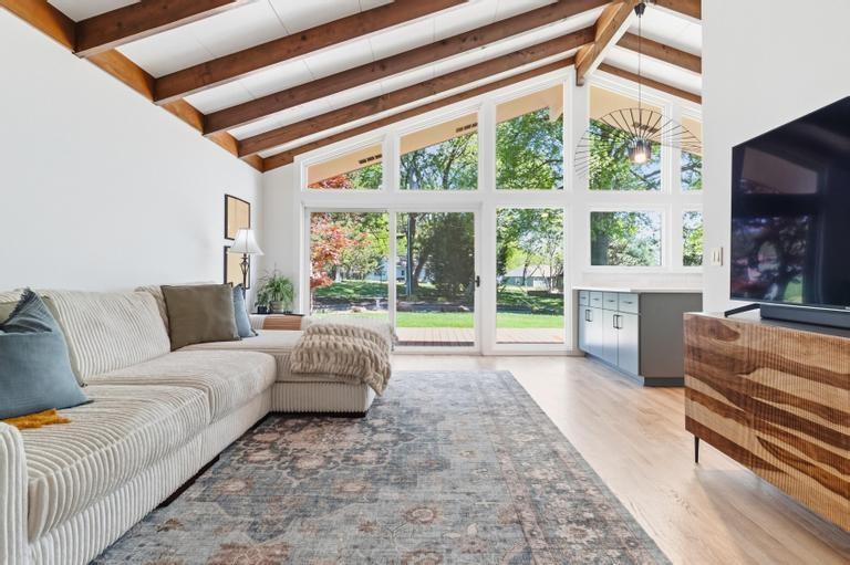 This completely renovated mid-century modern has been reimagined for today while keeping all of the architectural character that made it special to begin with. Vaulted ceilings with exposed beams, walls of glass, and sunlight that pours in from every angle—it feels more like a retreat than a house. The layout flows effortlessly from one space to the next, with multiple living areas that each bring their own vibe… cozy fireside nights, slow mornings in the sunroom, coffee with a view, or hosting a full table without feeling crowded. The kitchen keeps it clean and current with a fresh, modern palette, open shelving, and sightlines that make it feel connected but not chaotic. And then there’s the dining space—framed by architectural ceilings and natural light—where even takeout somehow feels like an occasion. Every corner of this home was designed to bring the outside in. Oversized windows, sliding glass doors, and that bright, airy sunroom create a constant connection to the surrounding greenery. It’s exactly what people mean when they say they want something that “feels different.” Set in the heart of Leawood, this one stands out in all the right ways—architecturally interesting, move-in ready, and anything but cookie cutter.