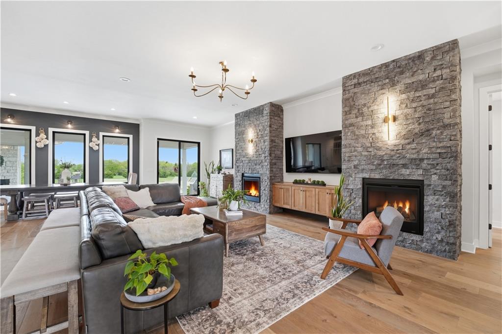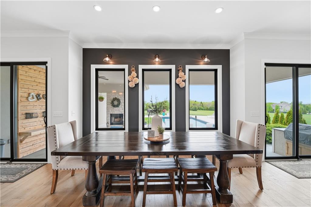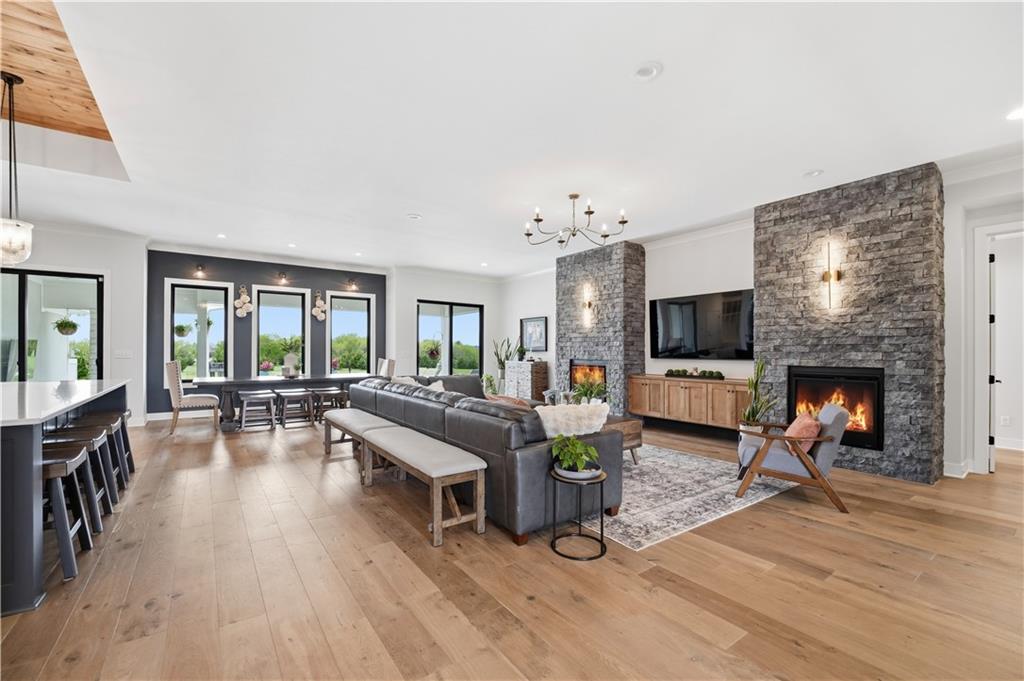 Welcome to Mulberry Hill Estates-where craftsmanship, intention, & luxury come together in this one-of-a-kind home built by Anderson Homes as the builder’s personal residence. Situated on just over 2 acres, this custom estate showcases elevated design & high-end finishes throughout. From the moment you enter, you’ll notice 8-foot doors, crown molding, & real iron welded railings that set the tone for the quality found throughout. The living room features dual fireplaces, custom sconces, & layered lighting, creating a warm yet sophisticated space ideal for relaxing & entertaining. The kitchen is the centerpiece of the home, anchored by a massive 10’ island with storage on both sides, custom cabinetry, quartz & granite countertops, & a marble mosaic backsplash. Enjoy top-tier Viking & Thermador appliances, a gas range with pot filler, paneled dishwasher, & three pantry spaces, including a beverage room with butcher block counters & wine fridge—perfect for hosting. The primary suite offers a true retreat with a feature wall & spa-like bathroom featuring a soaking tub, oversized walk-in shower with rain head, heated floors, & a custom closet with built-ins. The main level continues with a spacious laundry room that can double as a home office, along with two additional bedrooms & bathrooms. The lower level is designed for lifestyle & entertaining, featuring hardwood floors with vapor padding, surround sound, a full gym, second laundry setup, & a lounge area that opens to a private courtyard. You’ll also find two additional bedrooms & a full bath with heated floors. Outdoor living shines with a mineral pool featuring a tanning ledge, auto cover, & gas fire feature, plus a built-in grill & wood-burning fireplace. A 3-car attached garage & separate heated/cooled 3-car tandem detached garage with pool house & full bath complete this exceptional property. A rare opportunity to own a builder’s personal home with unmatched detail & design.