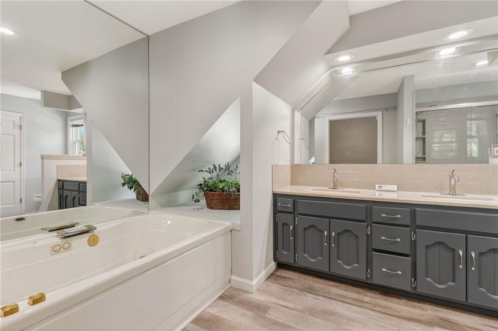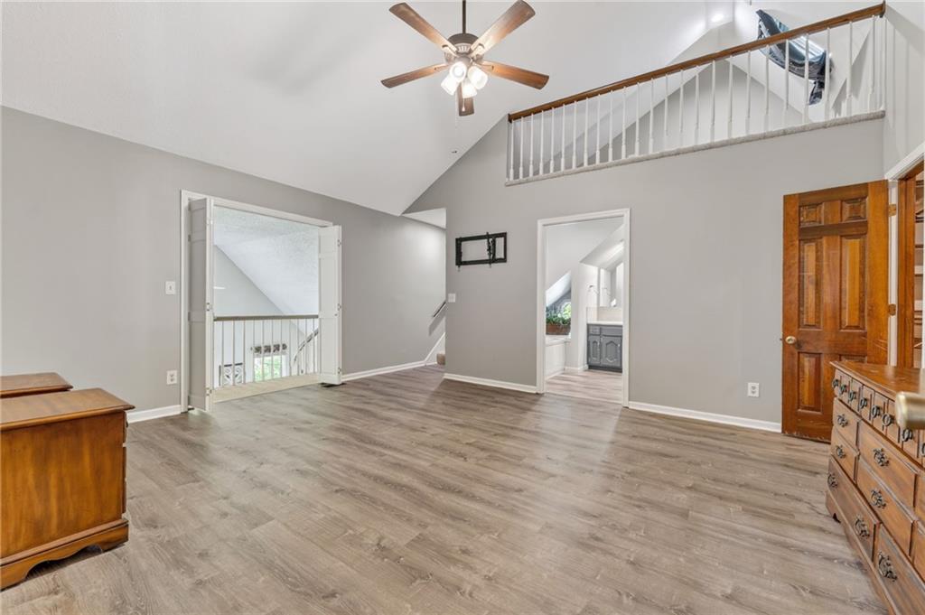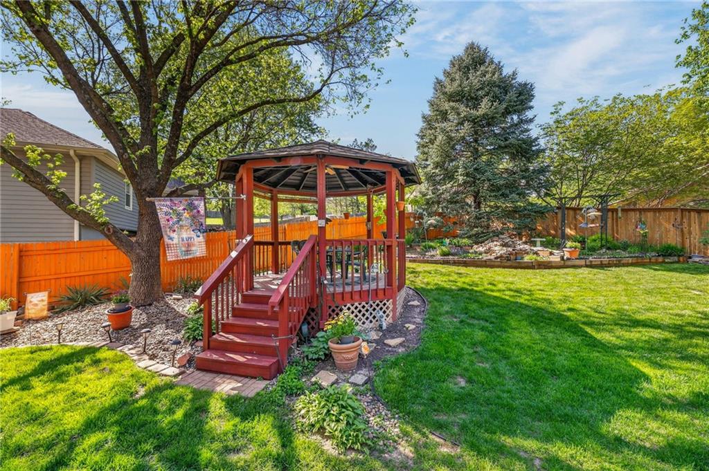 Beautiful 4-bedroom, 4 full bathroom 1.5-story home on a 0.29-acre corner lot in a cul-de-sac, just a short distance to the community pool. Step inside to the main level that features a spacious kitchen with bay window breakfast area, formal dining with vaulted ceilings, a cozy hearth room with fireplace and skylights, convenient laundry, plus 2 bedrooms and 2 full bathrooms. A show-stopping great room with soaring vaulted ceilings, a dramatic wall of windows, and a curved staircase leading to a balcony above. Upstairs, the private primary suite offers a spa-like feel with a large walk-in closet, tall ceilings and unique loft space, while the second bedroom includes its own en suite bath. Enjoy your own backyard retreat with a fully fenced yard, gazebo with electricity and ceiling fan, and French drains for added peace of mind. Style, space, and standout details at every turn. From its eye-catching design to its inviting outdoor spaces, prime cul-de-sac setting, and walkable access to community amenities, this home blends comfort, style, and practicality into one unforgettable package.