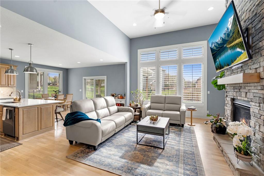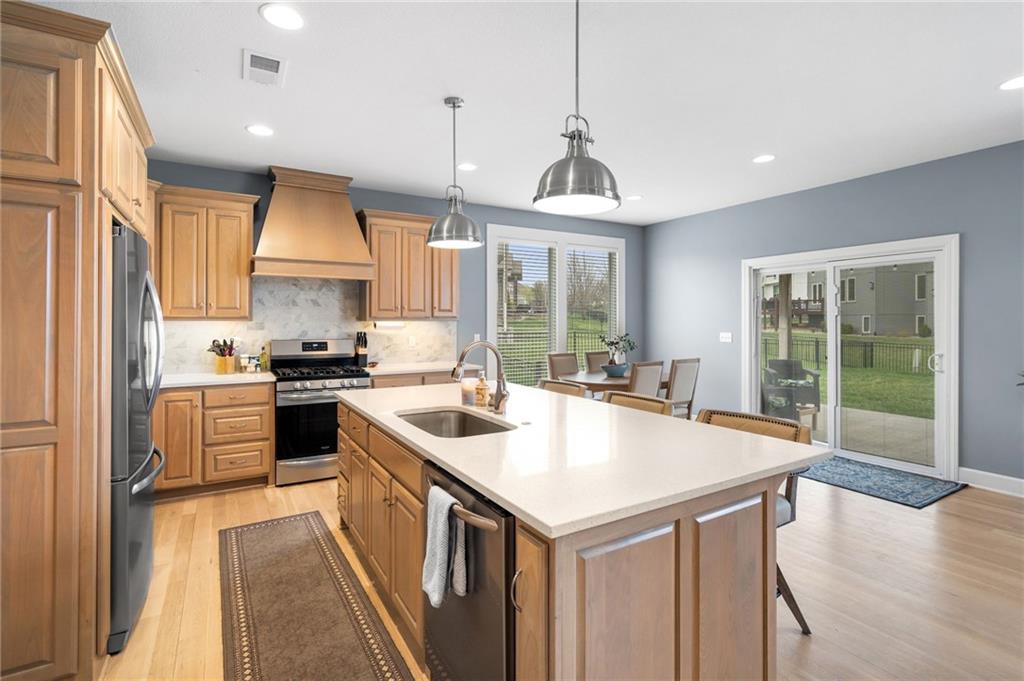 Stunning Ranch/Reverse home that features beautiful wood floors on the main level, open floor plan and kitchen with granite countertops, kitchen island, stainless appliances including a gas cook top that all remain with the home, white cabinets and pantry. Spacious primary suite that provides a wonderful walk in closet with lots of space, adjoining bathroom that features a double vanity, multi-headed shower and tiled floors. Finished basement with large rec room with wet bar and two additional bedrooms. Enjoy your fenced in backyard with a large patio space that is great for entertaining and includes a fire pit. Hurry this one will not last long!!!
