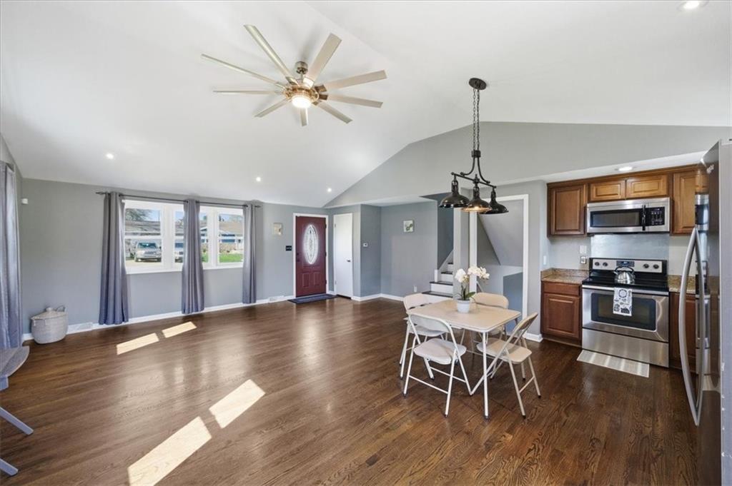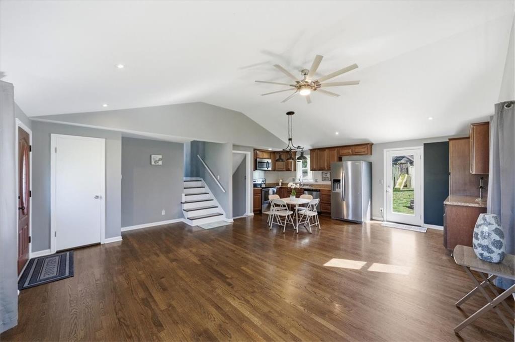 Fully remodeled 3 bedroom close to so many major attractions and amenities. This turn-key property offers terrific value and location! Bright, open main level with vaulted ceilings, hardwood floors, and a beautifully redone kitchen with stainless steel appliances; this spacious area provides comfort and convenience for your main family living space. Upstairs features 3 spacious bedrooms and an updated full bath. The lower level offers flexibility—perfect for a second living area, office, or both. The basement is nearly finished and ready for your final touches—add flooring to gain ~230 additional square feet. Includes remodeled half bath and laundry for immediate functionality. Large yard w/storage shed, clean and functional garage, and just minutes from The Legends, Kansas Speedway, and the proposed Chiefs stadium site! A quick drive to KCI or downtown. Homes in this location and price point move fast—schedule your showing today.