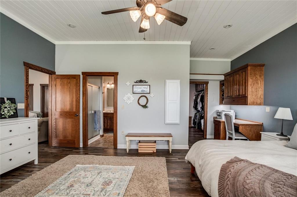 Whoa! This is the one you've been waiting for! Ranch home, outbuilding on 37.8 fenced acres! Built in 2007, this 2,456 sq ft. custom built 4 bdrm, 2 full bath, no steps, RANCH. Soaring 10 ft. ceilings, loads of natural light, open, modern floor plan with high end fixtures, flooring and details. Generous room sizes, delightful sun porch, custom cabinets and solid wood trim and doors, humongous pantry, Corian counter tops, see through cabinet showcase built-ins...the list goes on an on! Roof only 5 years old, 2 yr old HVAC, dishwasher is less than a year. Dining room holds table that seats 10! Property has a fantastic 30'x40' metal outbuilding w/concrete floors & 200amp box, two garage doors on one side and a lean-to on the other. This land...there's two tracts being sold here, a 32.5 and a 5.3 acre plat. There's two entrances, a small pond, chicken coop, some electric fencing in pastures. Orchard producing peach, apple, pear trees, persimmons, too! walking trails throughout property! It's really beautiful! Peaceful, country living just minutes from downtown Holden (@10 min), 25 min to Warrensburg and about hour from Kansas City International Airport. No HOA so build what you want on this sprawling acreage. Great for hunting, cattle, and much more! Professional photos scheduled for next week, including drone shots of the land, and home will be available for showings next Thursday, April 9th.