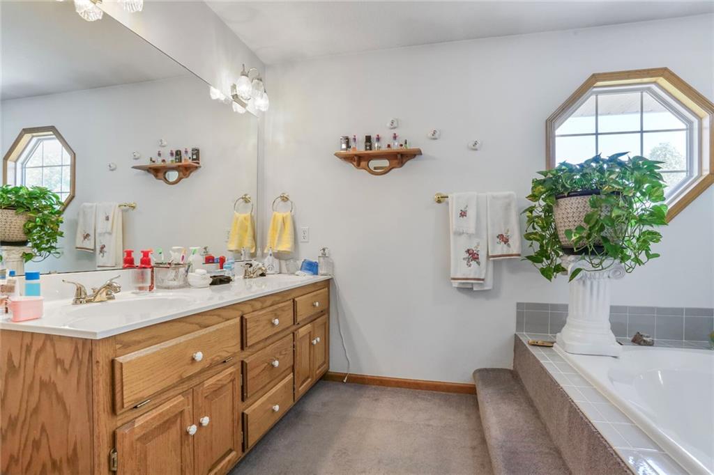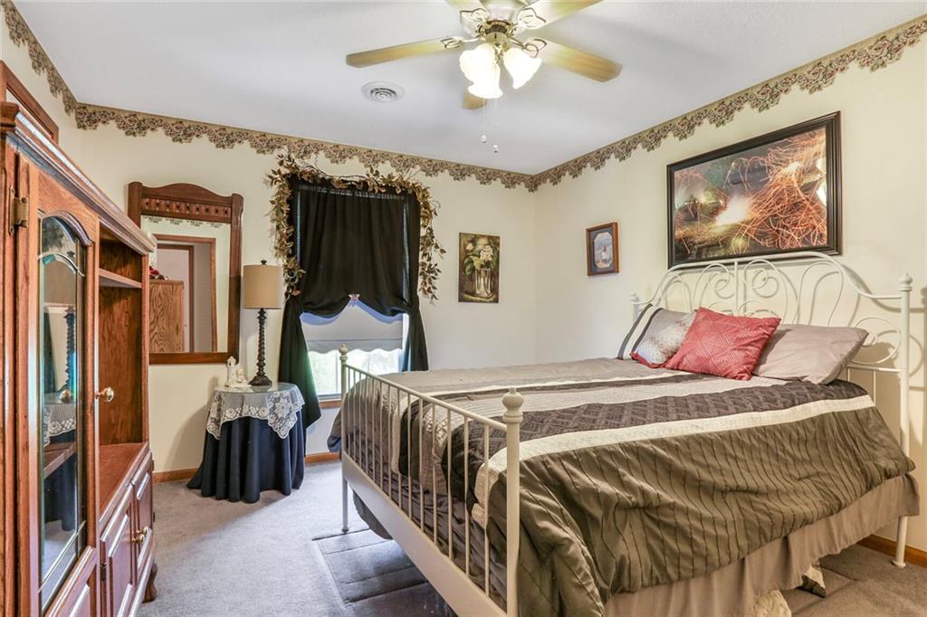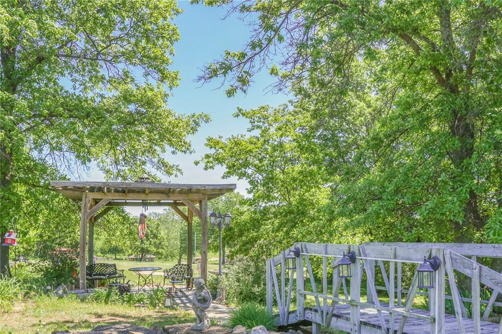 Welcome to your private oasis just outside the city limits! Nestled on nearly 25 picturesque acres on a paved road, this unique two-story home offers the best of both worlds—peaceful country living with the convenience of being just minutes from town and highway access. Step inside to a warm and inviting living room filled with natural light, featuring a cozy wood-burning stove. The open-concept design flows seamlessly into the kitchen, complete with tile floors, abundant cabinet and counter space, and a versatile bonus room just off the kitchen—perfect for a custom butler’s pantry or coffee bar. The dining area opens to an expansive deck, ideal for entertaining or simply taking in breathtaking views. You’ll even catch a stunning display of fireworks on the Fourth of July right from your deck! The main level also includes a dedicated office with French doors and custom built-ins, a convenient laundry room, and a half bathroom. Upstairs, the primary suite offers a tray ceiling, generous walk-in closet, cozy sitting area, and private bath complete with a whirlpool tub and separate shower. Two additional bedrooms and a full bathroom with tub and shower complete the upper level. The lower level offers ample storage and is ready to be finished to suit your needs-whether as additional living space, home gym, or game room. Enjoy the large outbuilding and shed for storage or hobby use. The property is ideal for nature lovers and hunters alike, with abundant wildlife and a charming bridge that leads to a gazebo—perfect for relaxing!