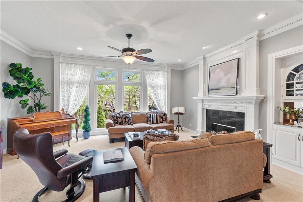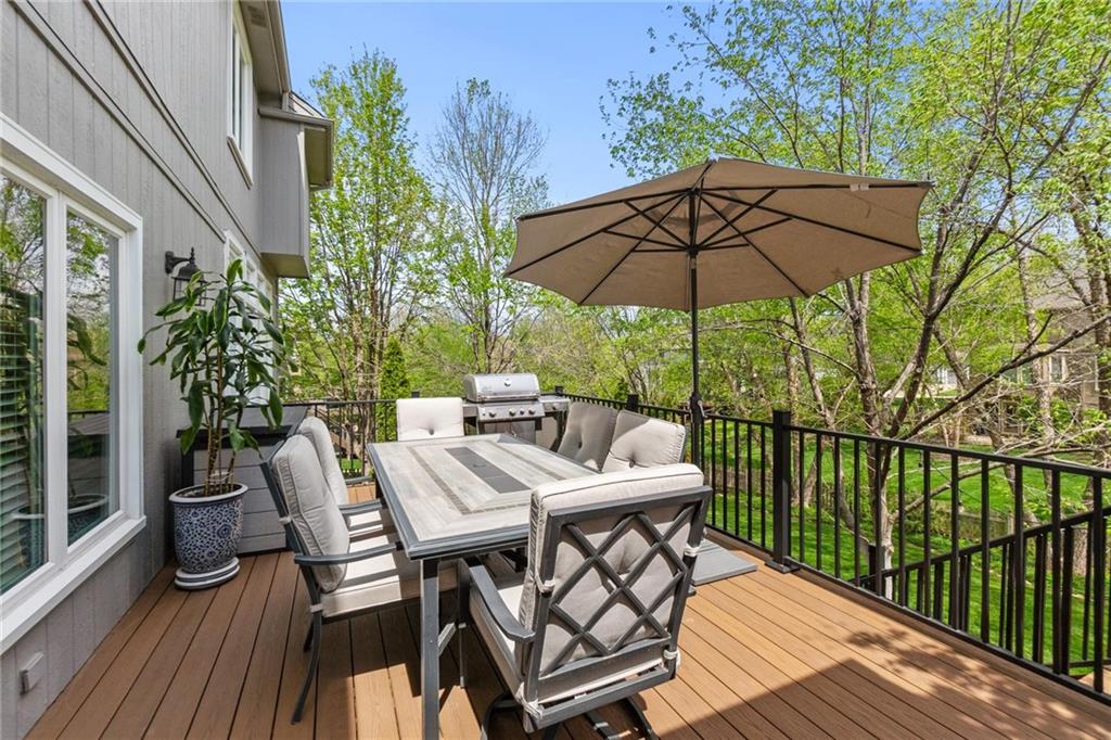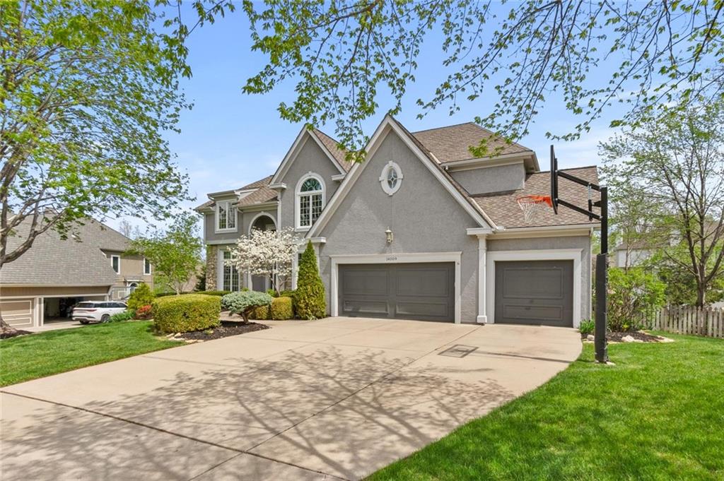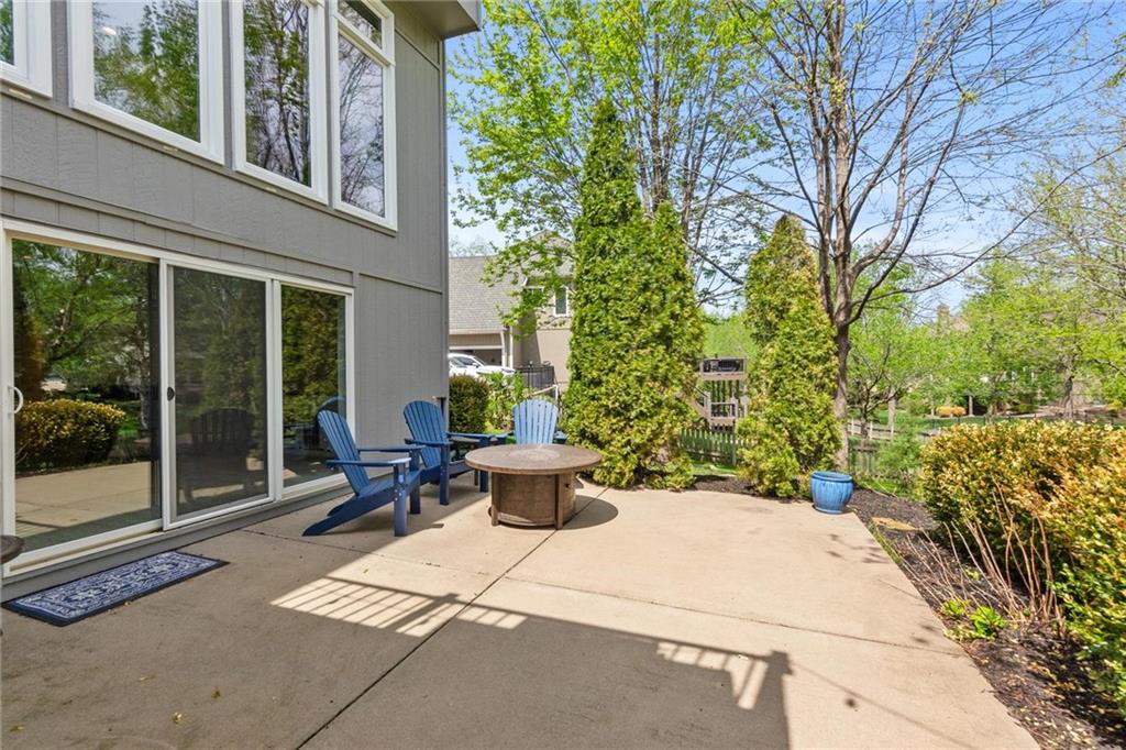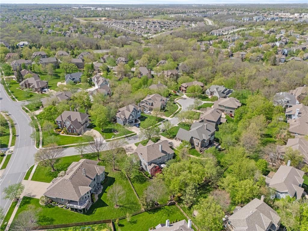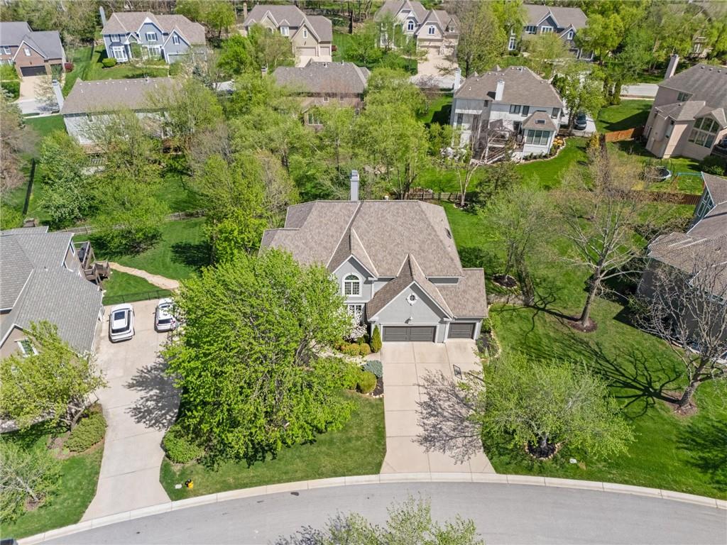 Prestigious neighborhood, quality built Lambie Geer 2 story, with finished walkout lower level, to wood fenced, treed, yard in a cul de sac. New maintenance free deck and new triple pane windows. Double stairs, zoned HVAC. Formal living, formal dining, main floor office. Beautiful powder room. Formal living room has tons of natural light and a charming wet bar. Large kitchen with center island, breakfast room and hearth room with stone fireplace. Granite, Bosch stainless steel appliances. Gorgeous primary bath and large primary with walk in closet. Look close & see the quality, pride, & SPACE!! Award winning Blue Valley schools. AWESOME LOCATION Awesome home in prestigious neighborhood. New Roof coming soon.