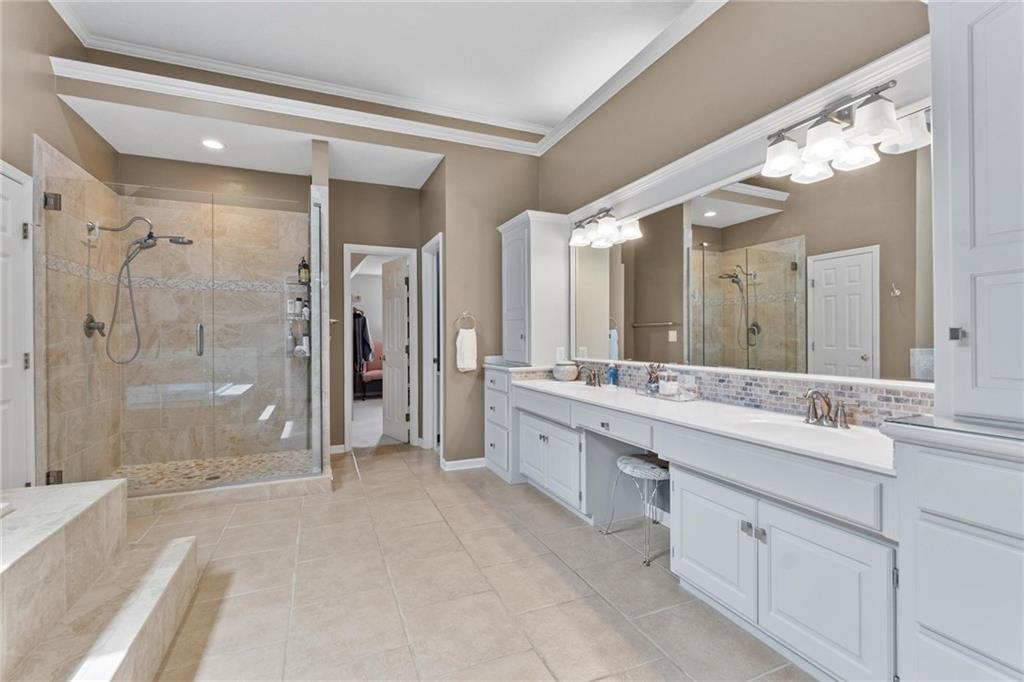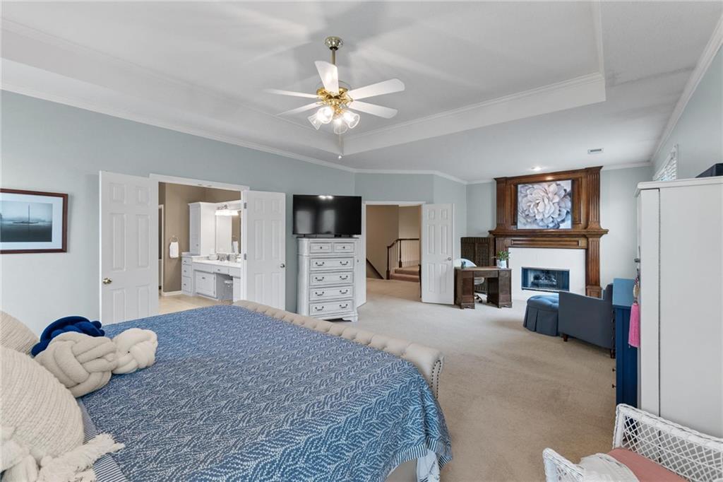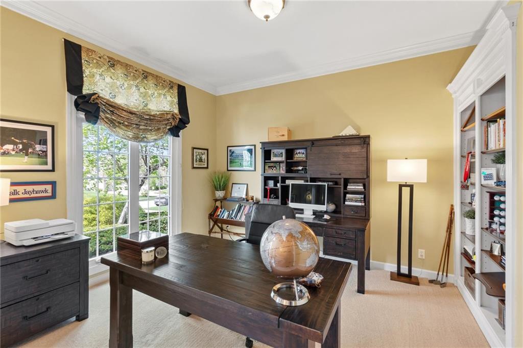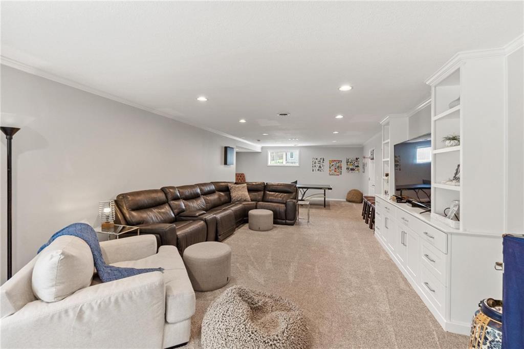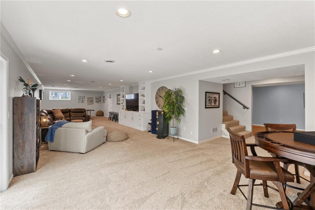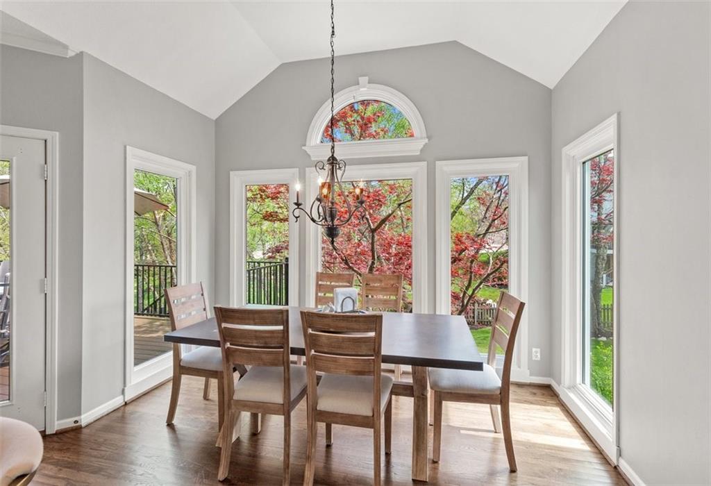 Prestigious neighborhood, quality built Lambie Geer 2 story, with finished walkout lower level, to wood fenced, treed, yard in a cul de sac. New maintenance free deck and new triple pane windows. Double stairs, zoned HVAC. Formal living, formal dining, main floor office. Beautiful powder room. Formal living room has tons of natural light and a charming wet bar. Large kitchen with center island, breakfast room and hearth room with stone fireplace. Granite, Bosch stainless steel appliances. Gorgeous primary bath and large primary with walk in closet. Look close & see the quality, pride, & SPACE!! Award winning Blue Valley schools. AWESOME LOCATION Awesome home in prestigious neighborhood. New Roof coming soon.