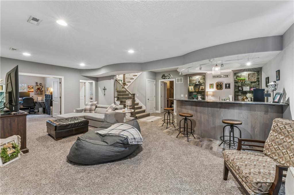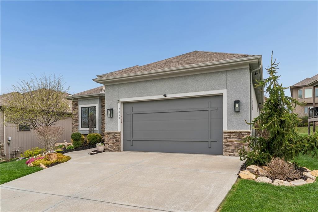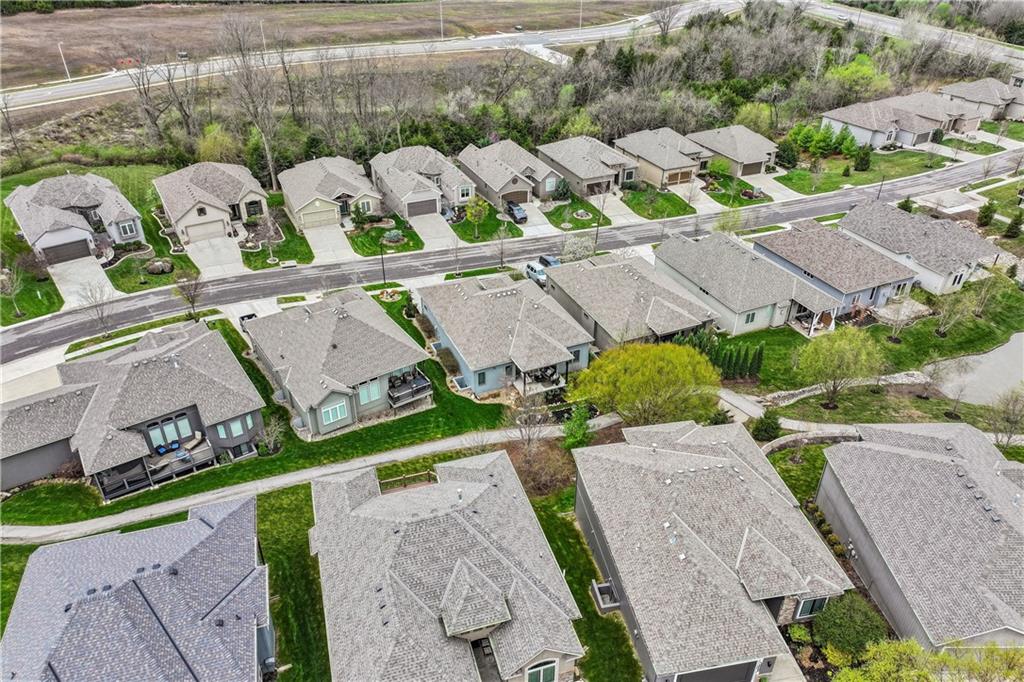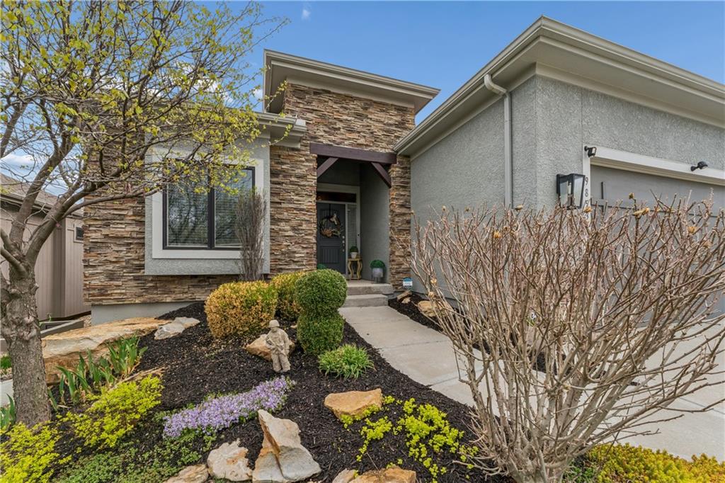 Welcome to this stunning Sorrento model 1.5-story located in the highly sought-after Canyon Ridge subdivision in Lenexa. This "Pauli Homes" beautifully designed 4-bedroom, 3 full bath, 2-car garage home offers a rare combination of architectural character, thoughtful design, and an exceptional setting. A stunning example of modern Craftsman-inspired architecture, offering the perfect balance of warmth, character, and contemporary design. Perfectly positioned on a daylight lot with some green space and a peaceful pond view. This home provides both privacy and picturesque surroundings. Built in 2016, this home stands apart with a timeless sense of style and warmth that is often missing in today’s newer construction—offering a more inviting, refined feel with custom finishes and distinctive design elements throughout. The open-concept main level is filled with natural light and features a main-floor primary suite for everyday convenience. Unique architectural details create lasting impressions, including a gorgeous circular ceiling light display and a beautifully crafted custom curved bar in the finished lower level, perfect for entertaining. The daylight basement expands your living space and includes two additional spacious bedrooms, a full bath, and generous room for gatherings, recreation, or guests—all with a bright, open feel. The unfinished basement space is already outfitted with a fully equipped home gym, offering an example setup for health-conscious buyers who value convenience and consistency in their fitness routine. This home truly showcases a level of character, craftsmanship, and individuality that sets it apart, offering a more classic, comfortable, and elevated feel compared to many newer builds. Ideally located near shopping, dining, and major highways, this exceptional home blends location, lifestyle, and timeless design into one remarkable opportunity.