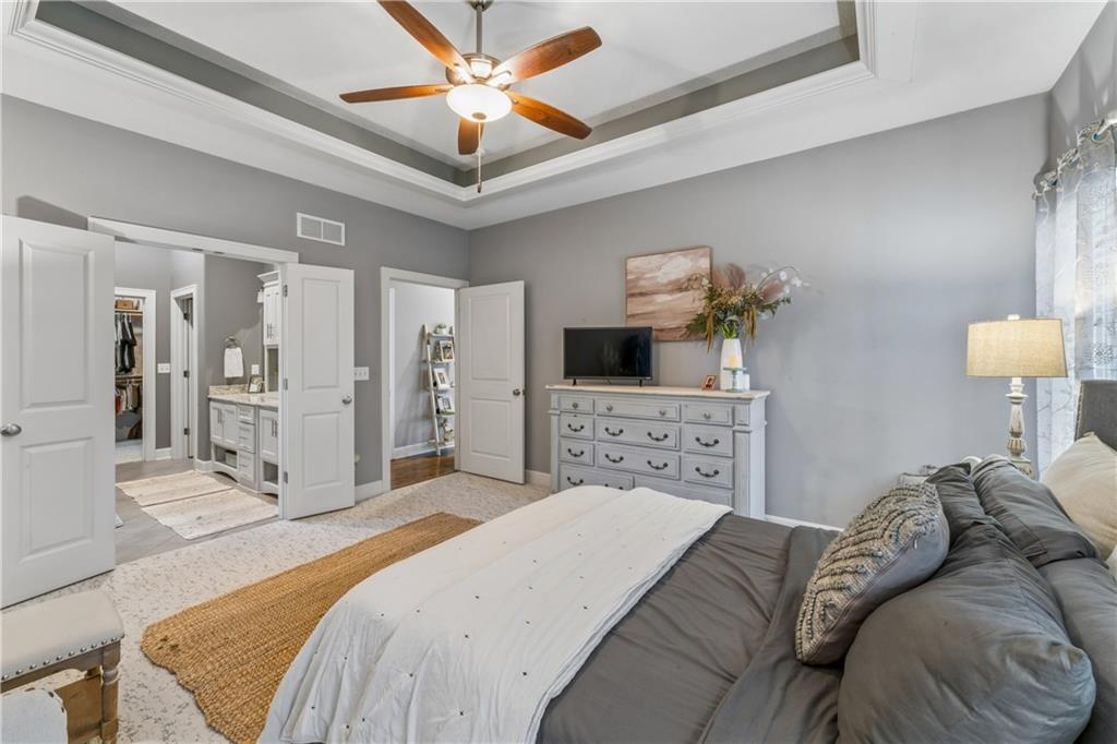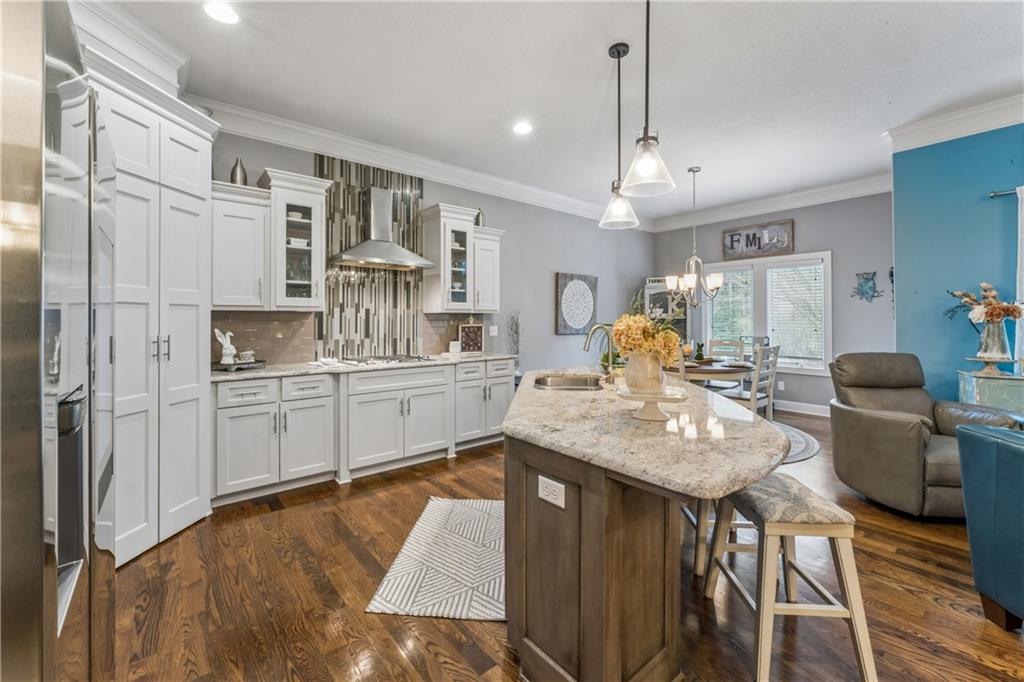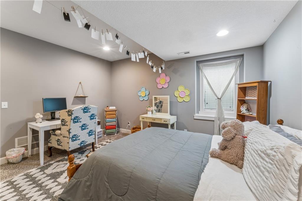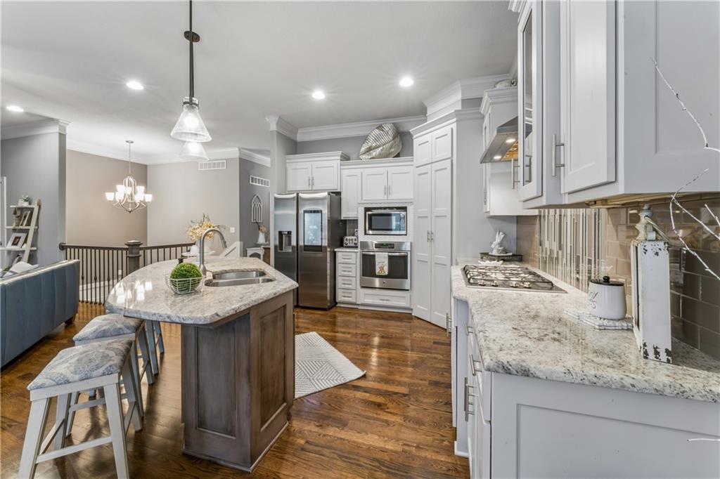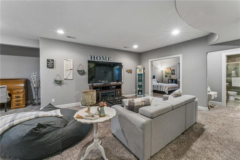 Welcome to this stunning Sorrento model 1.5-story located in the highly sought-after Canyon Ridge subdivision in Lenexa. This "Pauli Homes" beautifully designed 4-bedroom, 3 full bath, 2-car garage home offers a rare combination of architectural character, thoughtful design, and an exceptional setting. A stunning example of modern Craftsman-inspired architecture, offering the perfect balance of warmth, character, and contemporary design. Perfectly positioned on a daylight lot with some green space and a peaceful pond view. This home provides both privacy and picturesque surroundings. Built in 2016, this home stands apart with a timeless sense of style and warmth that is often missing in today’s newer construction—offering a more inviting, refined feel with custom finishes and distinctive design elements throughout. The open-concept main level is filled with natural light and features a main-floor primary suite for everyday convenience. Unique architectural details create lasting impressions, including a gorgeous circular ceiling light display and a beautifully crafted custom curved bar in the finished lower level, perfect for entertaining. The daylight basement expands your living space and includes two additional spacious bedrooms, a full bath, and generous room for gatherings, recreation, or guests—all with a bright, open feel. The unfinished basement space is already outfitted with a fully equipped home gym, offering an example setup for health-conscious buyers who value convenience and consistency in their fitness routine. This home truly showcases a level of character, craftsmanship, and individuality that sets it apart, offering a more classic, comfortable, and elevated feel compared to many newer builds. Ideally located near shopping, dining, and major highways, this exceptional home blends location, lifestyle, and timeless design into one remarkable opportunity.