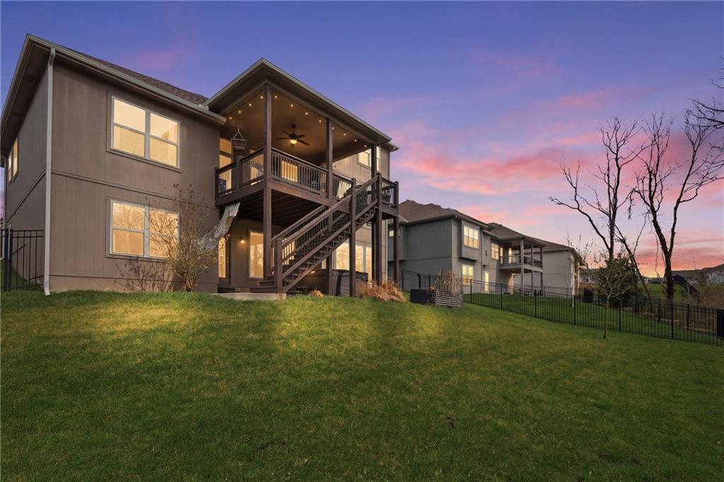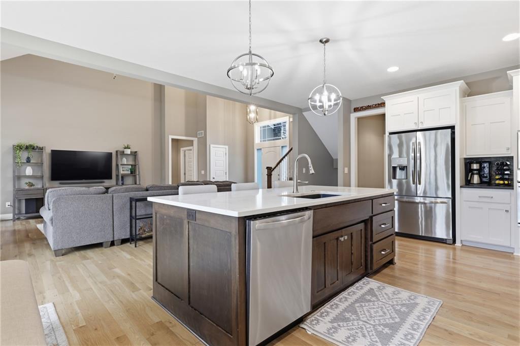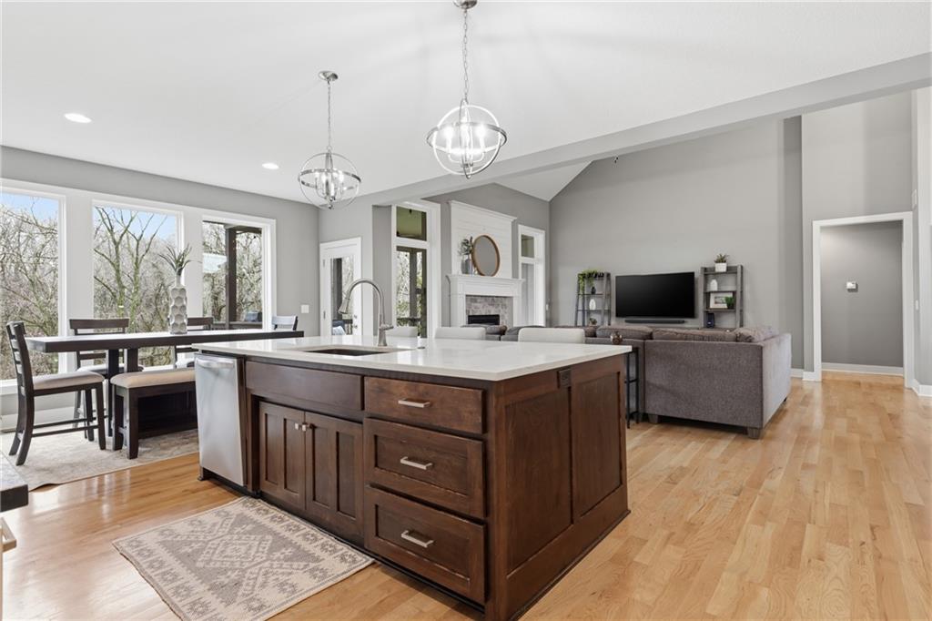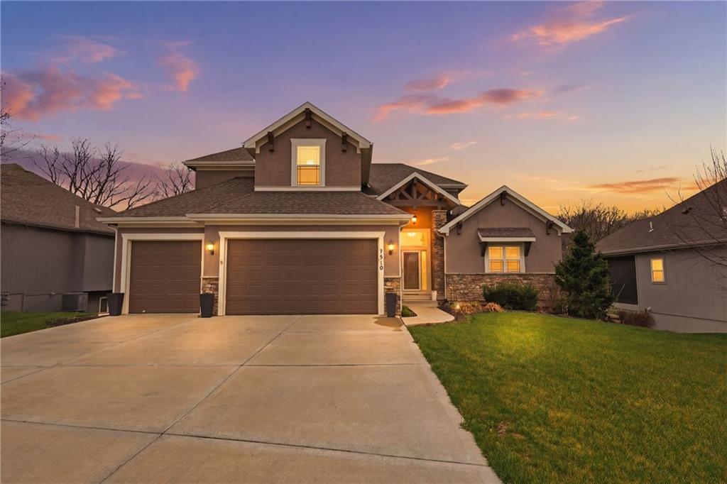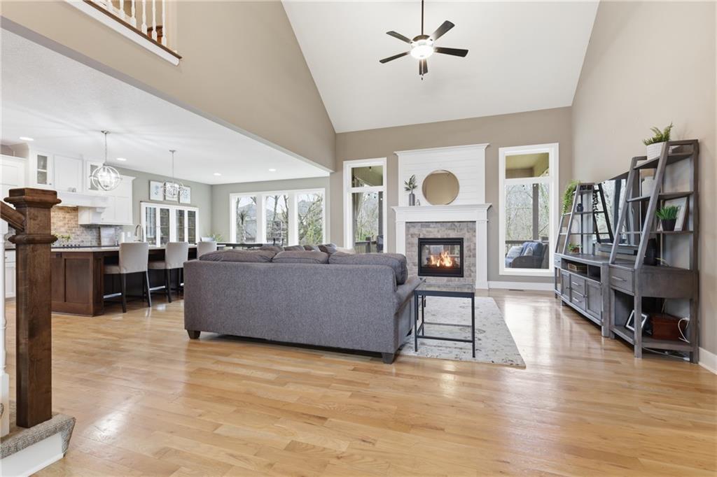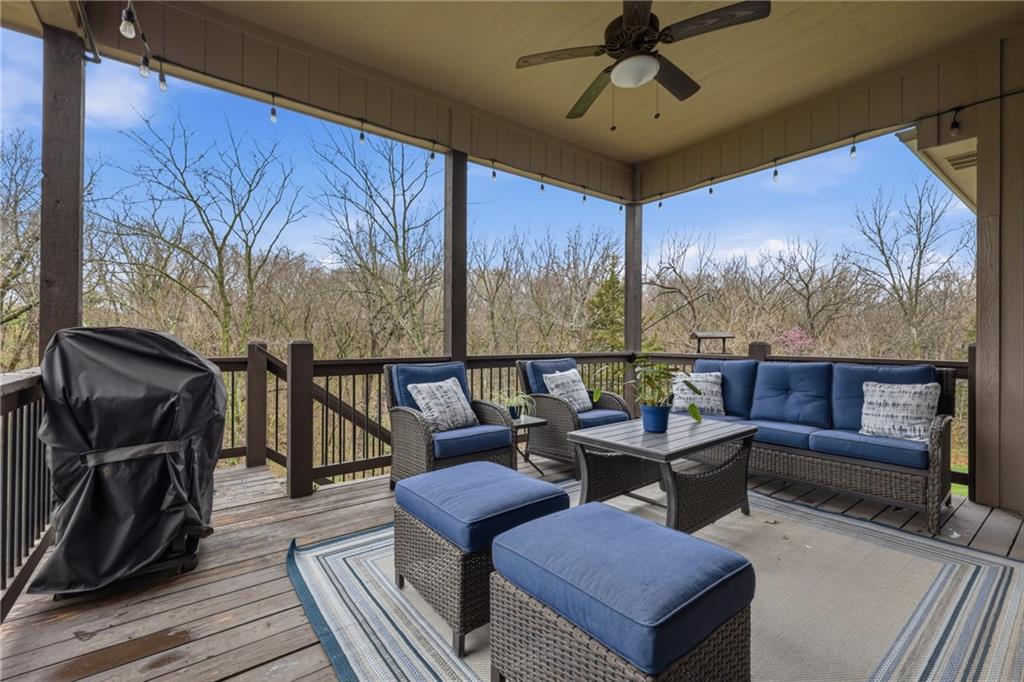 RARE 1.5 story, 5 br, 4 1/2 bath home in Chapel Ridge! Walk into soaring ceilings and windows with beautiful wooded views, light oak hardwood flooring, upgraded lighting, large stained island, upgraded vented hood, quartz and honed granite countertops, see-through gas fireplace from living to large outdoor covered deck, large pantry with pocket desk, large dining/eat-in kitchen. Primary suite with double vanity with tower storage, upgraded shower, and huge closet with conveniently attached laundry room. Upstairs has 3 large bedrooms all with walk-in closets, guest room with ensuite bath, and jack and jill bathroom with separate vanities. Beautifully finished walkout basement with huge rec room, 5th bedroom, full bathroom, wet bar with live edge wood/beverage fridge, ample unfinished storage, and under deck patio. Pristine 3 car garage, upgraded landscaping/retaining walls, metal fence. Come make it your dream home in highly sought after Chapel Ridge and Park Hill schools!