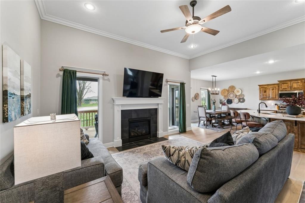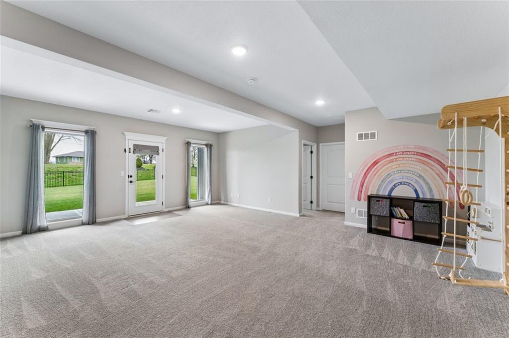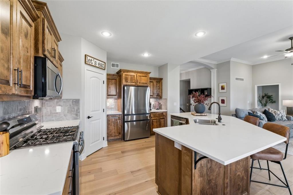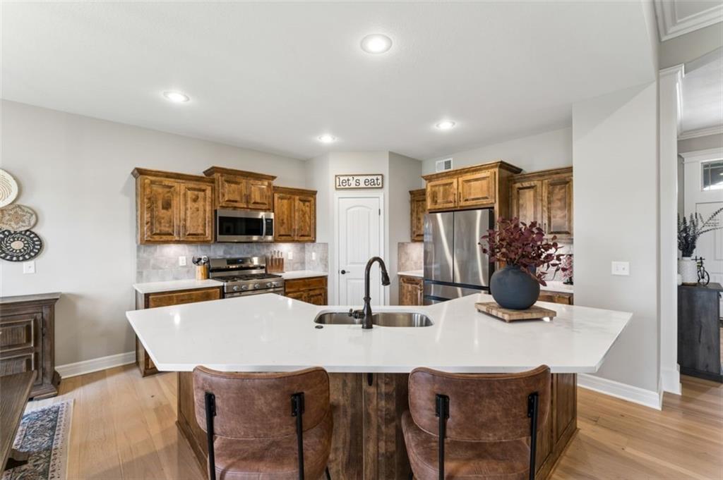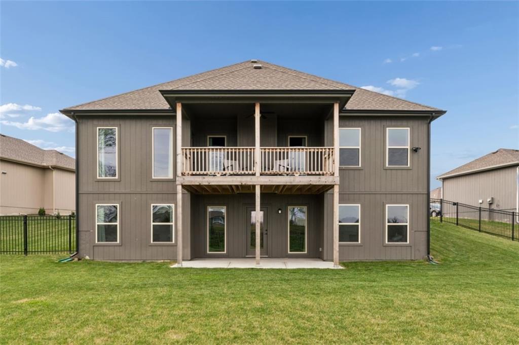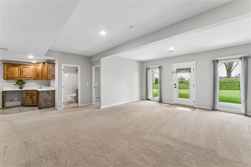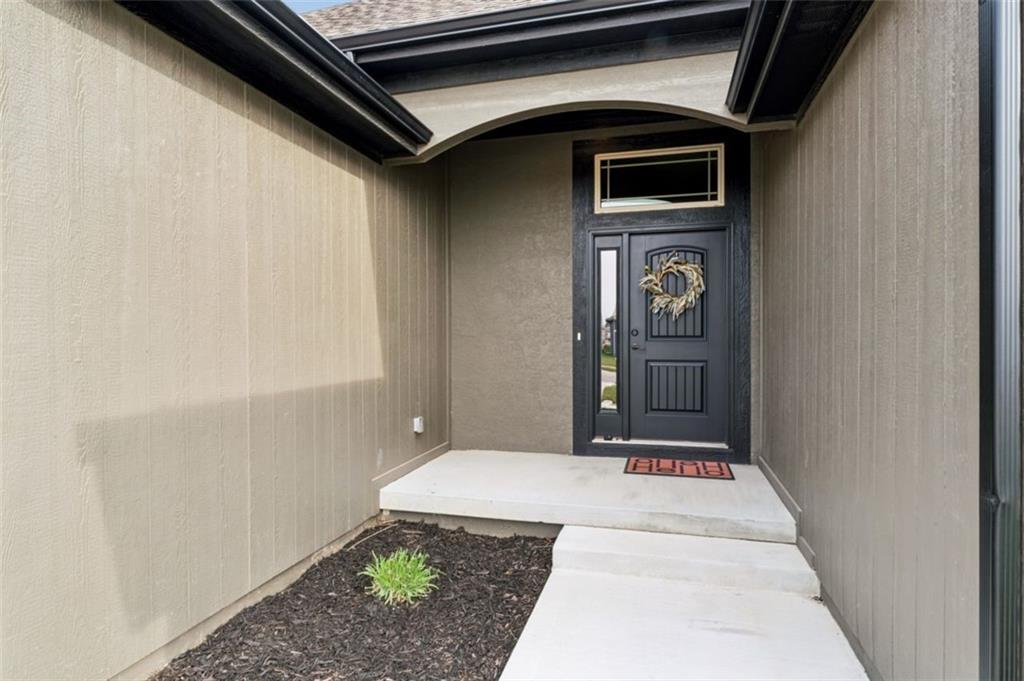Welcome to "The Fairway" by Hoffmann Custom Homes, nestled in the highly desirable Waterford subdivision! Built in 2024, this beautifully designed reverse ranch offers 4 bedrooms and 3 full baths with comfortable, modern living. Step inside to an open main floor with soaring vaulted ceilings, a warm and inviting great room with a zero clearance gas fireplace, and a stylish kitchen featuring a spacious island, pantry, stained cabinetry, and stainless steel appliances, perfect for both everyday living and entertaining. The main level primary suite provides a relaxing retreat with a walk in closet, and you will appreciate the convenience of main floor laundry. Downstairs, the finished walk out basement offers additional living space along with a wet bar, making it ideal for hosting or unwinding. Enjoy peaceful outdoor moments on the covered deck or patio, and take advantage of the 3 car garage and in ground sprinkler system for added ease. Located in the North Kansas City School District and part of a community with a pool included in the HOA, this home truly has it all. Come see what makes this one so special!