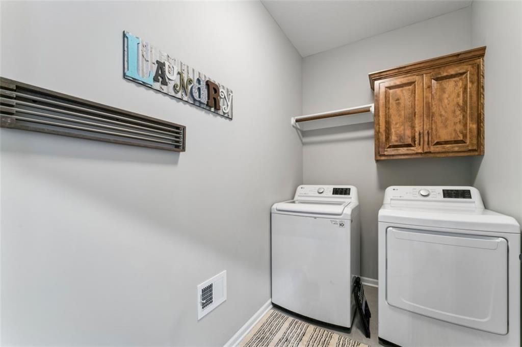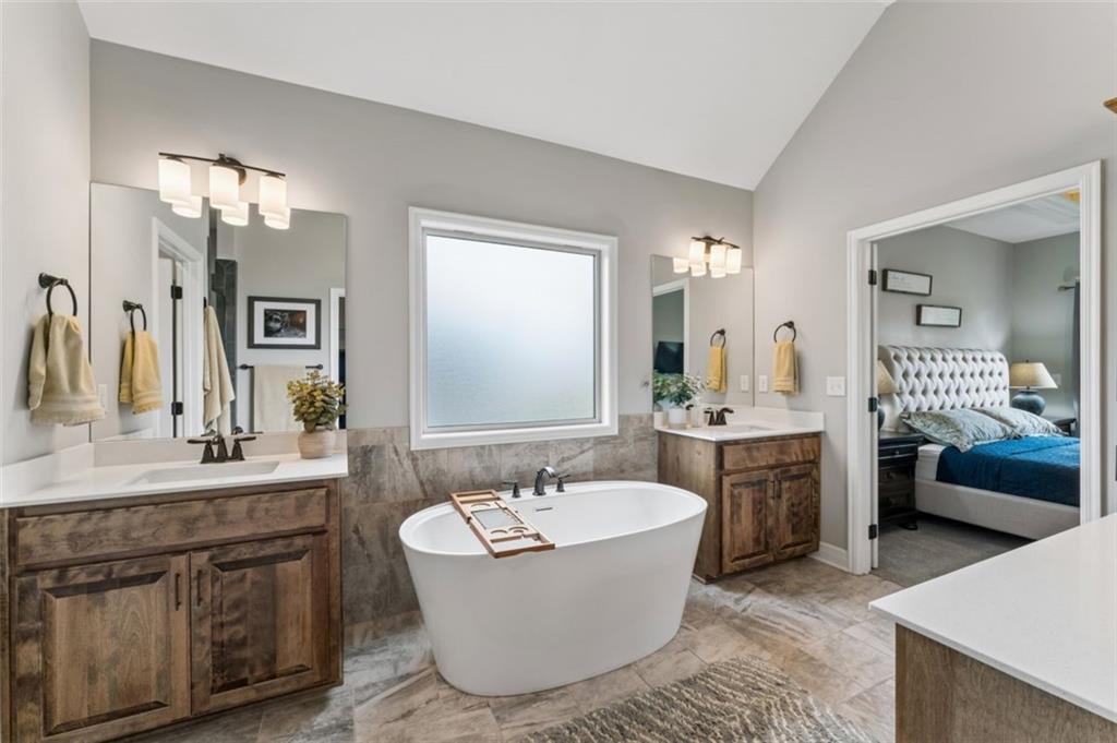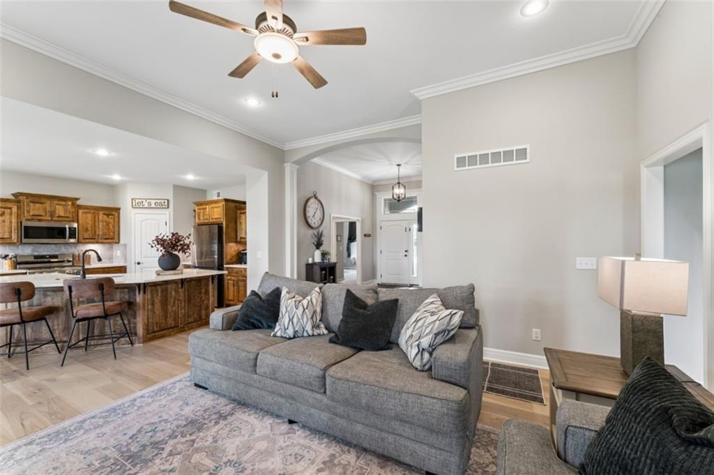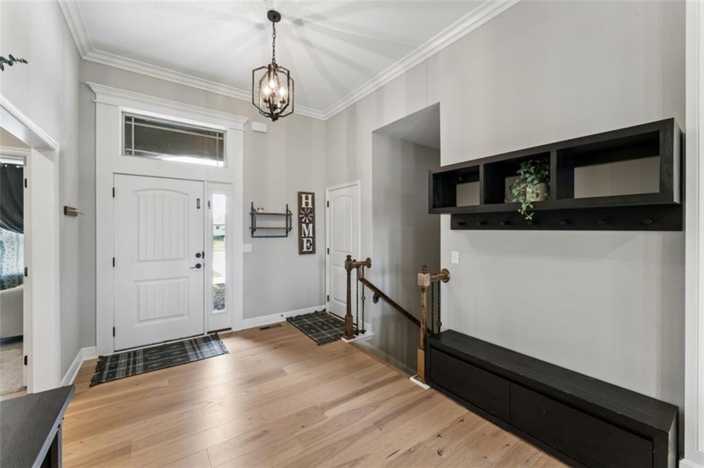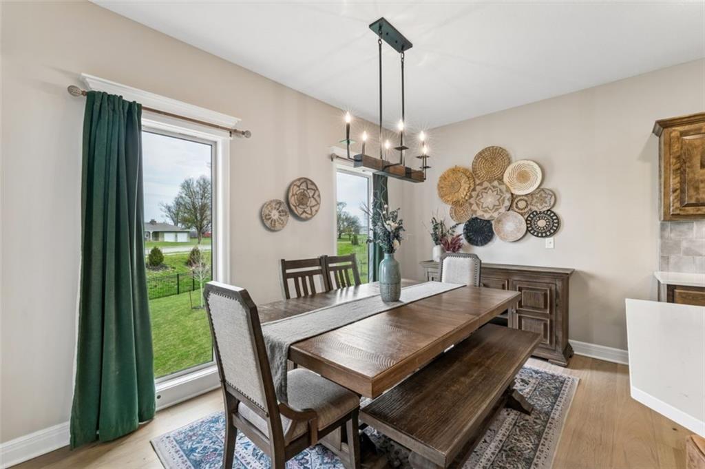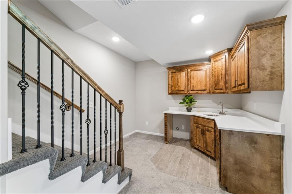 Welcome to "The Fairway" by Hoffmann Custom Homes, nestled in the highly desirable Waterford subdivision! Built in 2024, this beautifully designed reverse ranch offers 4 bedrooms and 3 full baths with comfortable, modern living. Step inside to an open main floor with soaring vaulted ceilings, a warm and inviting great room with a zero clearance gas fireplace, and a stylish kitchen featuring a spacious island, pantry, stained cabinetry, and stainless steel appliances, perfect for both everyday living and entertaining. The main level primary suite provides a relaxing retreat with a walk in closet, and you will appreciate the convenience of main floor laundry. Downstairs, the finished walk out basement offers additional living space along with a wet bar, making it ideal for hosting or unwinding. Enjoy peaceful outdoor moments on the covered deck or patio, and take advantage of the 3 car garage and in ground sprinkler system for added ease. Located in the North Kansas City School District and part of a community with a pool included in the HOA, this home truly has it all. Come see what makes this one so special!