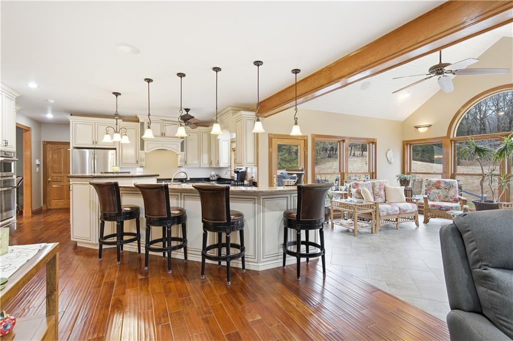 Welcome to your Dream Retreat in Columbia, Missouri! Nestled on 26 breathtaking acres, this one-of-a-kind property offers the perfect balance of luxury living and outdoor recreation. The land features a stocked private lake complete w/ islands and bridges, creating a stunning centerpiece that feels like your own private resort. Property is loaded w/ deer and turkey, making it an exceptional retreat for wildlife lovers and outdoor enthusiasts. The 7,500 sq ft custom home has been meticulously cared for and is filled w/ high-end features throughout. From the granite entryway, you’ll appreciate the craftsmanship and attention to detail, including hand-scraped teak floors, a stunning curved staircase, and 2 fireplaces. The home offers 4 spacious bedrooms and 5 bathrooms, along with a quiet study, large office space, abundant storage, and an attached three-car garage. The fantastic kitchen is built for both everyday living and entertaining, featuring a Wolf gas stove, high-end appliances, a hidden pantry, and generous storage space throughout. Just off the main living area, the sunroom provides the perfect place to relax and watch the wildlife, overlooking the incredible scenery this property has to offer. The luxurious master suite includes a spa-like bathroom equipped with heated floors, TV, coffee maker, and refrigerator, as well as a large walk in closet. The finished basement is designed for entertaining, featuring a spacious entertainment area along with a bar and small kitchen, making it the ideal place to host guests, watch the big game, or unwind after a long day. Outside, the property also includes a large two-story outbuilding with potential living quarters, providing endless possibilities for guests, a workshop, or additional storage. This rare 26 +/- acre estate truly offers the best of both worlds - a private retreat with incredible scenery, wildlife, and recreation located just 7 miles from downtown Columbia. Opportunities like this are incredibly rare!