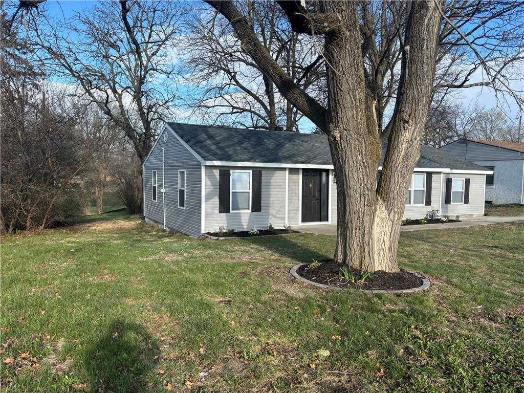 Single story home featuring a front yard and roof with shingles