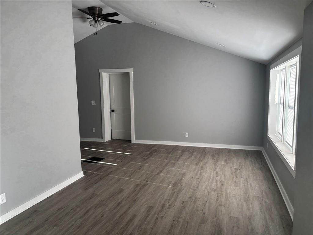 Empty room with vaulted ceiling and dark wood-type flooring