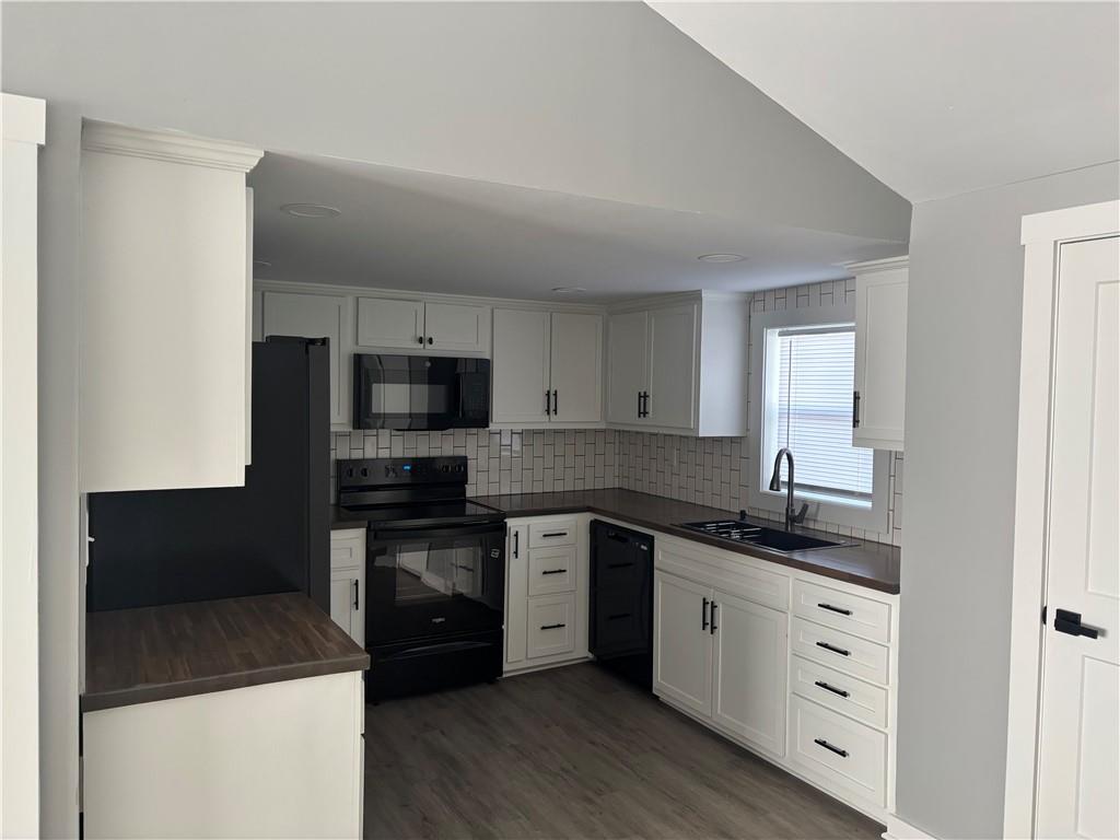 Kitchen featuring black appliances, white cabinetry, dark wood-type flooring, and lofted ceiling