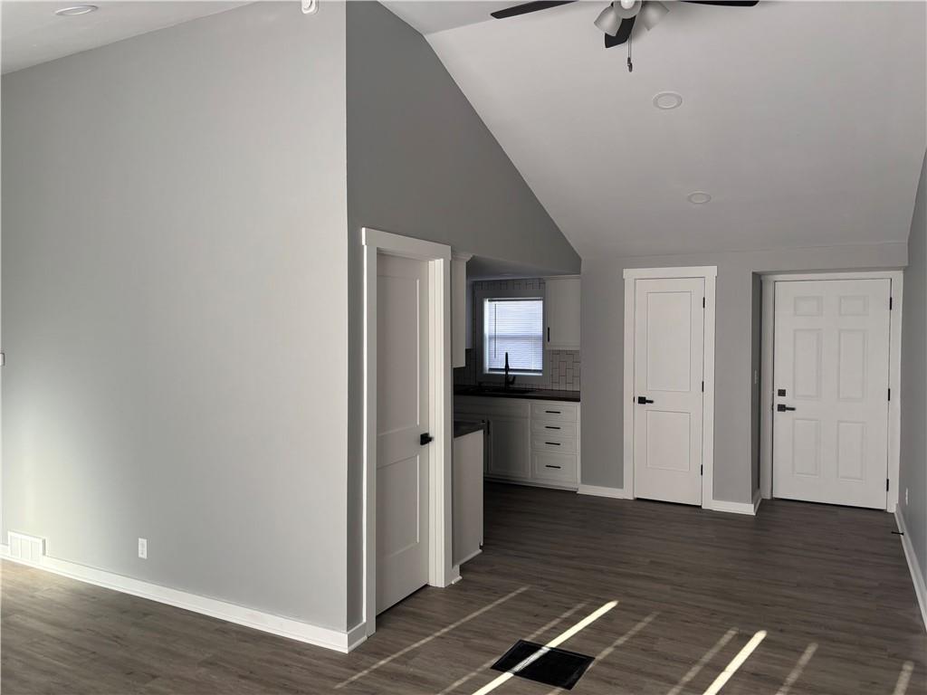 Additional living space featuring vaulted ceiling, ceiling fan, and dark wood-type flooring