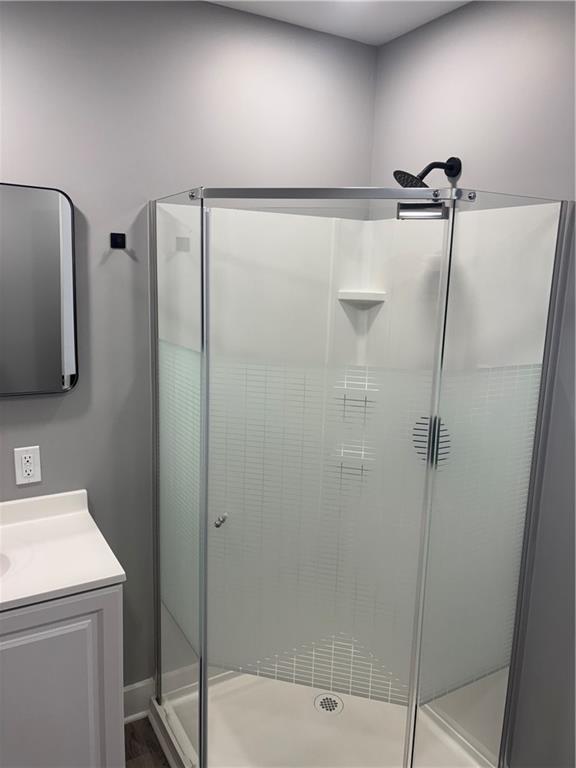 Full bathroom featuring vanity and a stall shower