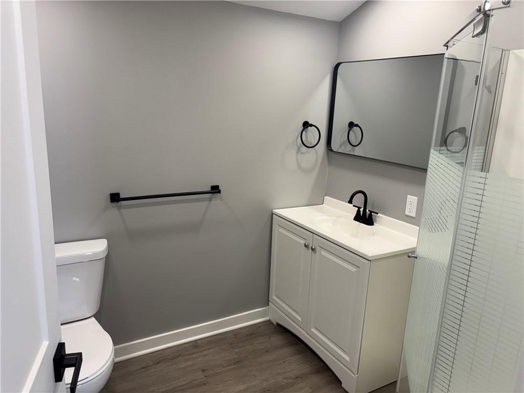 Full bathroom with vanity, dark wood-type flooring, and a shower stall