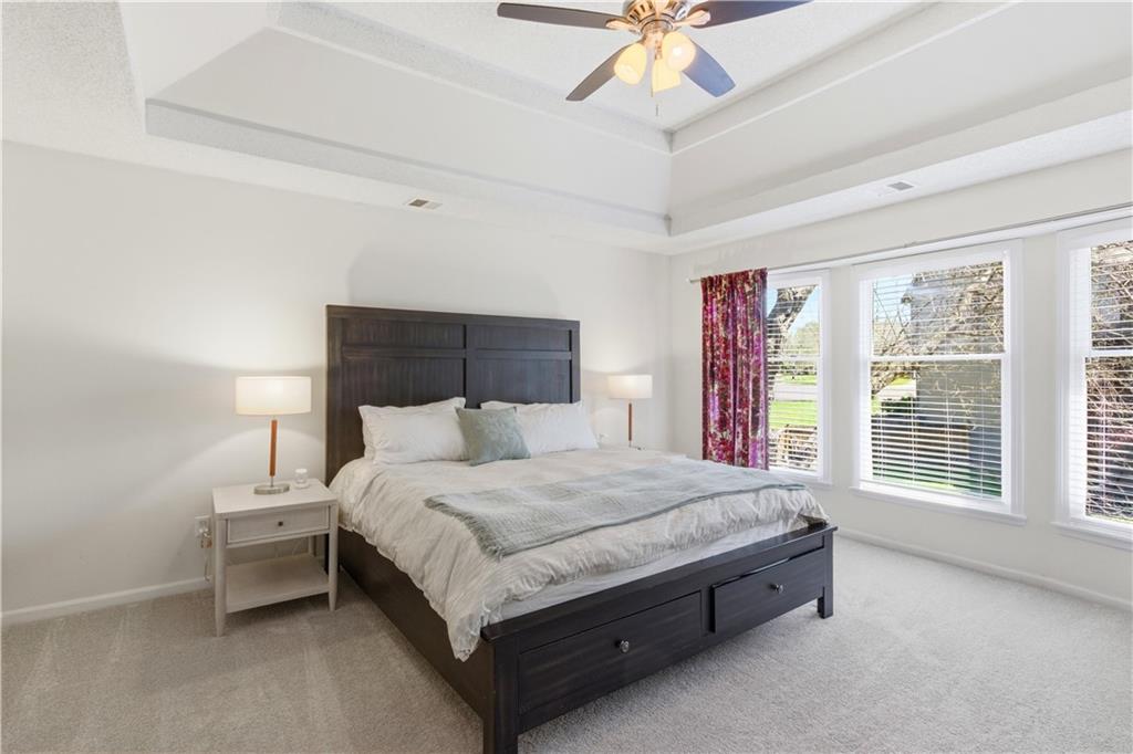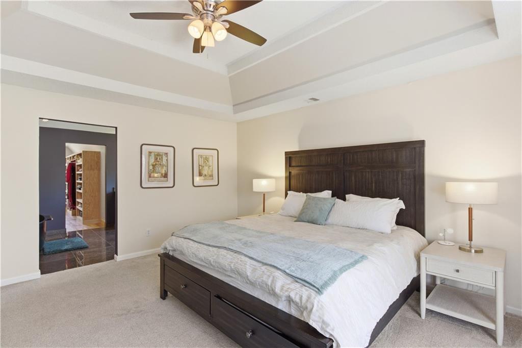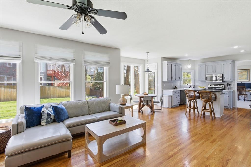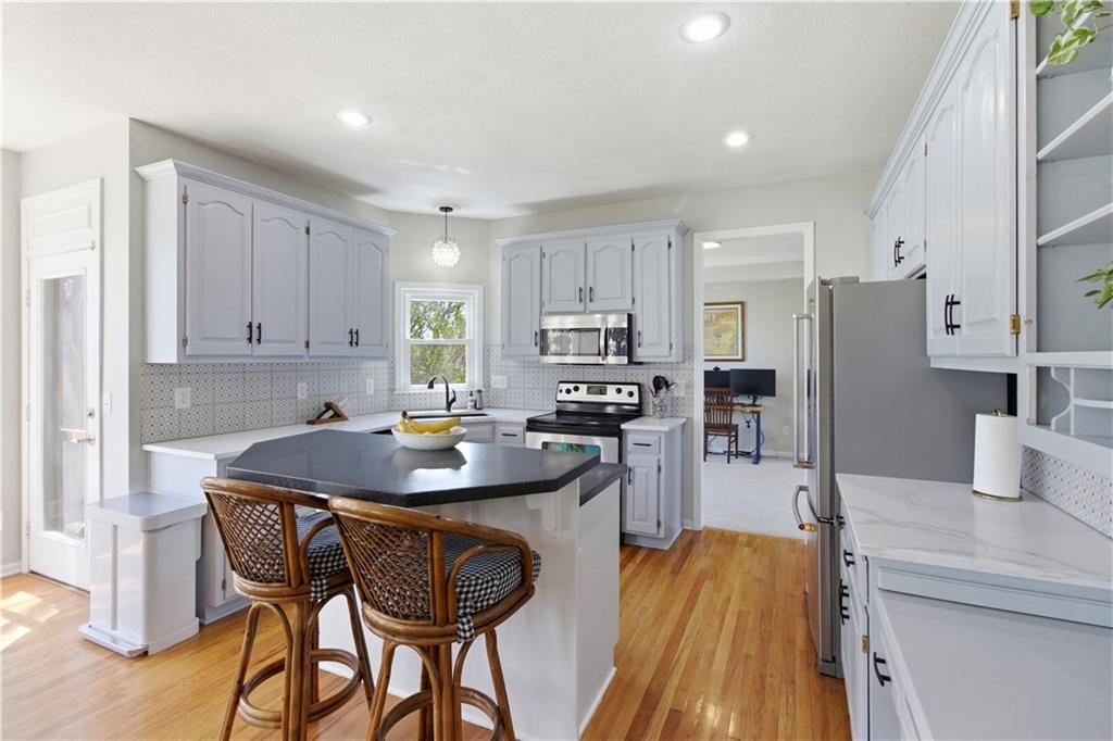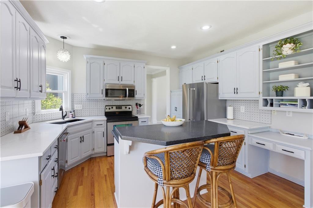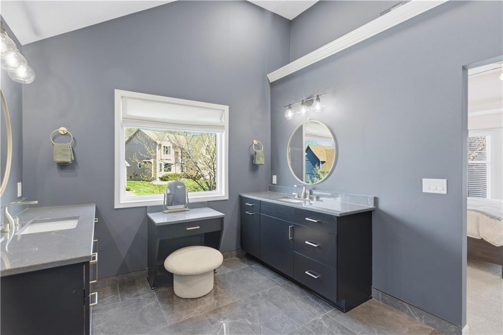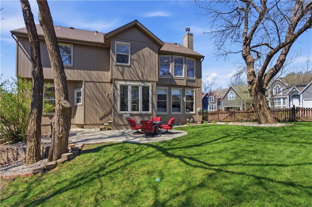 Stunning formal front living & dining room flows to light & bright great room/kitchen combo with floor to ceiling windows. Kitchen features stainless steel appliances, plenty of cabinets and counter space & island. NEW Fridge/Dishwasher. Great room overlooks lush, well manicured back yard. Half bath and laundry off main level and garage access. NEW Washer/dryer combo. The grand staircase leads you to the second floor bedroom level. Good sized rooms all with attached baths. Guest room off the front and bedrooms 2/3 with jack and jill style bath. AMAZING primary suite with large bedroom and leads to gorgeously renovated modern bathroom. Get ready in the mornings in style! HUGE walk in closet with beautiful built-ins. Sleek finished basement has many possibilities: office space, media room, play room. Half bath down here as well. Newer AC! Shaded fenced backyard with large patio. Neighborhood pool! Located in the award winning Olathe School District and so much more!