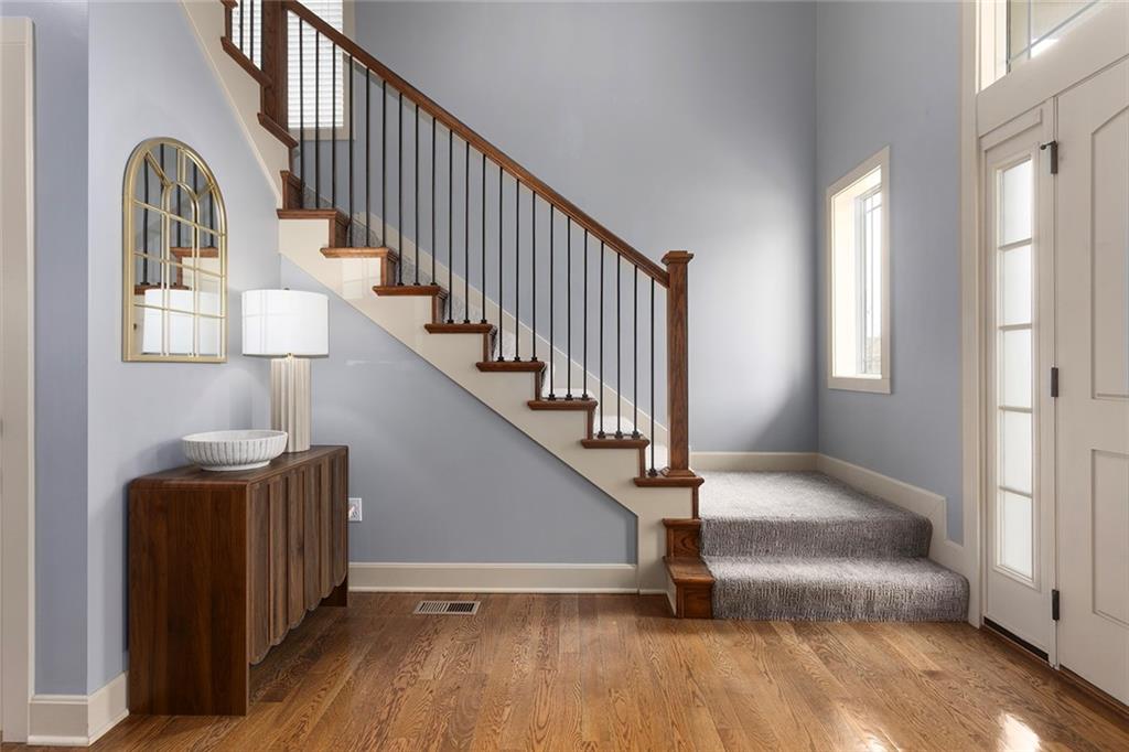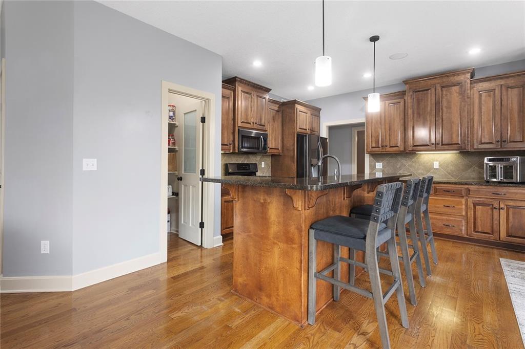 Welcome to this spacious and beautifully appointed two-story home in desirable South Olathe! Offering 5 bedrooms and 3.5 bathrooms, this home combines comfort, functionality, and scenic surroundings. The main level features stunning hard oak wood flooring and an abundance of large windows that fill the space with natural light while showcasing peaceful views of the wooded greenspace behind the home. The inviting living room centers around a cozy fireplace and flows seamlessly into the adjacent kitchen—perfect for both everyday living and entertaining. The kitchen is thoughtfully designed with beautiful cabinetry, granite countertops, and a convenient walk-in pantry. Just off the kitchen, you’ll find a dedicated laundry area for added ease and efficiency. A formal dining room sits at the front of the home, offering a more traditional space for gatherings and special occasions, complete with comfortable carpeting. Upstairs, the bedrooms feature plush carpeting and spacious bathrooms, creating comfortable retreats for family and guests alike. You’re sure to love the finished walkout basement, complete with a 5th bedroom, full bath, and a convenient kitchenette. This space lives like separate quarters—ideal for guests, extended stays, or multi-generational living—and opens directly to the patio, with a composite deck above for even more outdoor enjoyment. Step outside to enjoy the backyard firepit, perfect for relaxing evenings under the stars. Additional upgrades include whole-home sound wiring and programmable exterior holiday lighting for year-round convenience and charm. Don’t miss this opportunity to own a beautiful home on a well-kept lot in a sought-after location!