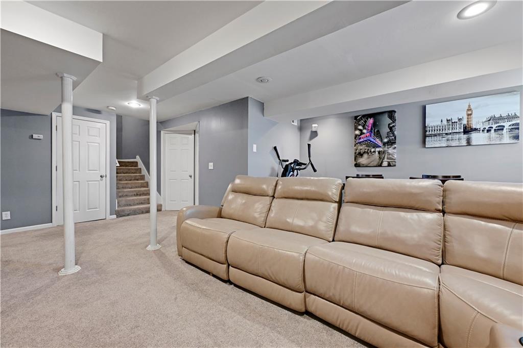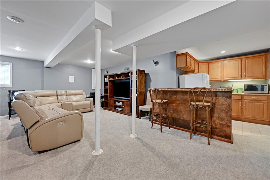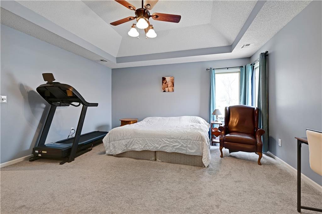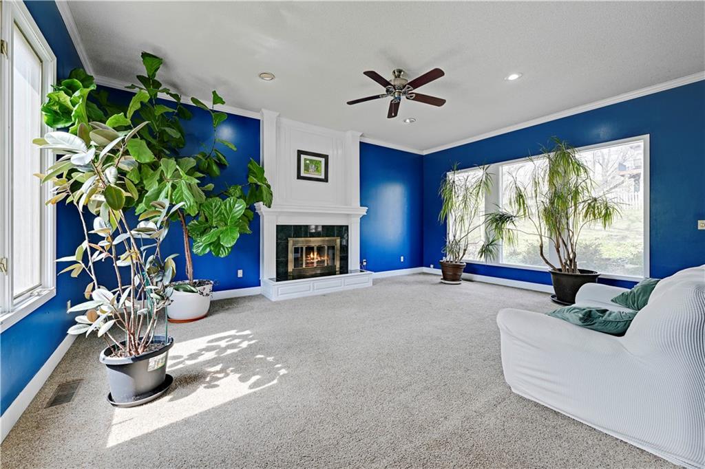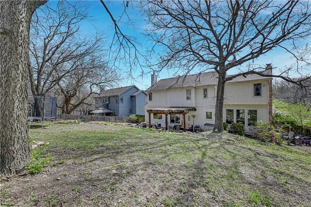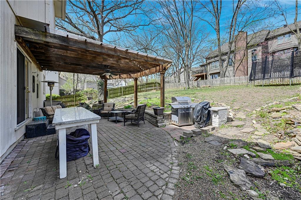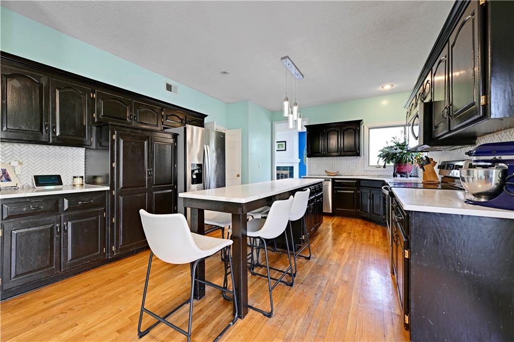 This spacious 4 bedroom, 3.1 bath home in Lenexa is ready for its next owner! Upon entry, you are welcomed by hardwood floors, a formal dining room, and a striking staircase that sets the tone for the space throughout. Just off the entry, the large front living room offers soaring ceilings, abundant natural light, and a beautiful fireplace with dramatic molding detail. Head into the kitchen and hearth room, where you will find painted cabinetry, quartz countertops, updated backsplash, stainless steel appliances, a large island with seating, and a second fireplace that creates a warm and inviting gathering space. The main level also features a half bath and easy access to the covered patio and backyard. Upstairs, the home offers generous bedroom space, including a spacious primary suite and well-sized secondary bedrooms. Head to the finished lower level for even more room to spread out, complete with a large rec room, kitchenette/bar area, full bath, and flexible space for movies, games, workouts, guests, or hobbies. Enjoy the outdoors from the covered paver patio overlooking the fenced backyard with mature trees and plenty of room to relax or entertain. Other features you will love include the distinctive front elevation, multiple living areas, hardwood floors through much of the main level, and a layout that offers both everyday comfort and great entertaining space.