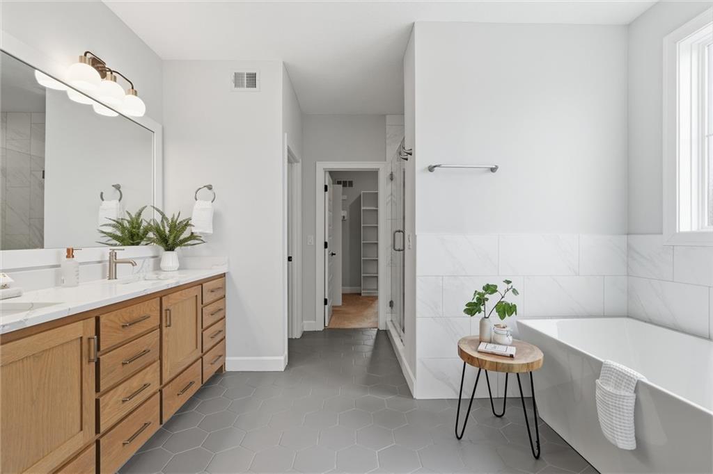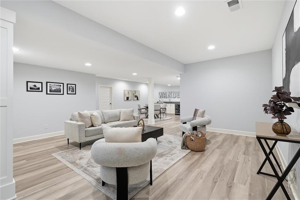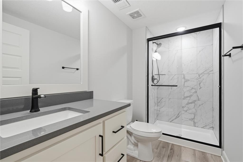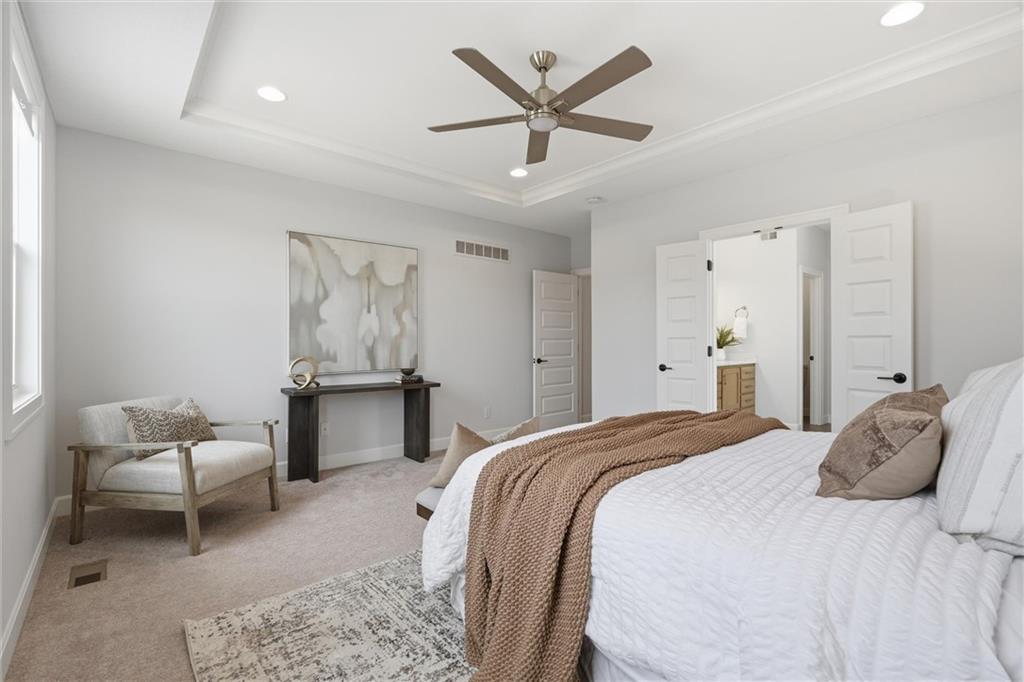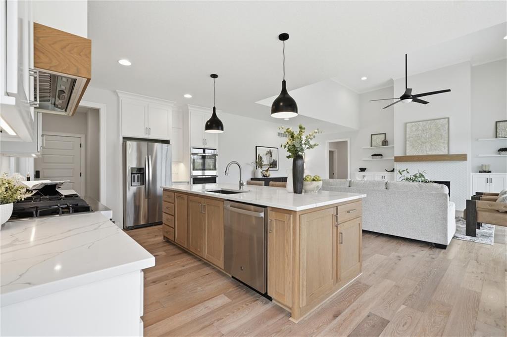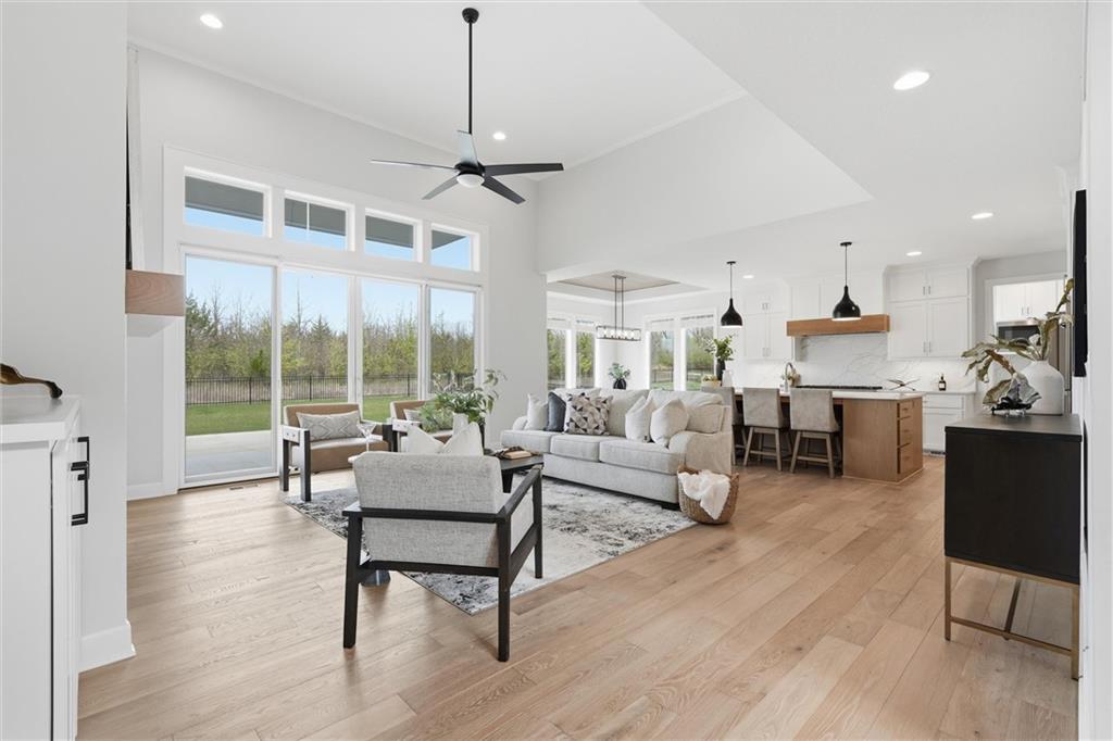 Meticulously maintained, like-new home that outshines new construction, offering a thoughtful open floor plan and seamless indoor-outdoor flow on a premium lot with a large private backyard and wooded views. The main level features a grand two-story entry, spacious living room, private office, and a gourmet kitchen with floor-to-ceiling white oak cabinetry and upgraded gas range. The main-level primary suite offers a spacious layout with convenient access to the laundry room. The upper level includes three generously sized bedrooms, each with walk-in closets and en suite baths. The finished lower level features a guest bedroom, full bath, wet bar, flex room/home gym, and ample storage. Enjoy abundant natural light throughout, along with beautiful sunset views from the backyard overlooking wooded green space. Move-in ready with convenient access to major commuting routes and located within the highly rated Blue Valley School District. Motivated sellers—come see this beautiful home and make an offer!
