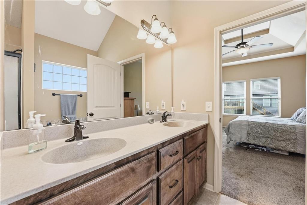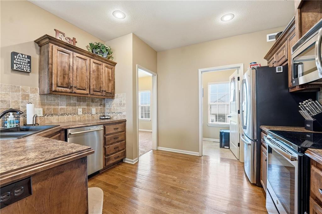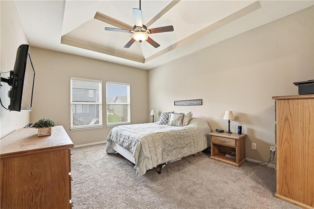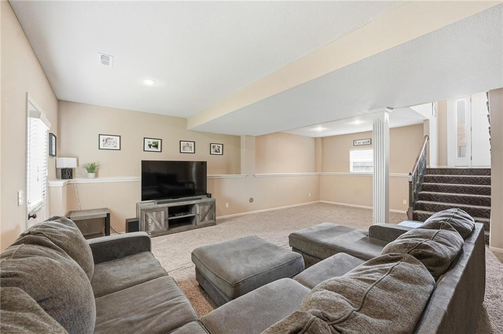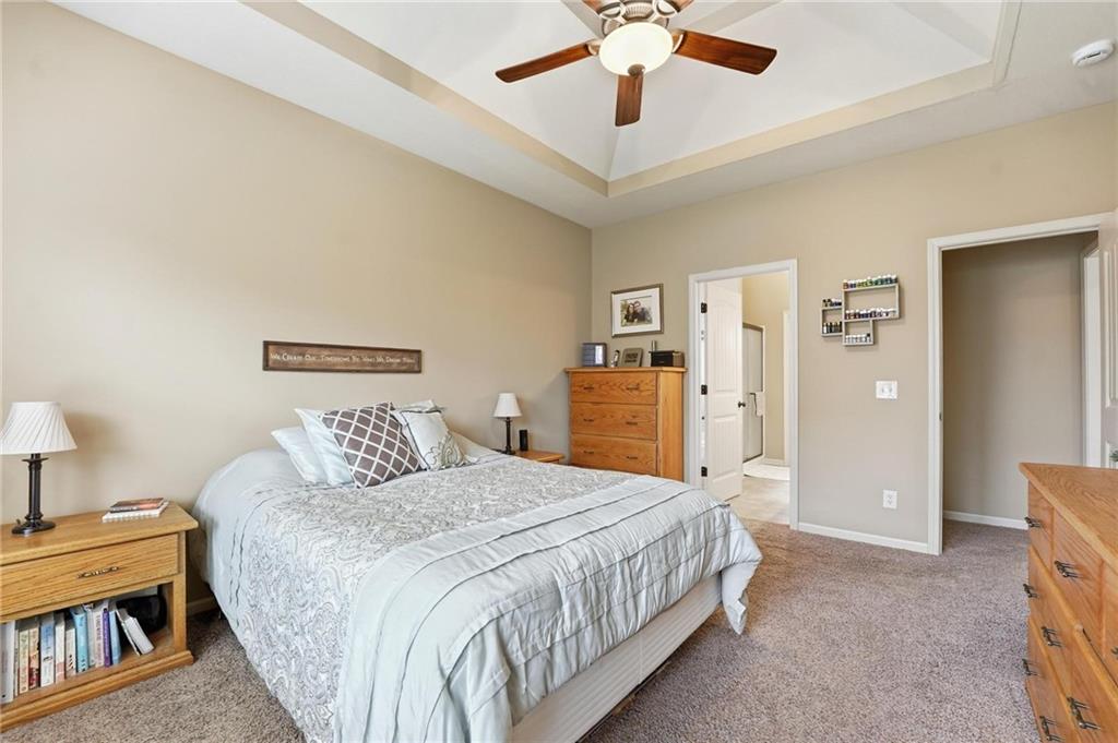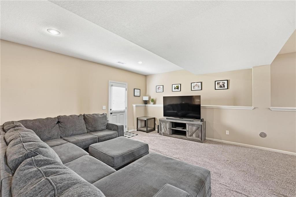Fresh interior & exterior paint April 2026! Exceptional home on a great lot with lush, green lawn. Level drive leads to oversized 2 car garage. Home is bright & open with welcoming entry, vaulted ceilings & open plan. This home offers a great flex space that is perfect for home office or formal dining room. Great Room has fireplace, extensive trim and is open to dining area with hardwood floor, that is open to the large kitchen! Primary suite is on one side of the home with large bedroom, walkin closet & private bath with tile floor, jetted tub, separate shower, double vanity! 2 additional bedrooms are on the opposite side of the home with great closet space & a hall bath with tub/shower. Lower level family room walks out to the fantastic backyard. 3rd FULL bathroom in lower level along with a 4th bedroom. Off main level is a fantastic covered deck with ceiling fan, steps down to the backyard.
