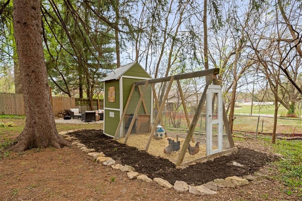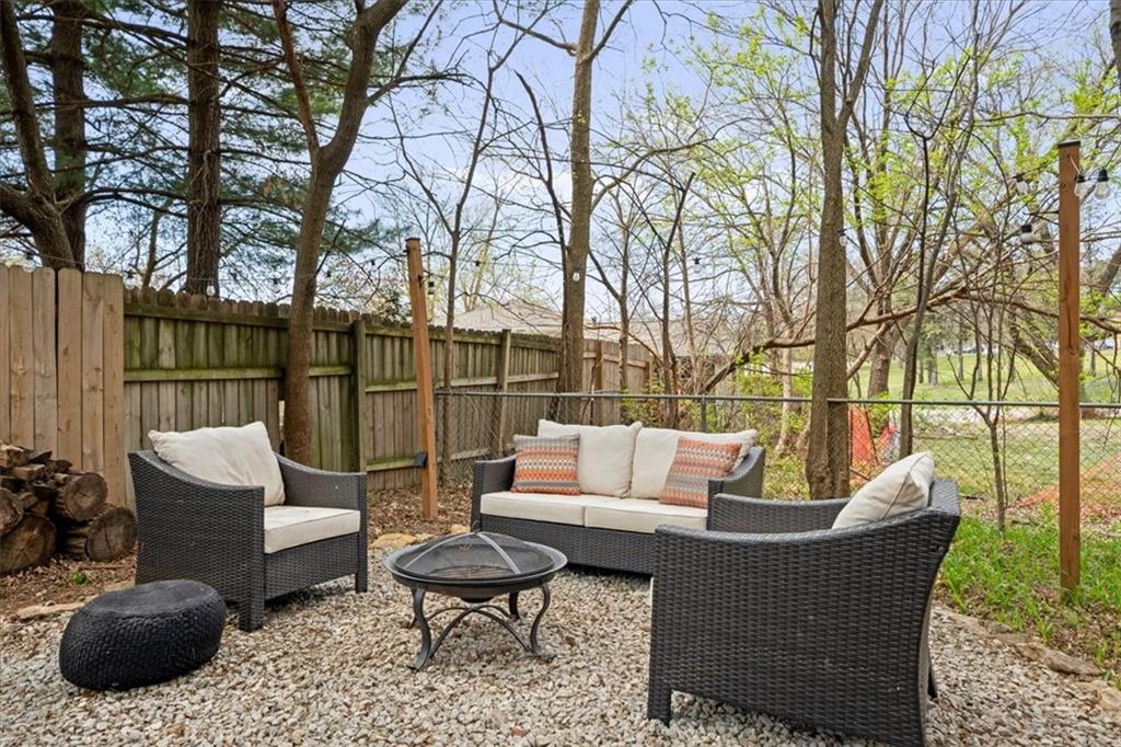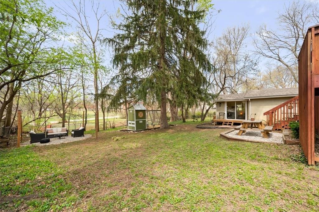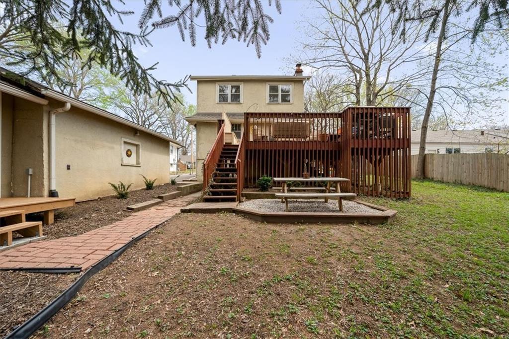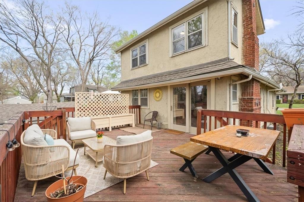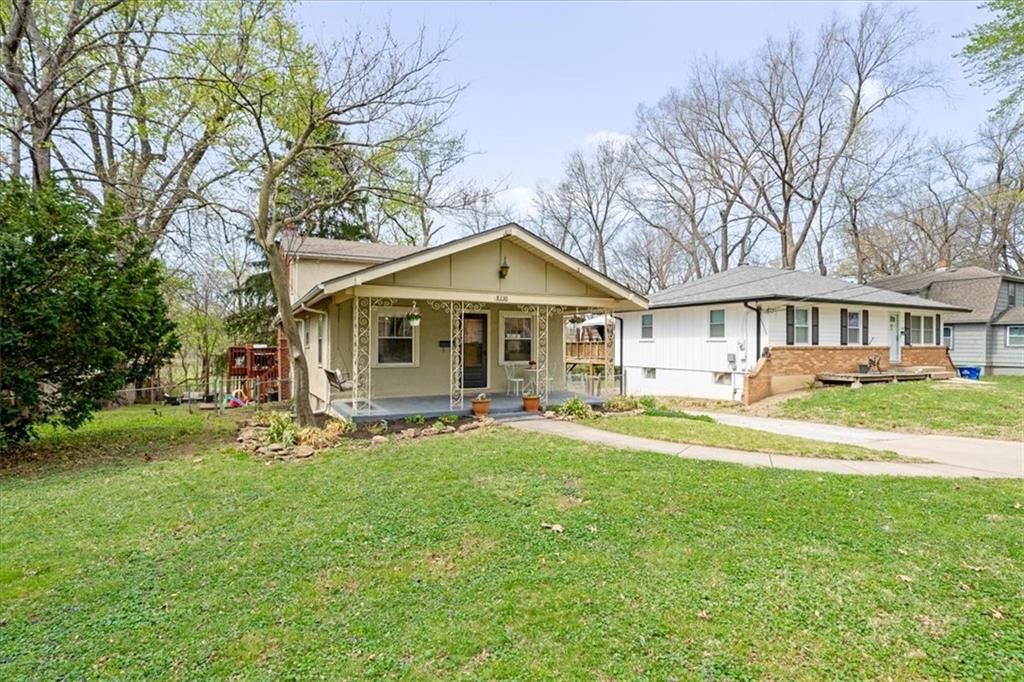 Tucked into a quiet Overland Park street, this beautifully styled bungalow blends original character with thoughtful updates and everyday livability, all just minutes from downtown Overland Park’s shops, restaurants, and the brand-new farmers market opening this summer. The inviting front porch sets the tone, while inside hardwood floors and natural light carry throughout the main living areas. The dining room flows into a comfortable living space with exposed beams, fireplace, and a built-in window seat that adds both charm and function. The kitchen offers solid wood cabinetry, updated appliances, and a practical layout with room to personalize over time. The home features three bedrooms, including two on the main level and a spacious upper-level retreat. One main-level bedroom sits behind glass French doors, offering flexibility to use as a bedroom, office, or additional living space. Major mechanical updates include a newer furnace and water heater. Out back is where this property truly stands out. A large elevated deck overlooks a deep, tree-lined yard with multiple areas for entertaining, relaxing, and enjoying the peaceful setting. A finished and insulated studio just off the garage creates an ideal space for a home office or creative workspace. Full unfinished basement provides excellent storage and hobbies space. Located in the highly regarded Shawnee Mission school district with quick access to parks, shopping, dining, and major highways, this home offers a rare combination of character, flexibility, and location. Homes with this level of outdoor space and functional flexibility rarely come available at this price point. You'll have to act fast!